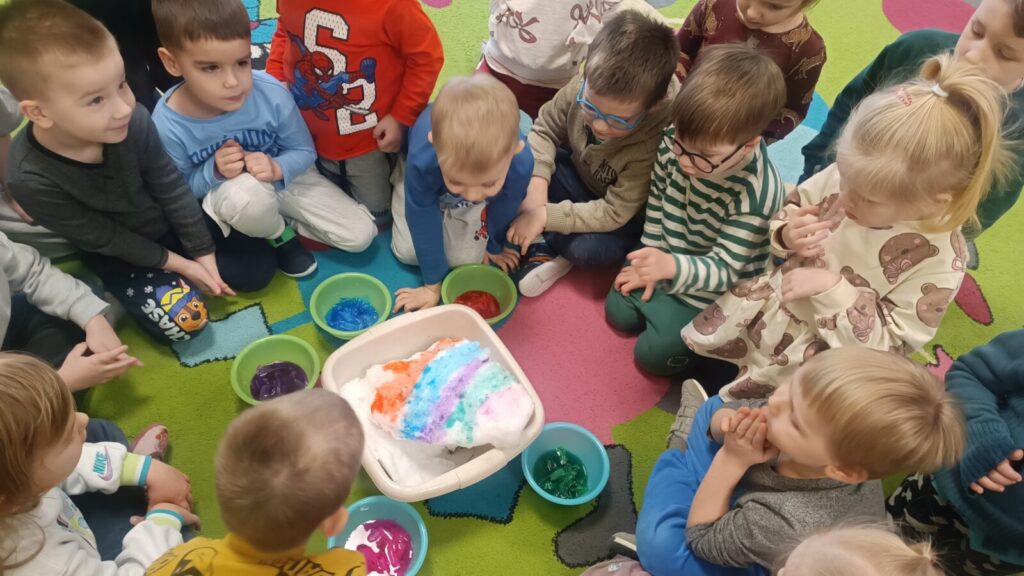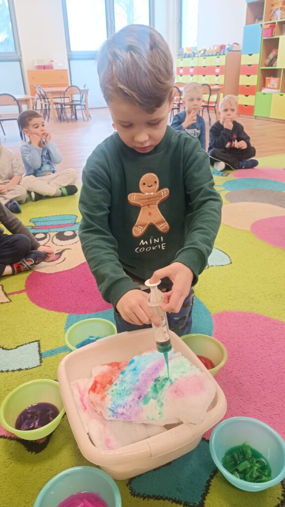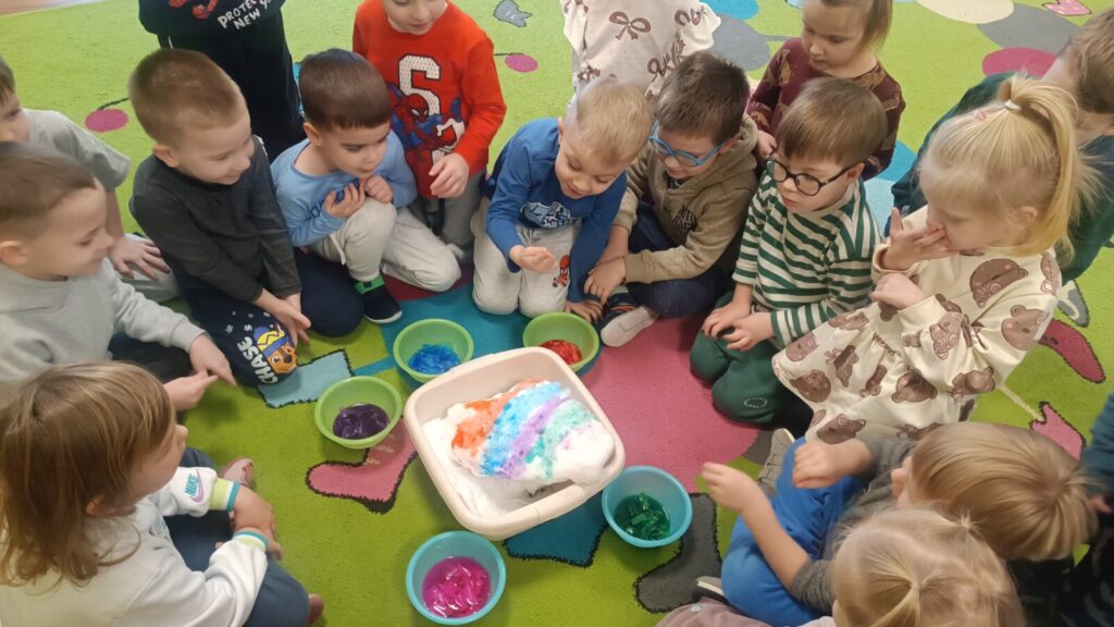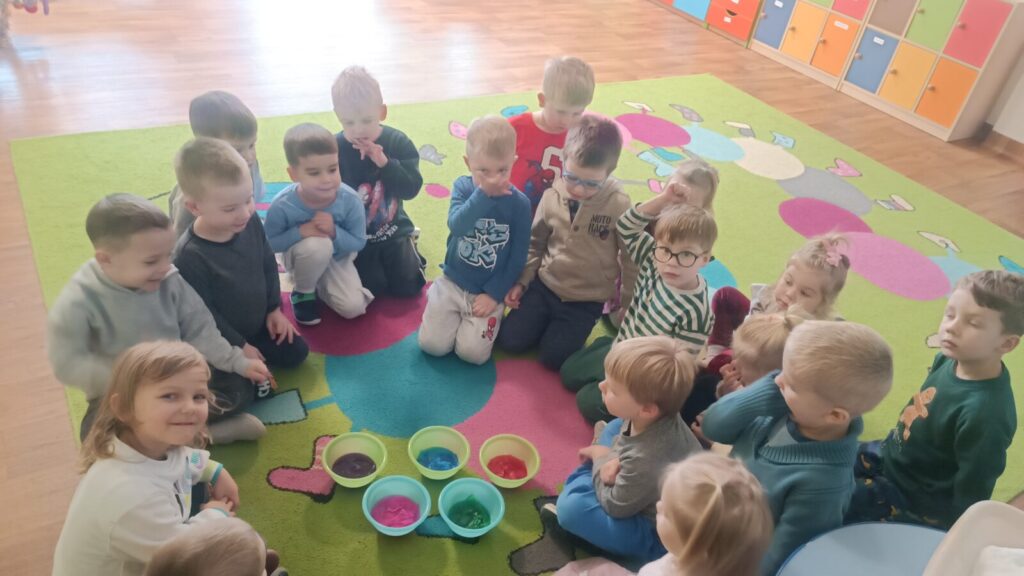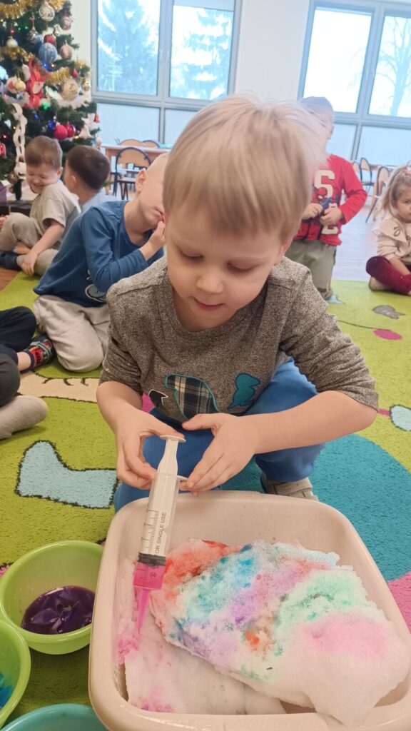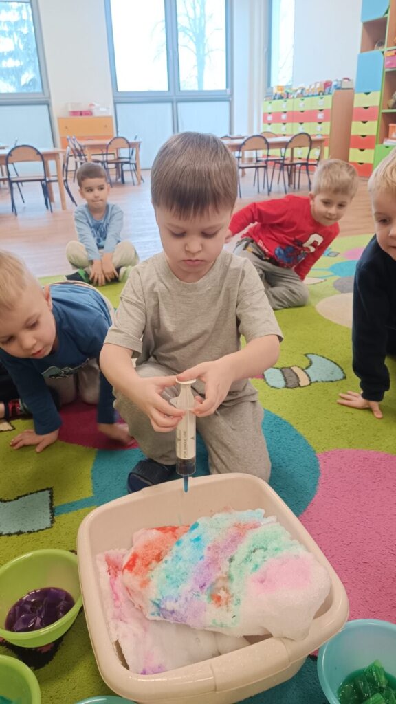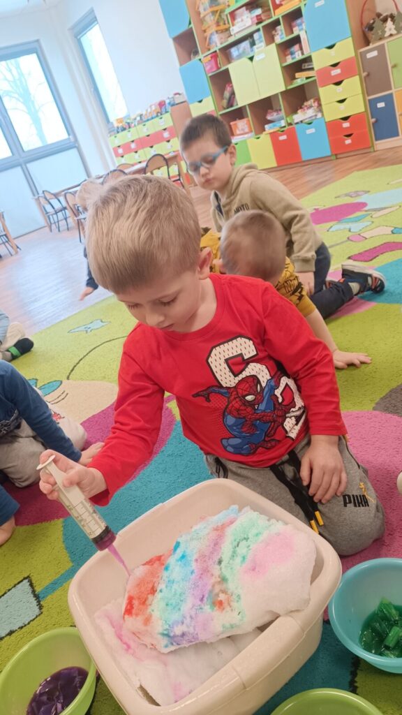 Tropiciele dzisiaj sprawdzały czy krepina zafarbuje wodę, później sprawdzaliśmy jak farbowana woda zmieni śnieg, a na koniec obserwowaliśmy roztopy śniegu.