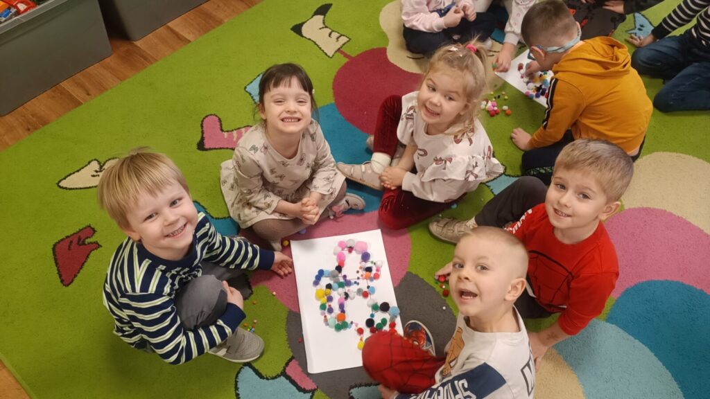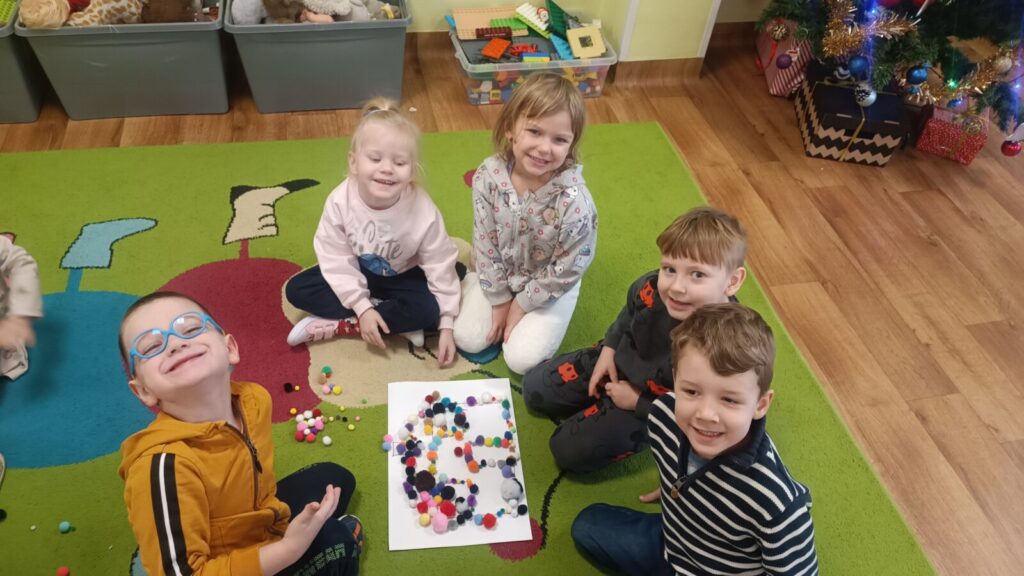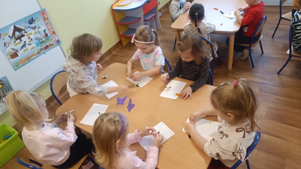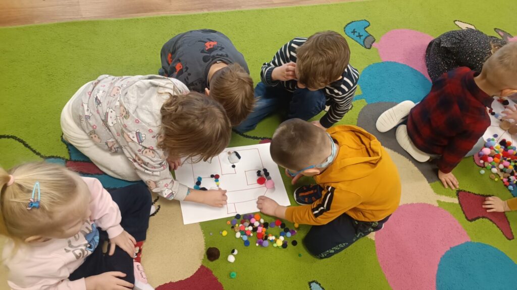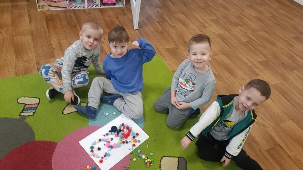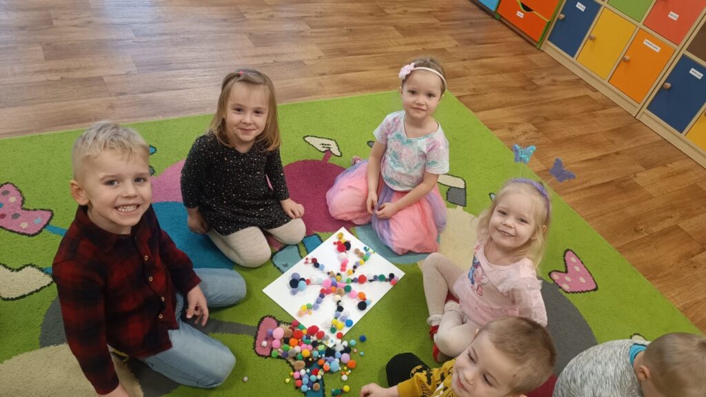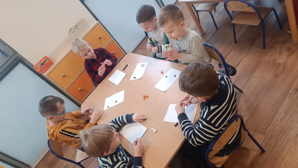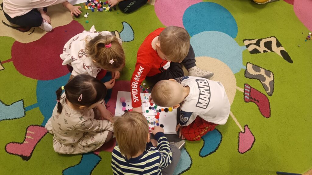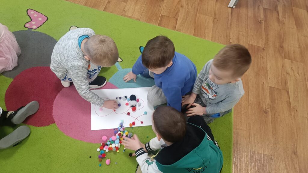 Dzieci ćwiczyły motorykę mała pracując w grupach i manipulując elementami, wyszły z tego piękne prace.