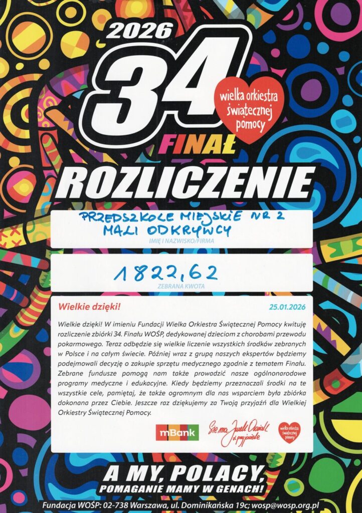 z radością informujemy, że Przedszkole Miejskie nr 2 „Mali Odkrywcy” w Markach włączyło się w 34 Finał Wielkiej Orkiestry Świątecznej Pomocy.