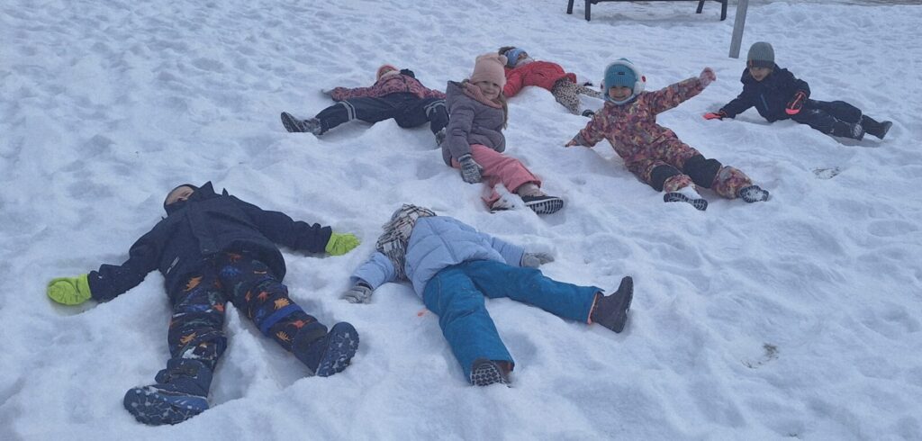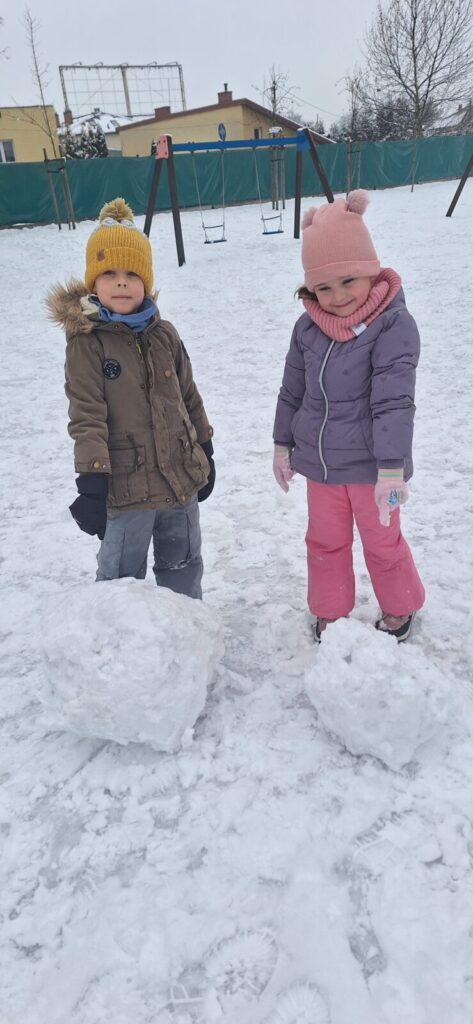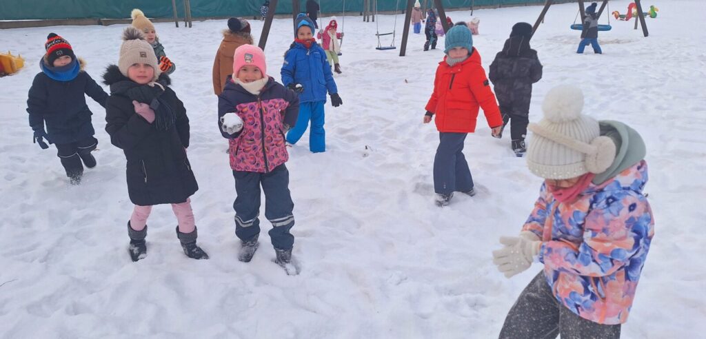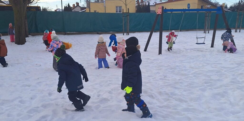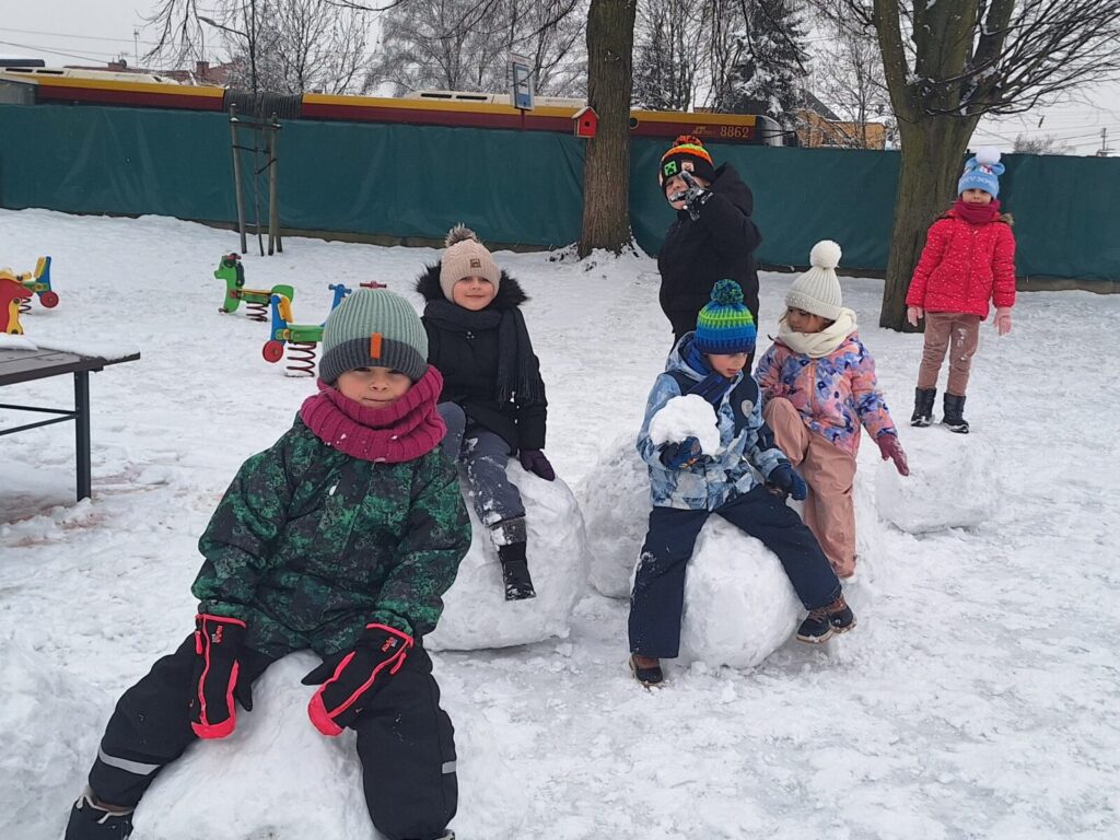 Zdjęcia przedstawiają dzieci w trakcie zabaw i obserwacji zimowej pogody w przedszkolnym ogrodzie. Podziwiały drzewa pokryte śnieżną kołdrą, ptaki, karmnik, sopelki zwisające z dachu przedszkola, lepiły bałwanka i śnieżynki. Było mroźnie, ale wesoło i radośnie.