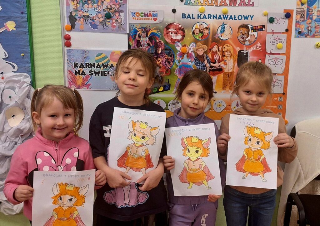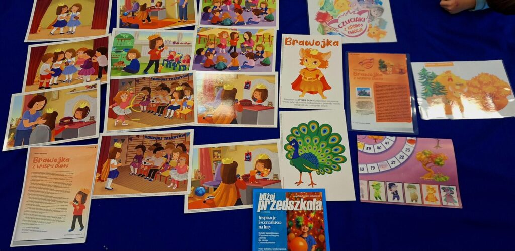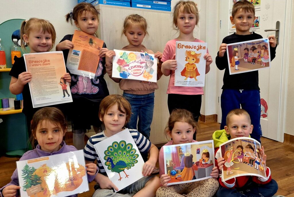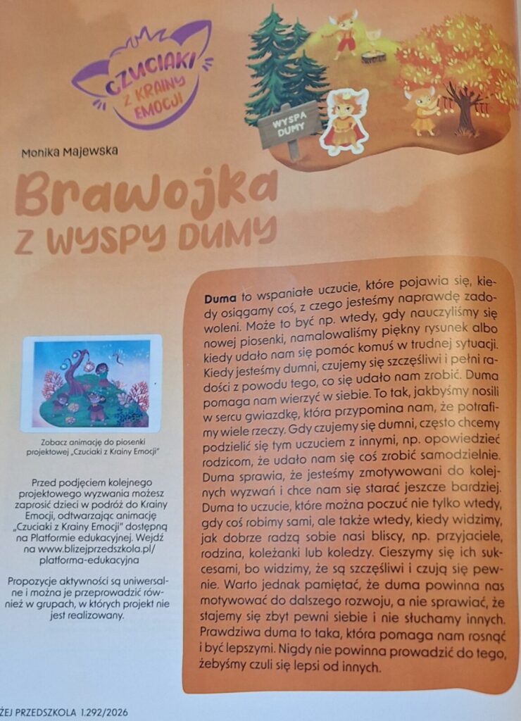 W ramach realizacji projektu ,,Czuciaki z Krainy Emocji” przedszkolaki poznały kolejną emocję- dumę, której wyjątkową bohaterką była Brawojka z Wyspy Dumy, koleżanka Pana Łał, Gniewka, Śmieszki, Markotka i całej czuciakowej ekipy. Brawojka nauczyła dzieci, że trzeba cieszyć się z własnych sukcesów i mówić o nich głośno. Pomogła zbudować pewność siebie i zauważyć swoje osiągnięcia- nawet te najmniejsze.