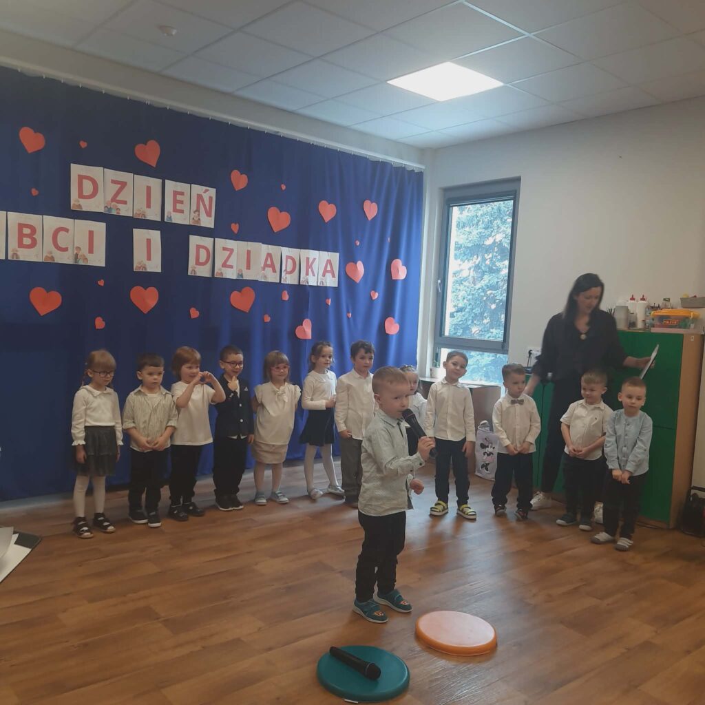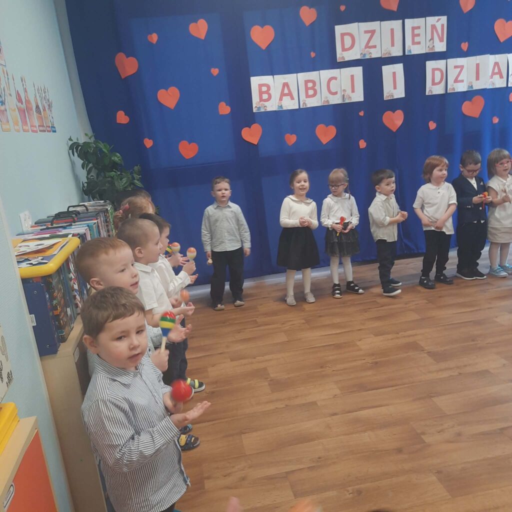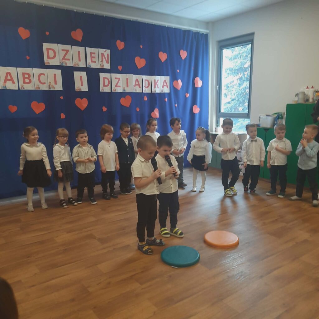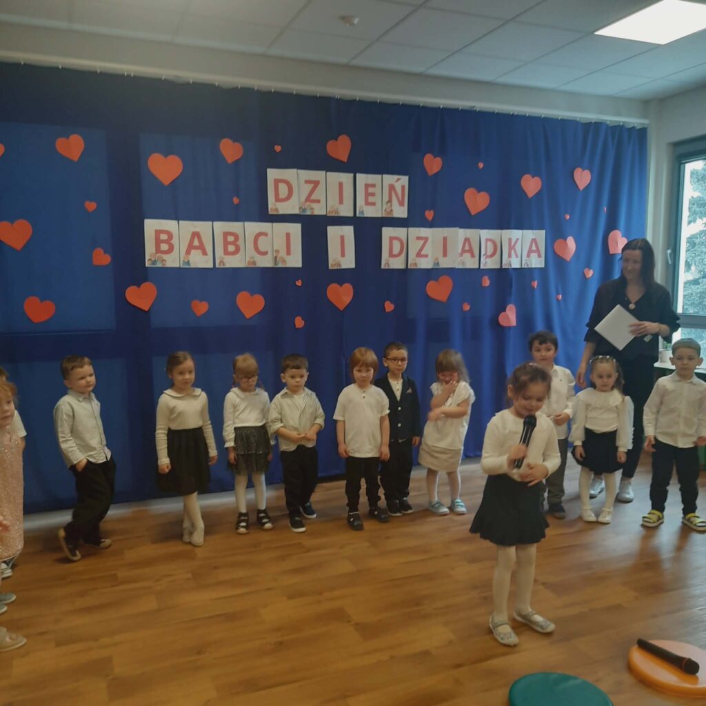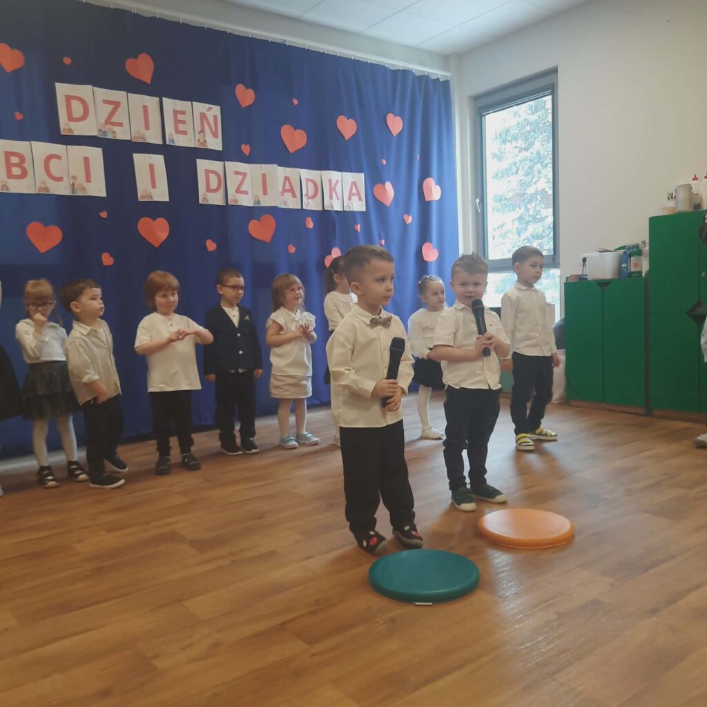 Dzień Babci i Dziadka 11 lutego 2026 przez przedszkole Galeria zdjęć przedstawia dzieci podczas przedstawienia z okazji Dnia Babci i Dziadka.