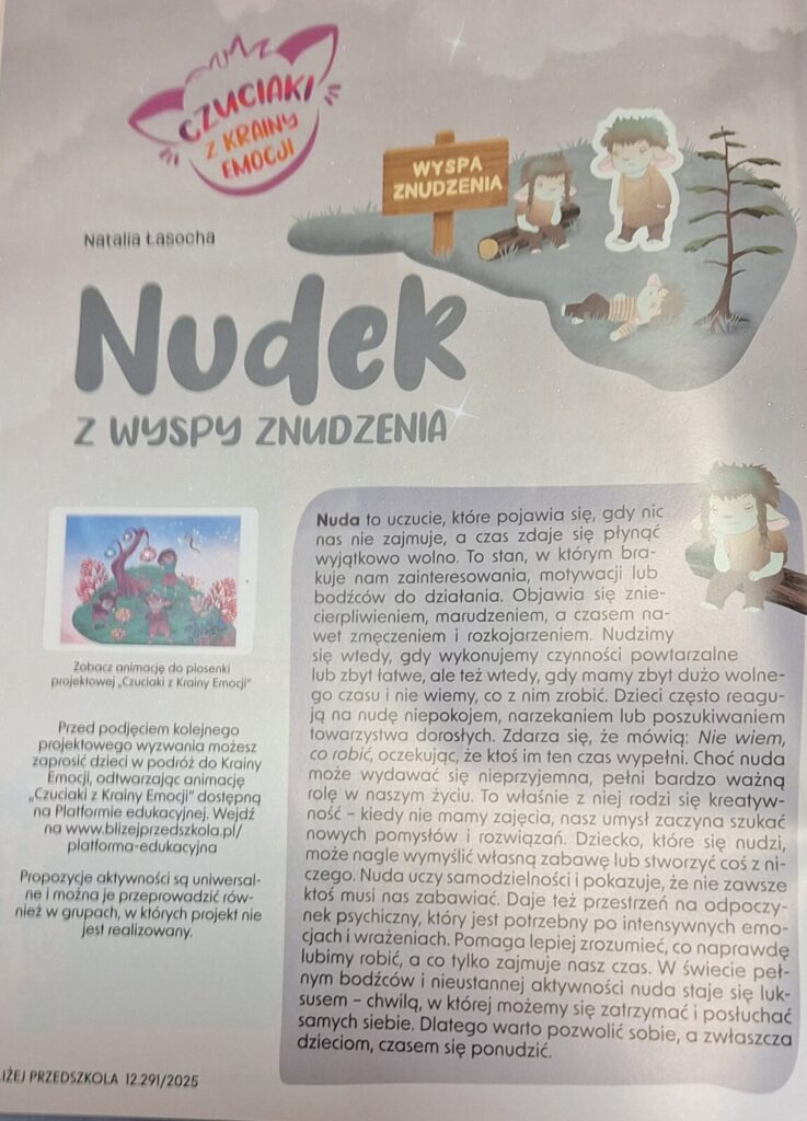 W ramach realizacji projektu ,,Czuciaki z Krainy Emocji” dzieci poznały kolejną emocję- znudzenie, której bohaterem jest Nudek z Wyspy Znudzenia. Wysłuchały opowiadania, pt. ,,Nudek z Wyspy Znudzenia, a następnie rozmawiały o jego treści. Przedszkolaki nauczyły się, że nuda nie musi być zła- to sygnał, że czas na coś nowego i może stać się początkiem świetnej zabawy wystarczy tylko pomysł i chęć do działania.