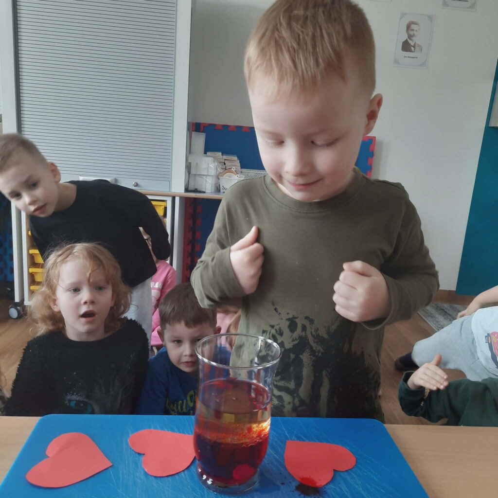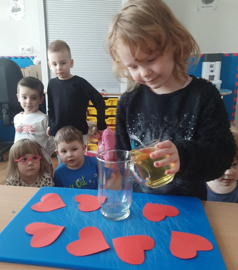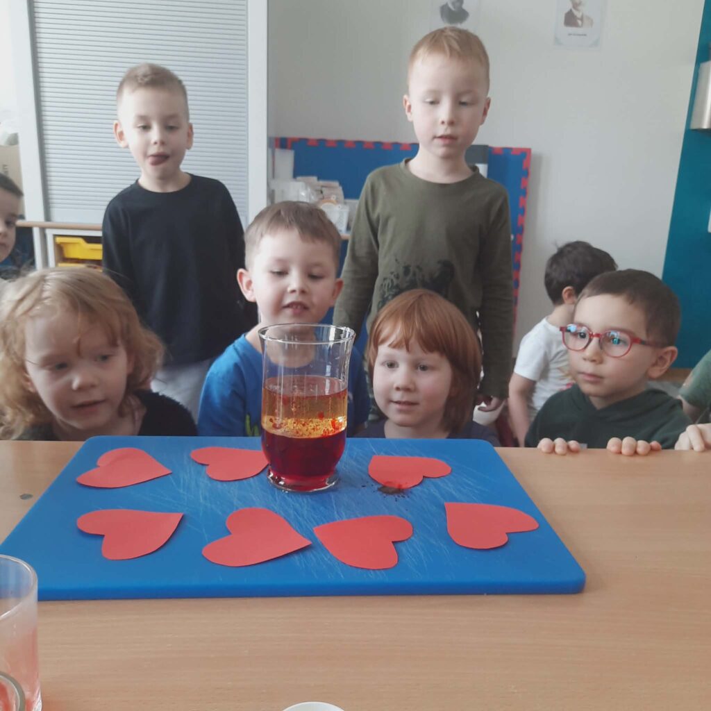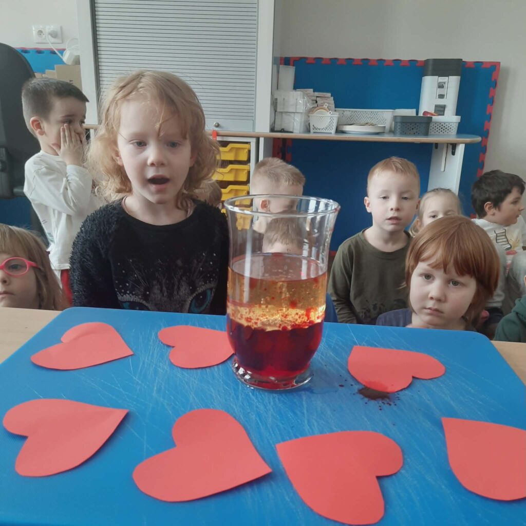Galeria zdjęć przedstawia dzieci podczas eksperymentu. Przedszkolaki obserwowały walentynkową „lawę” stworzoną z wody, barwnika, oleju i tabletki musującej.