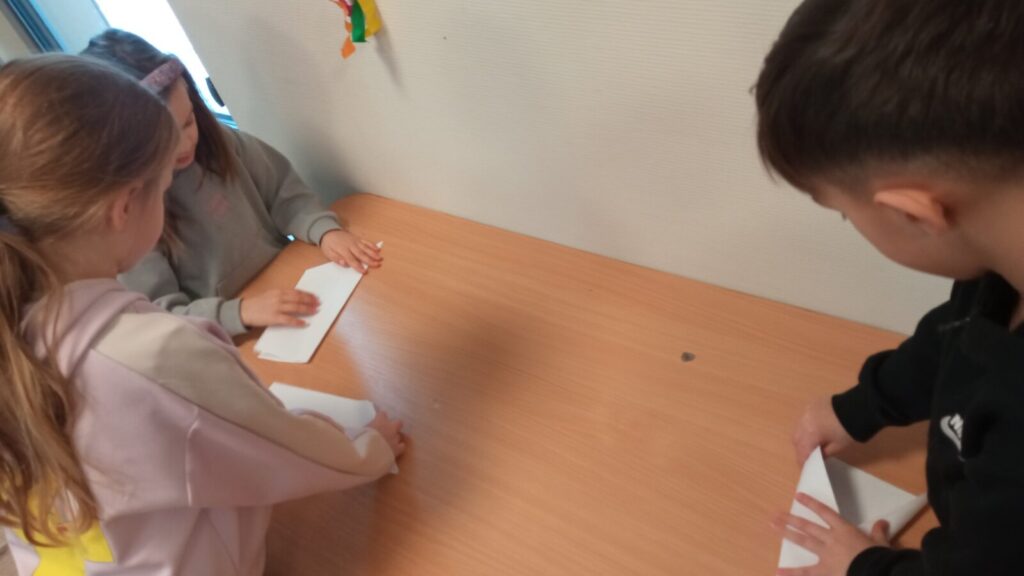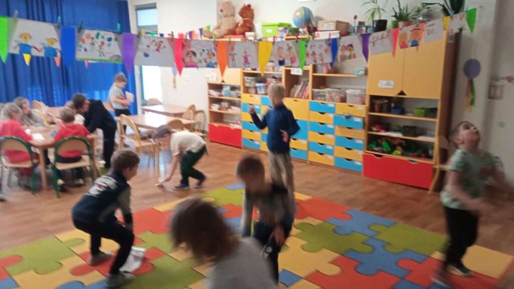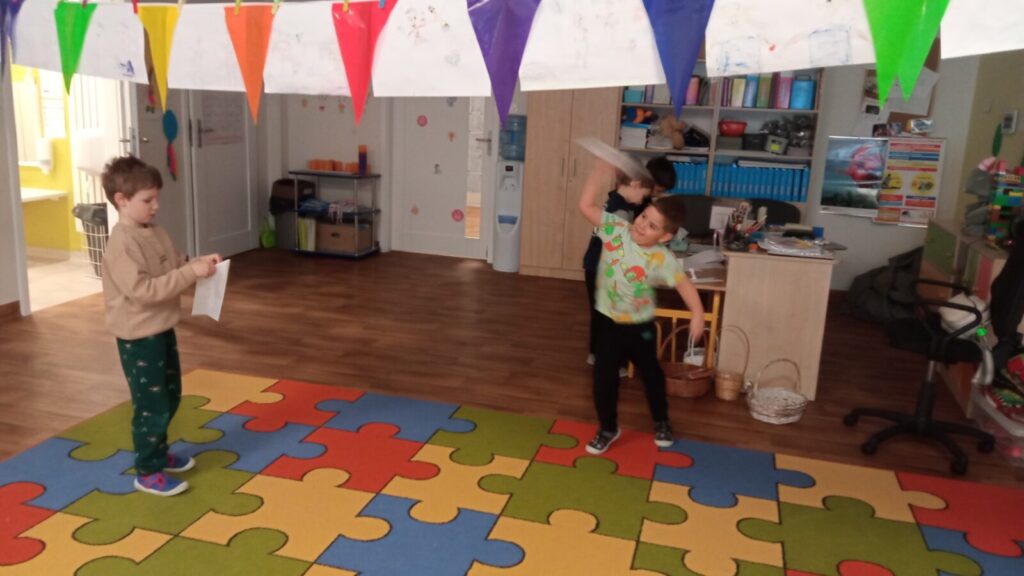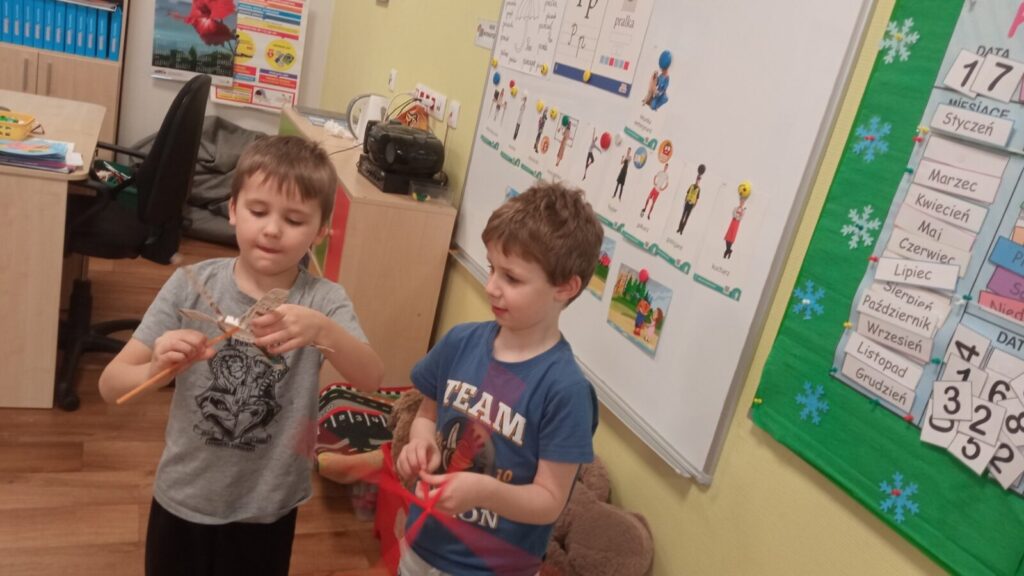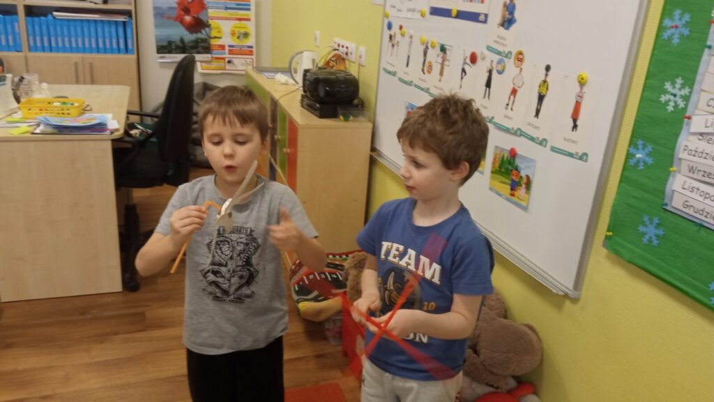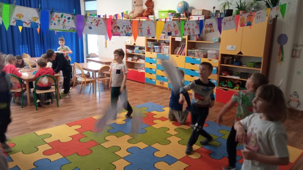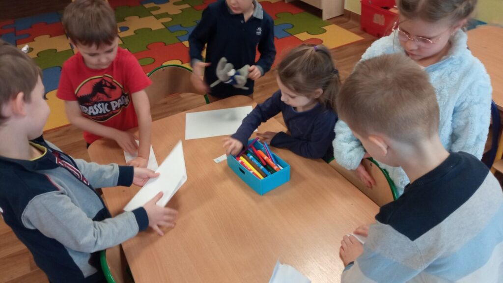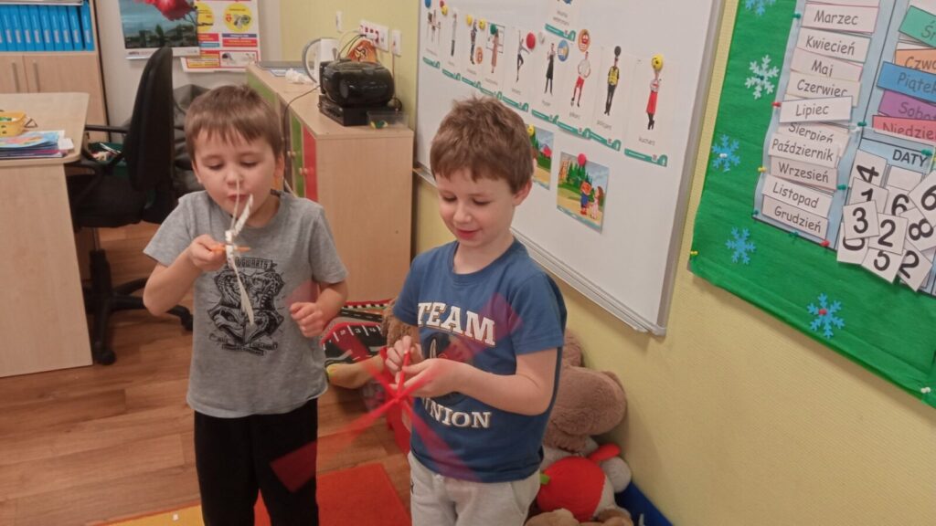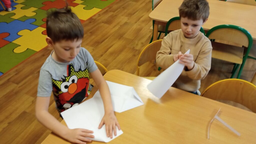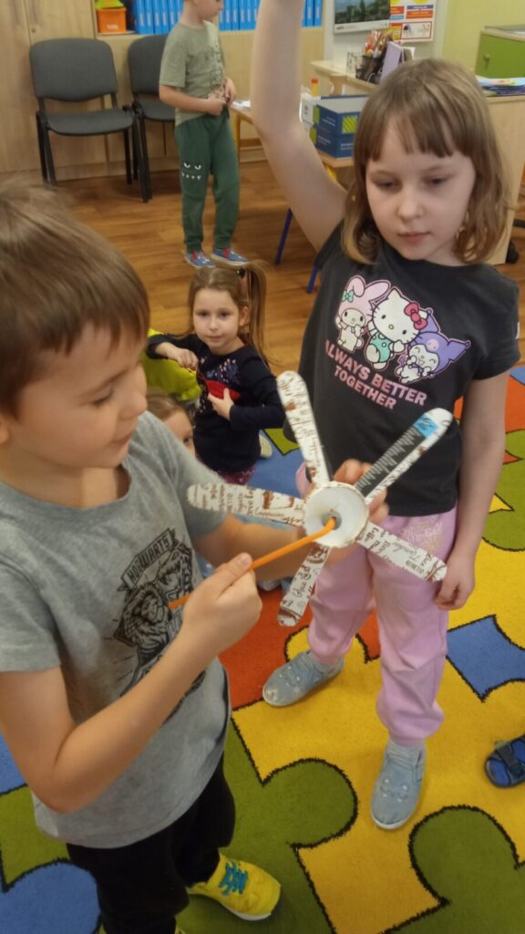 Dzieci wykonywały proste samoloty i wiatraczki aby zaobserwować ruch i jego zależności oraz działanie elektrowni wiatrowej.