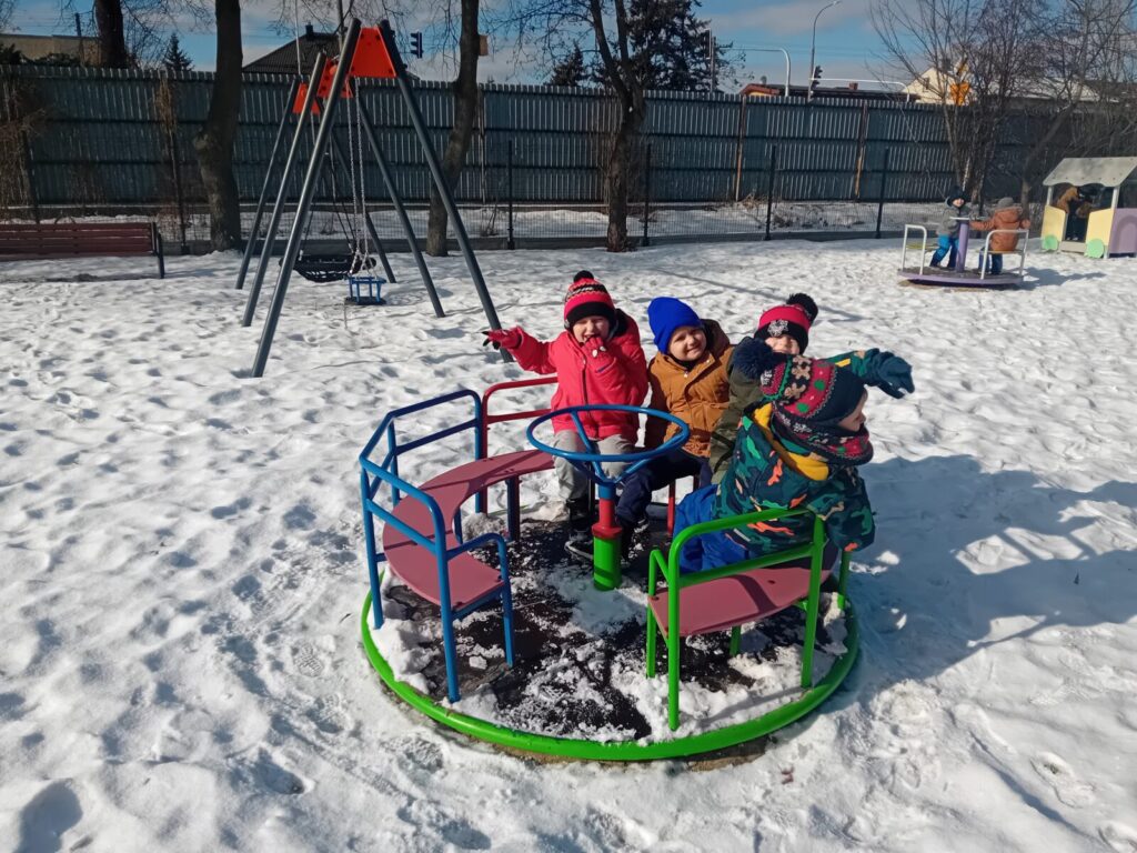 Zimowe zabawy 14 marca 2026 przez przedszkole Galeria zdjęć przedstawia dzieci podczas zimowych zabaw w ogrodzie przedszkolnym.