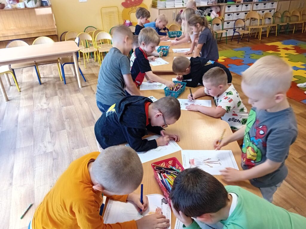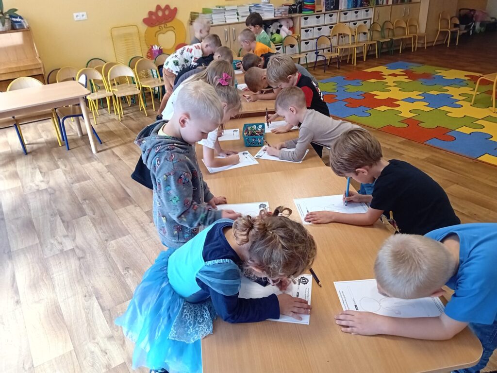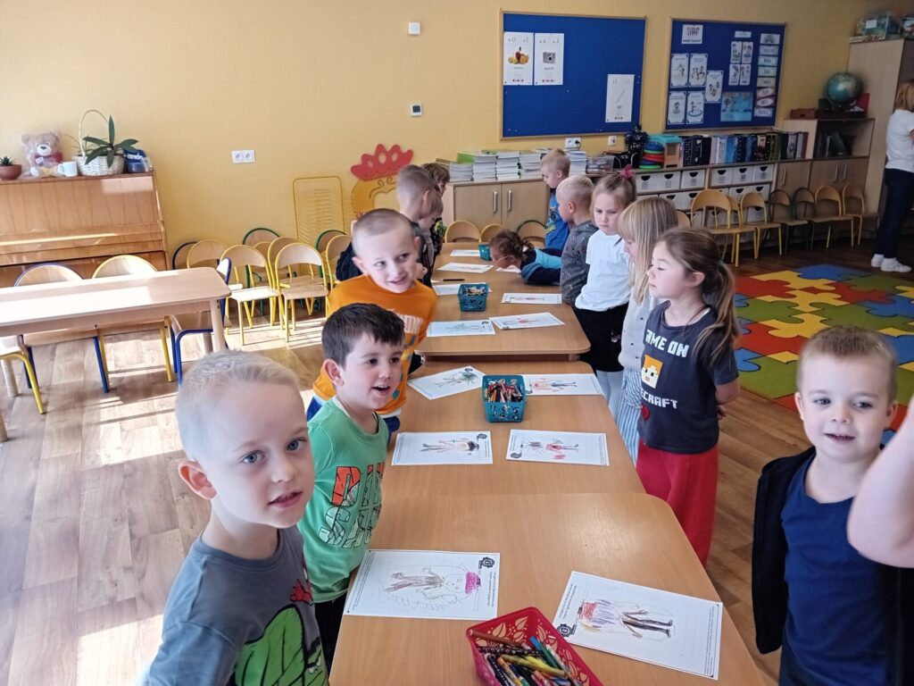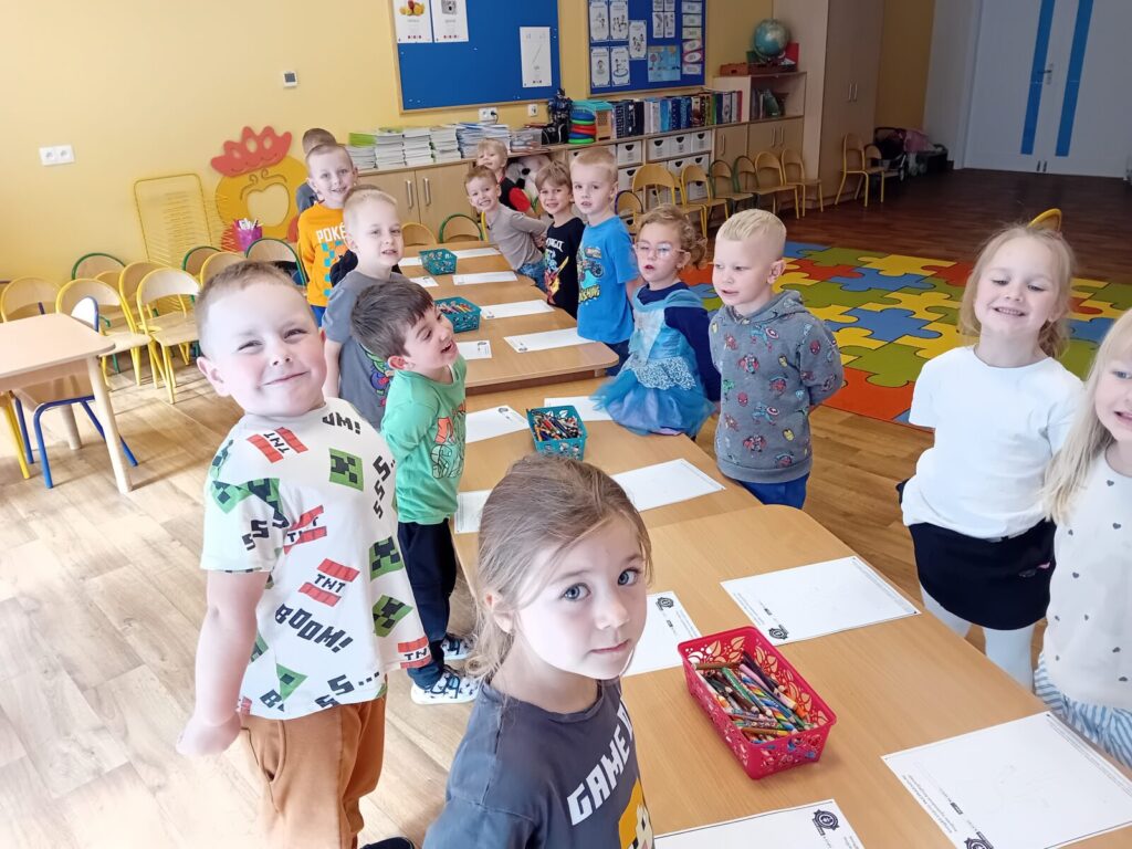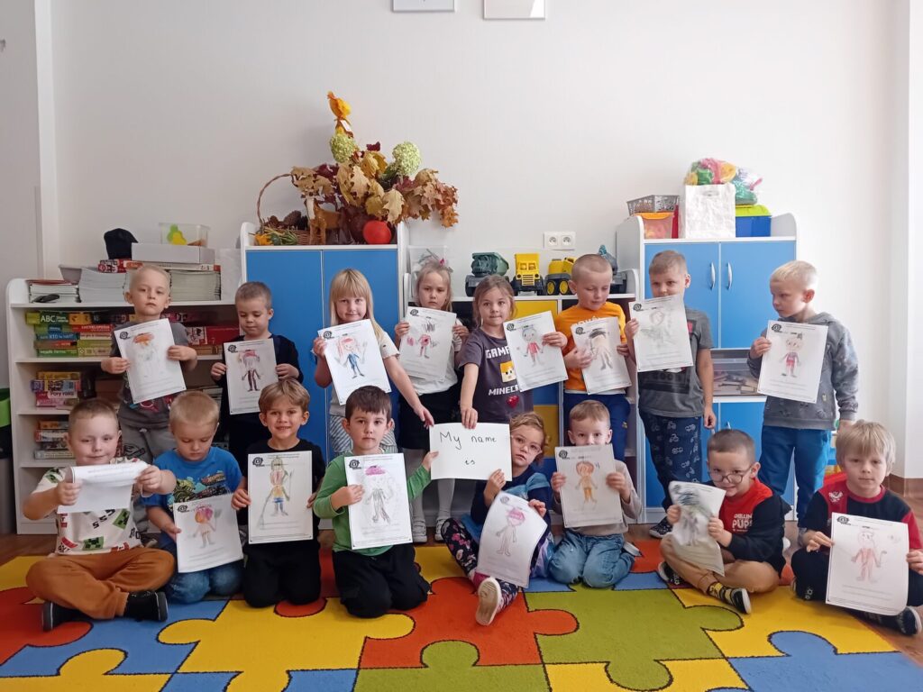 Galeria zdjęć przedstawia dzieci podczas udziału w zajęciach Dwujęzyczny Przedszkolak. Dzieci uczyły się umiejętności witania się i przedstawiania w j. angielskim.