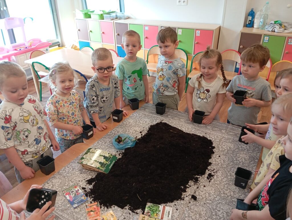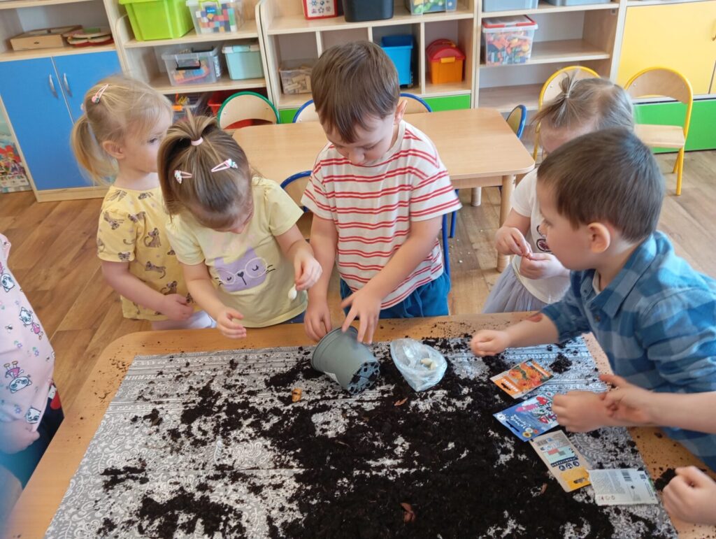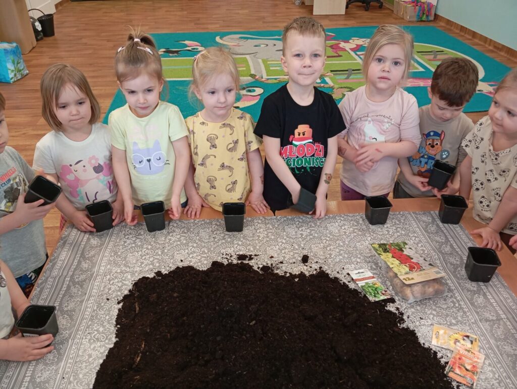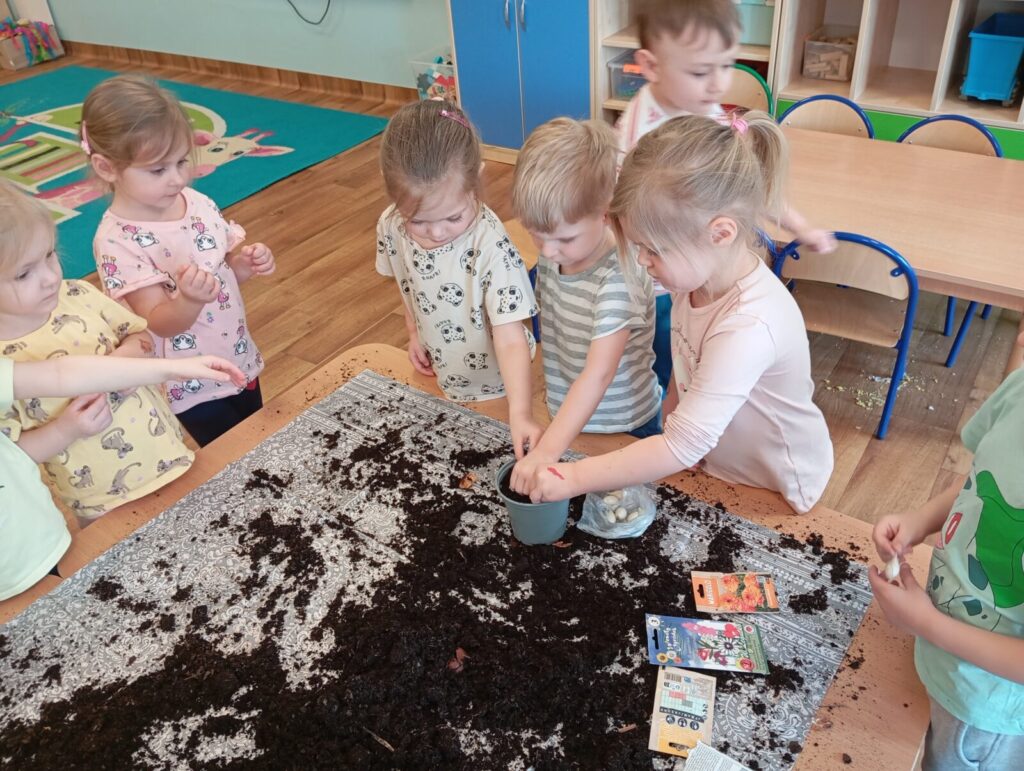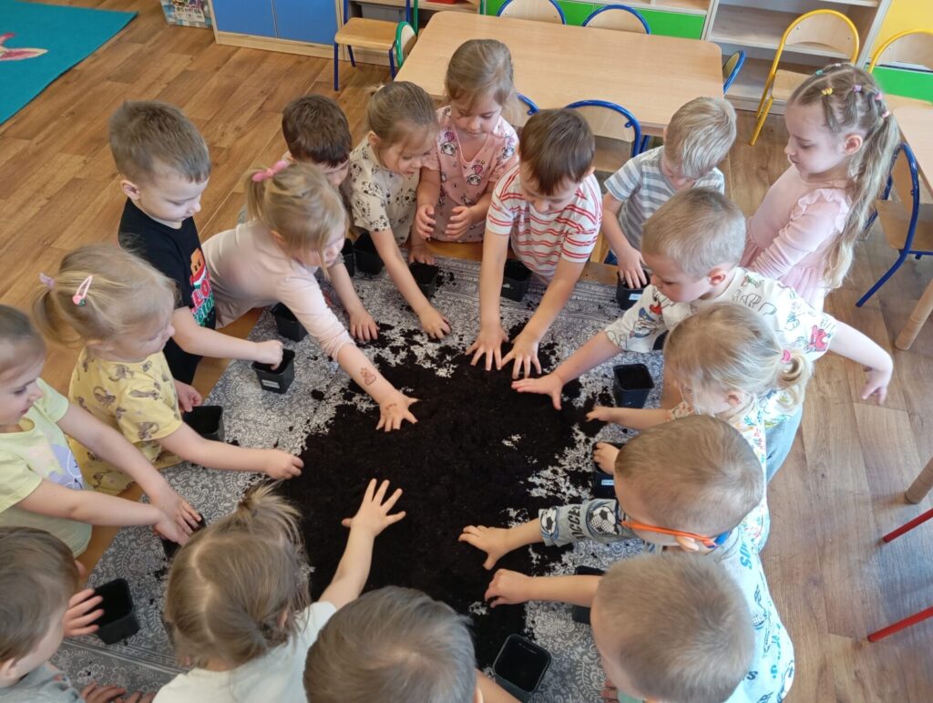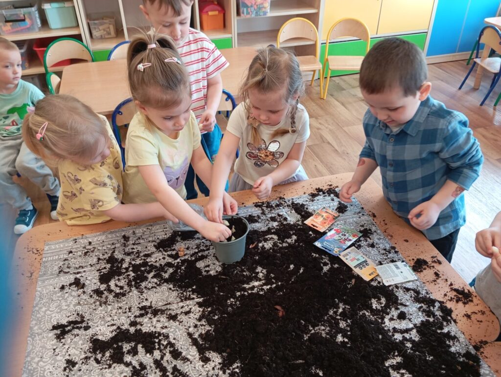 Mali ogrodnicy 19 marca 2026 przez przedszkole Galera zdjęć przedstawia dzieci podczas siania i sadzenia wiosennych roślin.