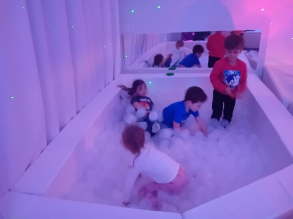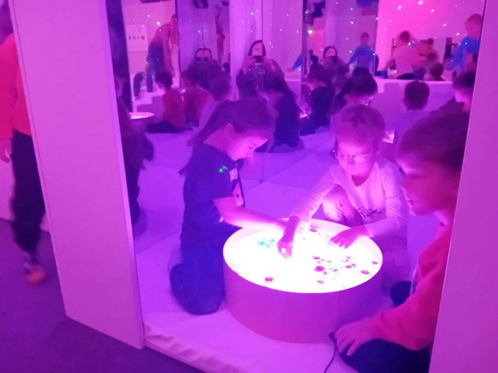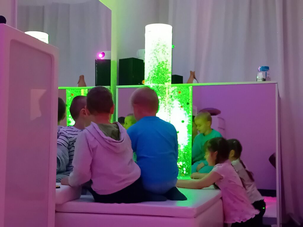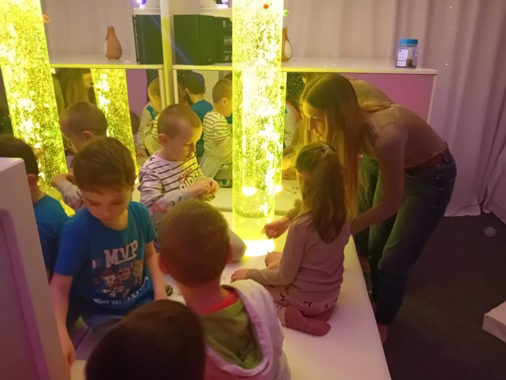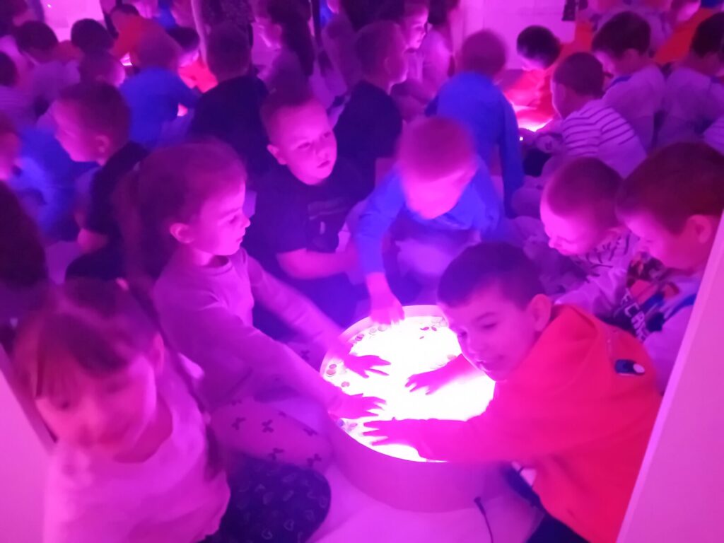 Galeria zdjęć przedstawia dzieci podczas zajęć w SDŚ, w której oglądały kolorowe światła, słuchały spokojnej muzyki, bawiły się dźwiękami, elementami sensorycznymi i światłowodami. Przedszkolaki miały również możliwość dotykania różnych faktur i materiałów, a także relaksacji na łóżku wodnym z masażami. Dzięki temu mogły pobudzić wyobraźnię i rozwijać zmysły poprzez zabawę.