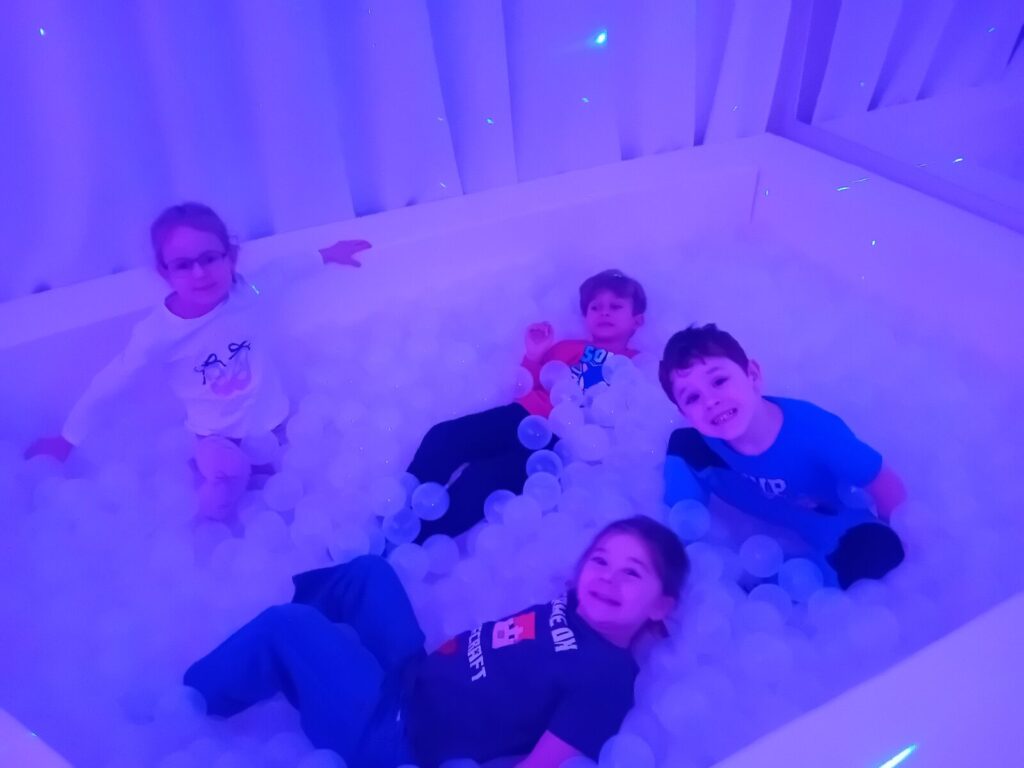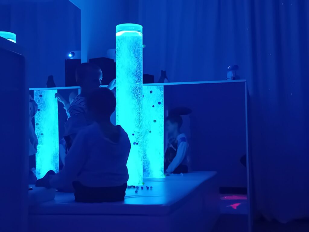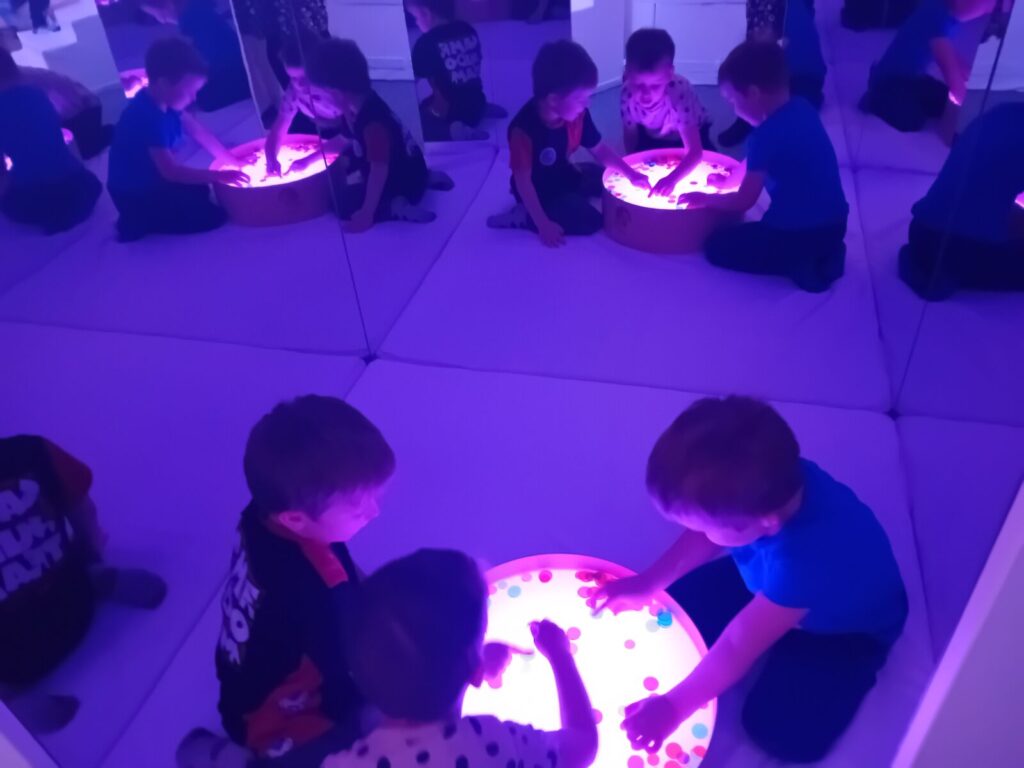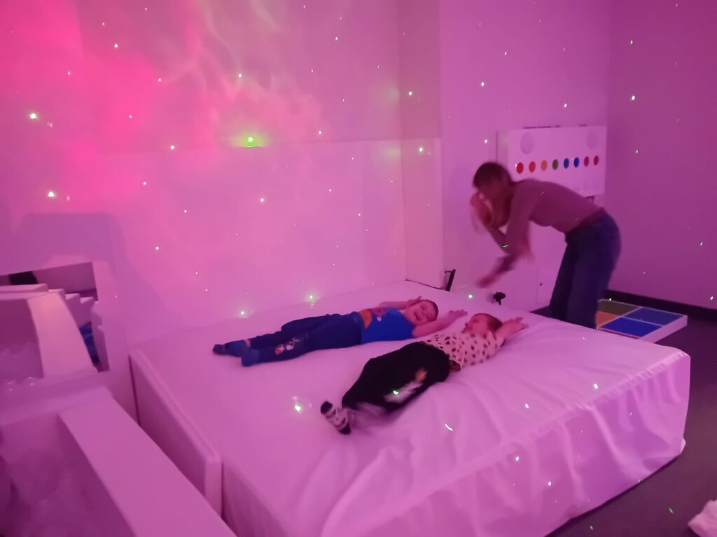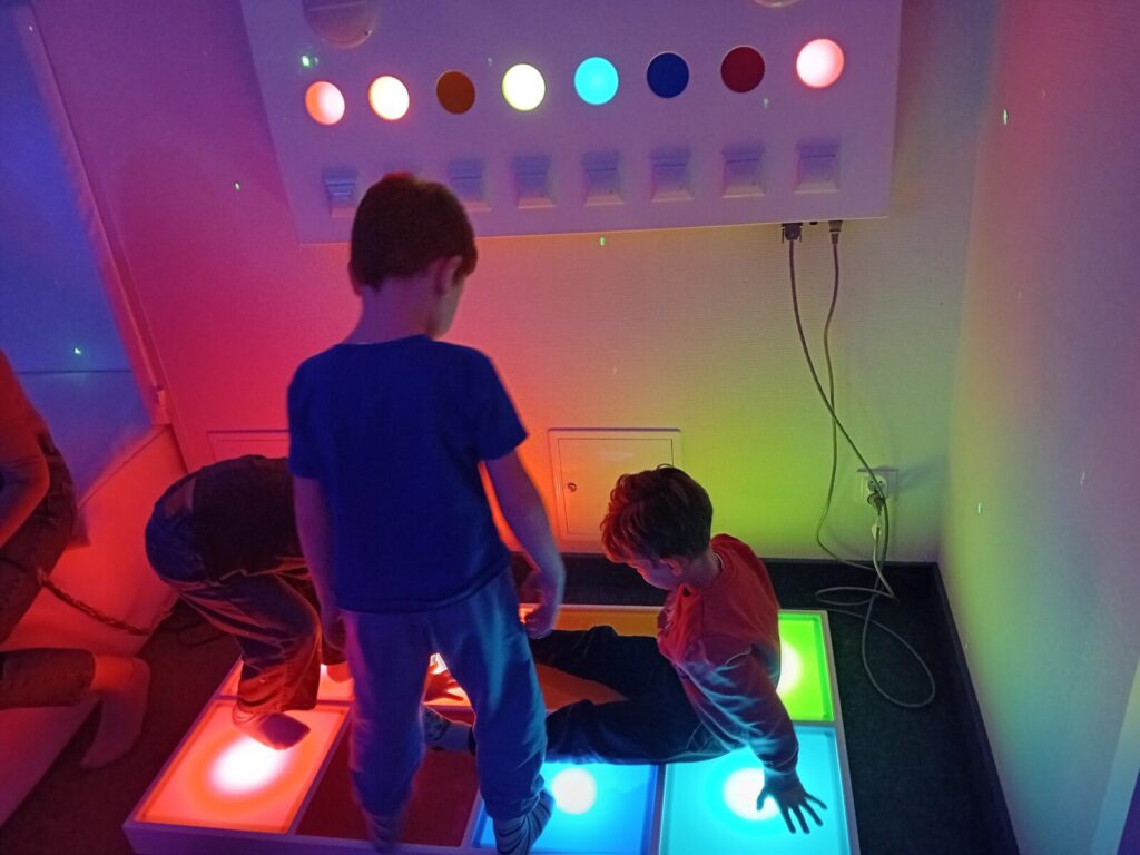 Galeria zdjęć przedstawia dzieci podczas zajęć w SDŚ, w której oglądały kolorowe światła, słuchały spokojnej muzyki, bawiły się dźwiękami, elementami sensorycznymi i światłowodami. Przedszkolaki miały również możliwość dotykania różnych faktur i materiałów, a także relaksacji na łóżku wodnym z masażami. Dzięki temu mogły pobudzić wyobraźnię i rozwijać zmysły poprzez zabawę.
