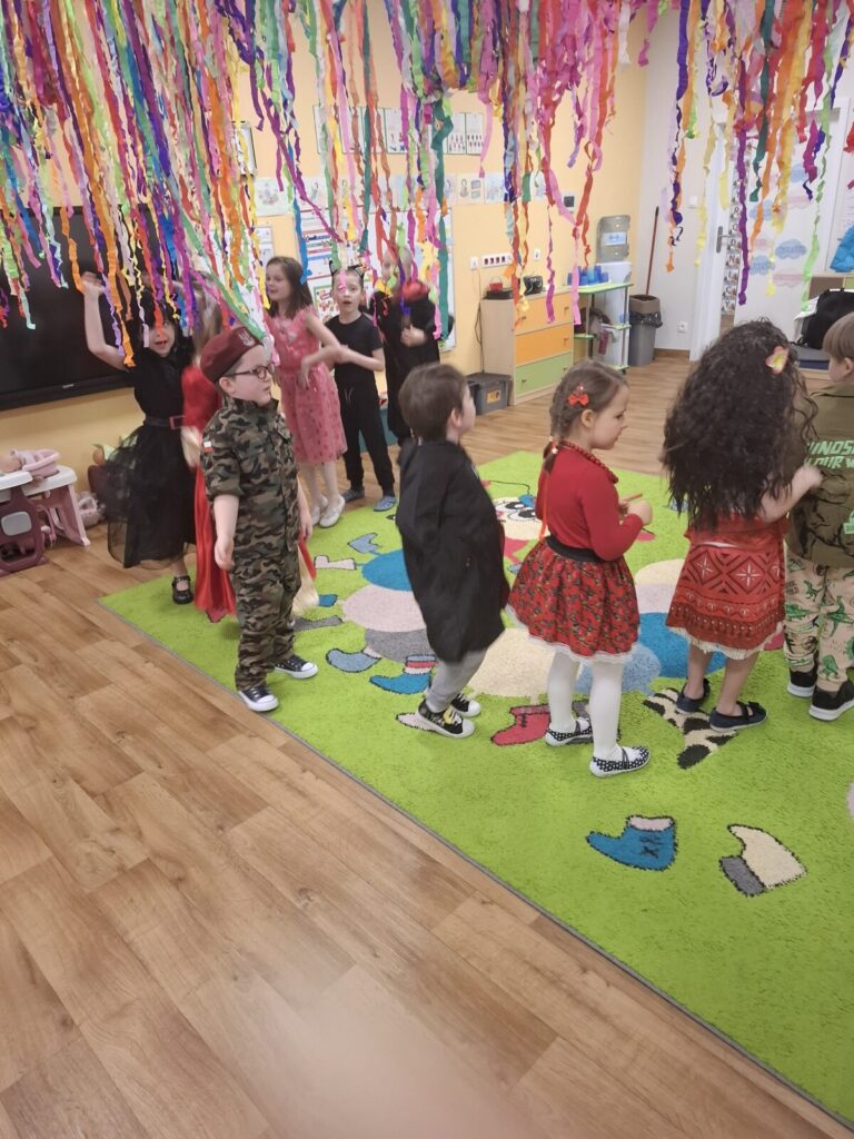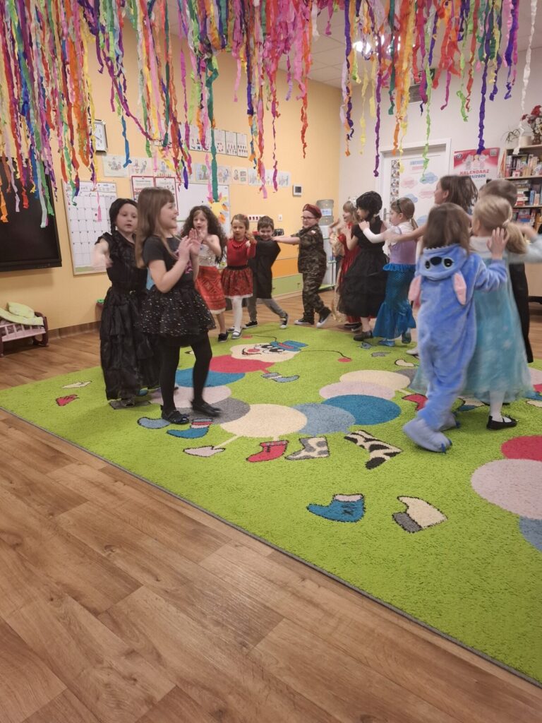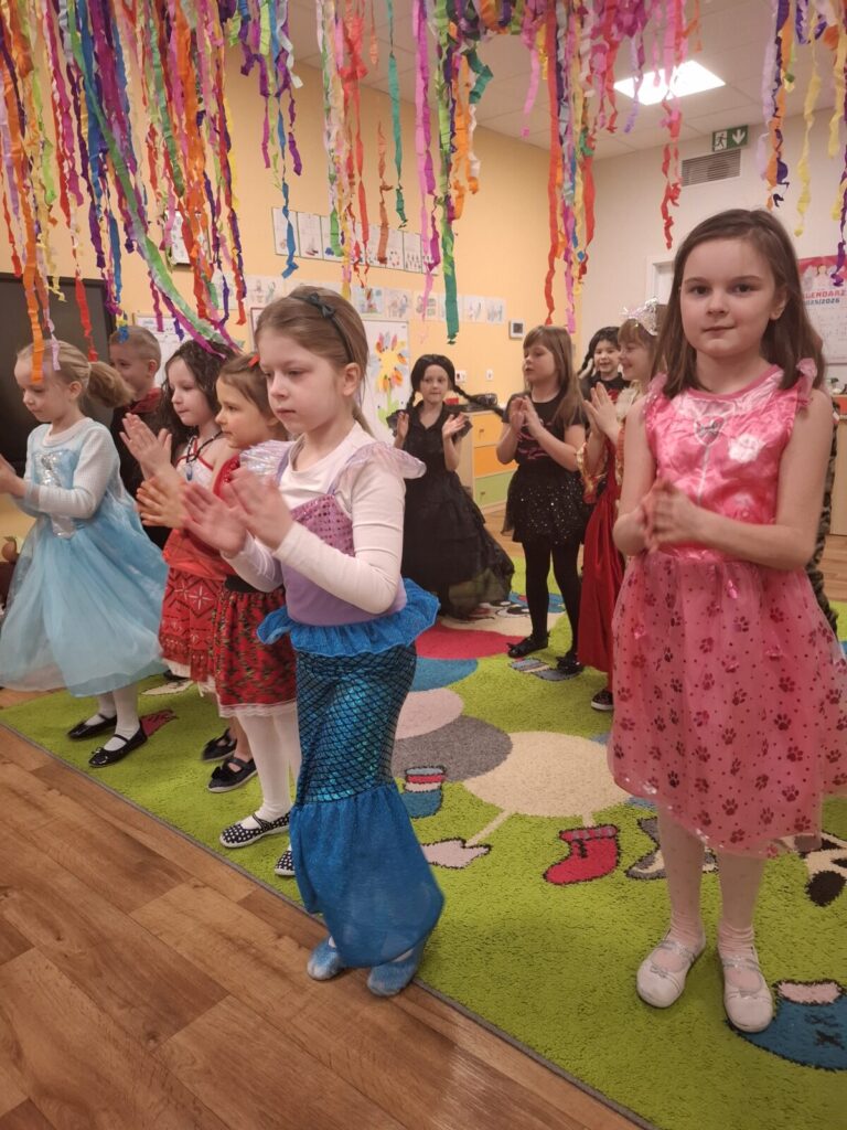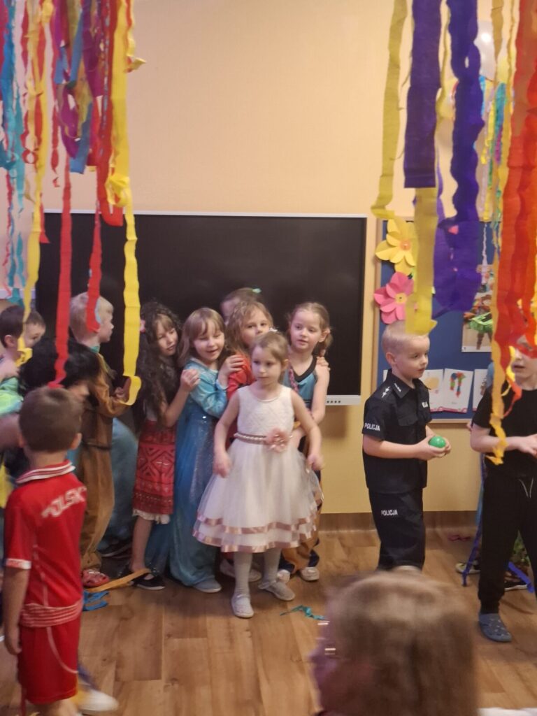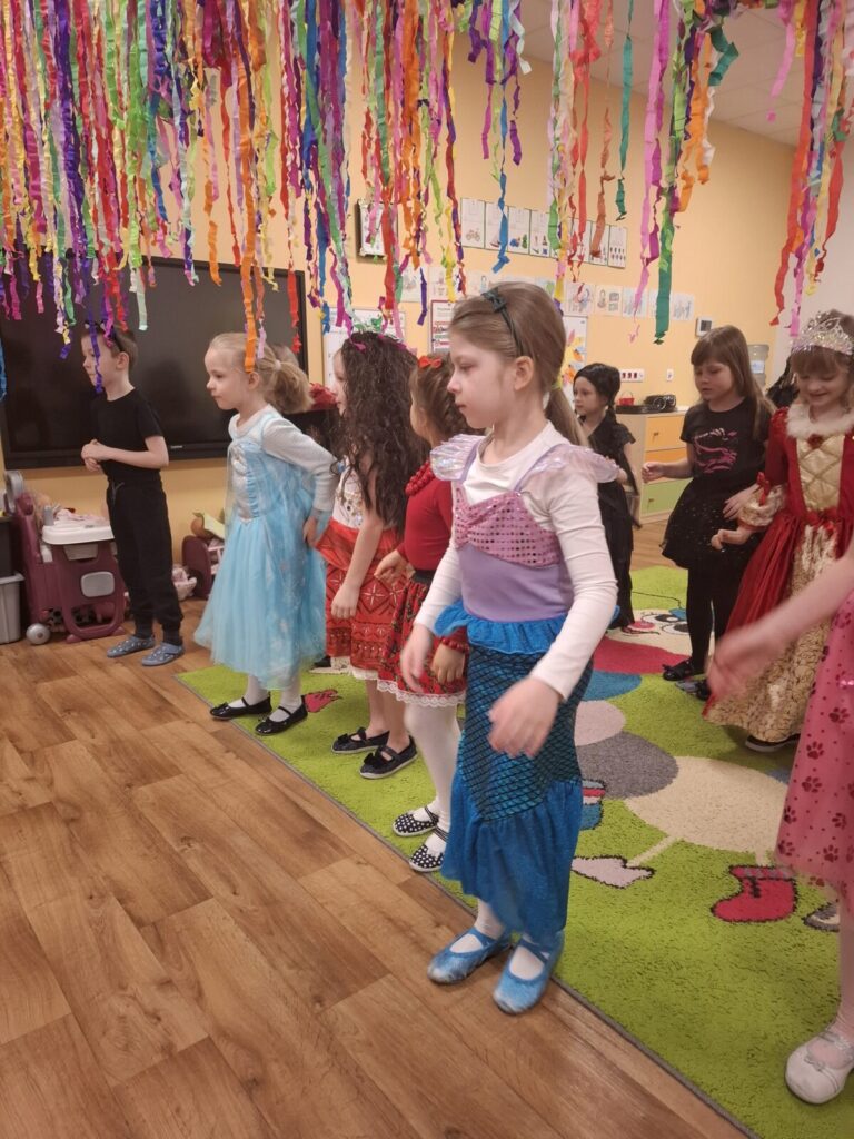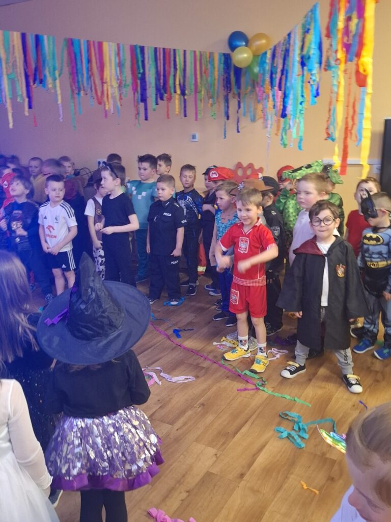 Przedszkolaki z okazji zabawy karnawałowej przebrały się w piękne stroje. Były księżniczki, super bohaterowie, postacie z bajek i wiele innych barwnych postaci. Zabawa były super.