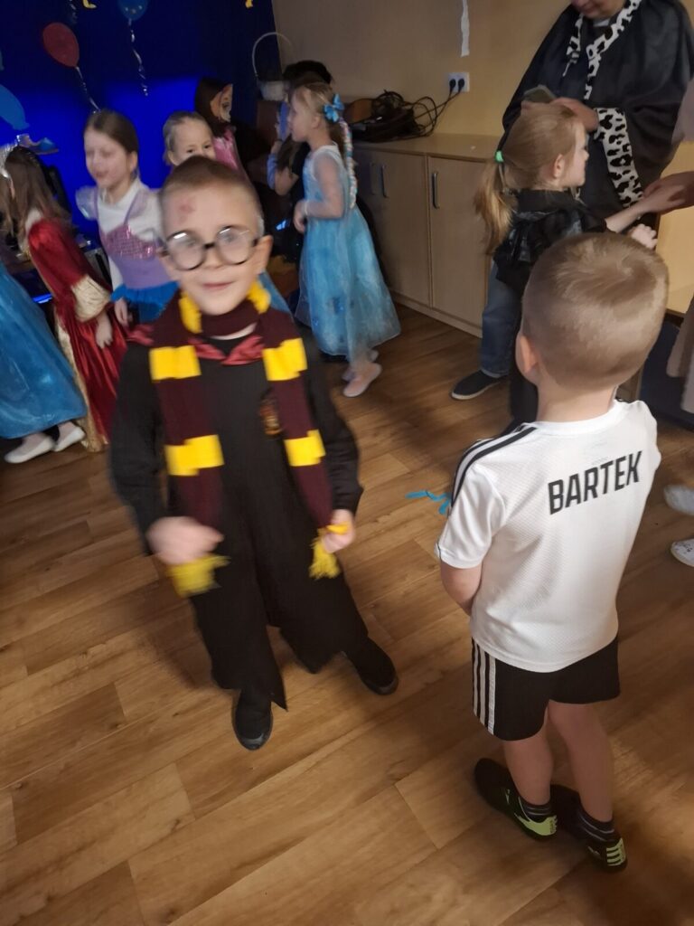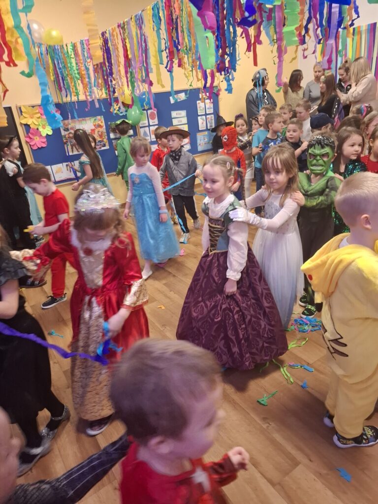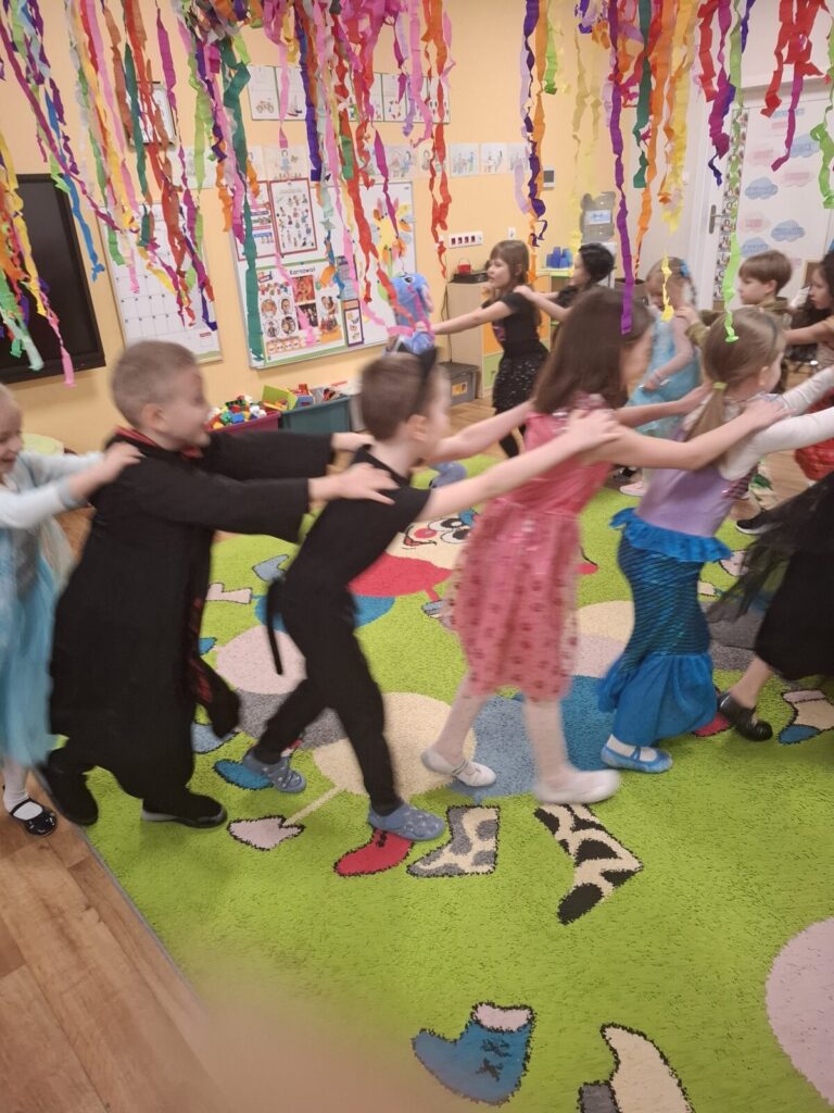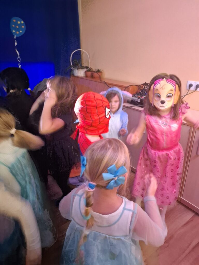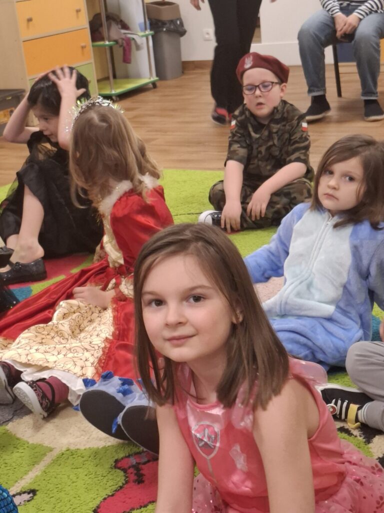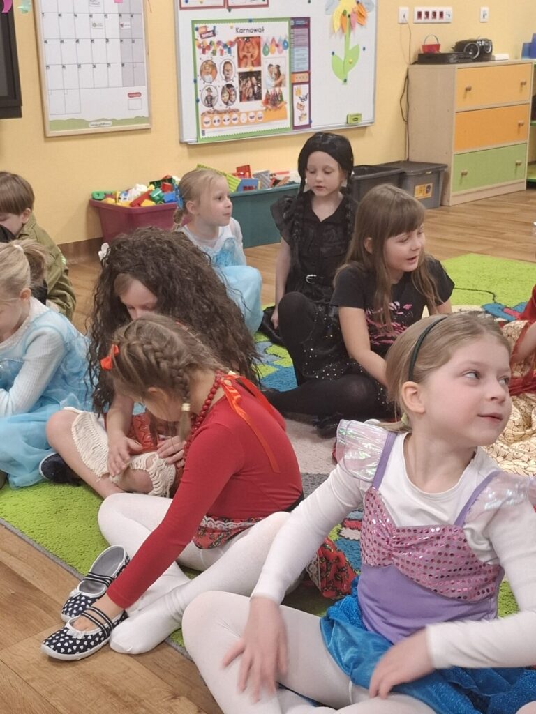 Przedszkolaki z okazji zabawy karnawałowej przebrały się w piękne stroje. Były księżniczki, super bohaterowie, postacie z bajek i wiele innych barwnych postaci. Zabawa były super.