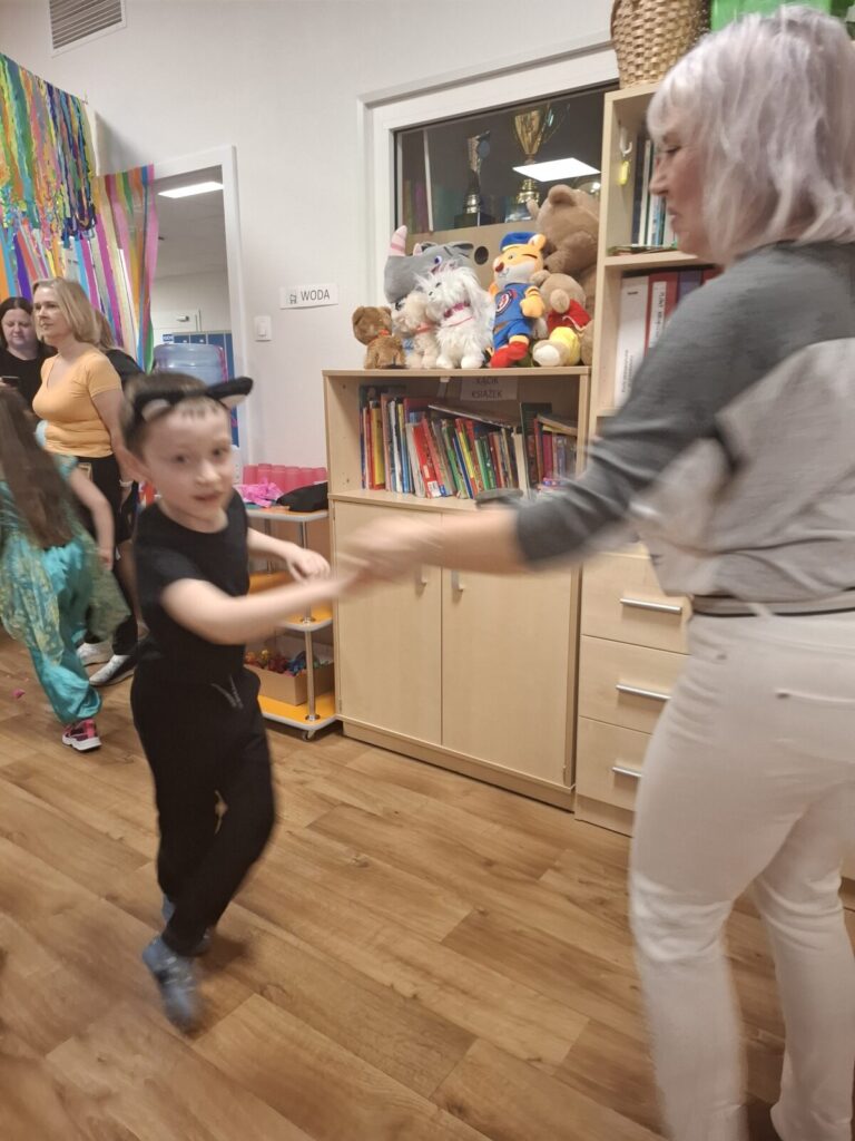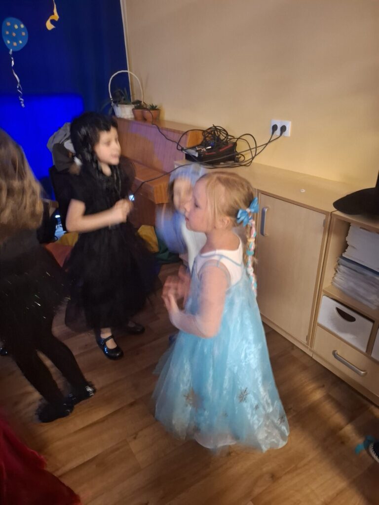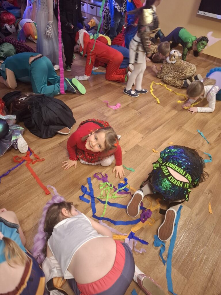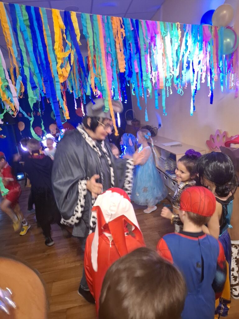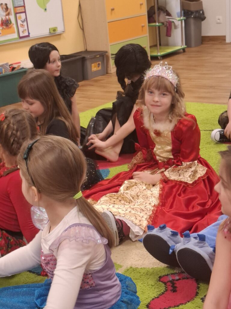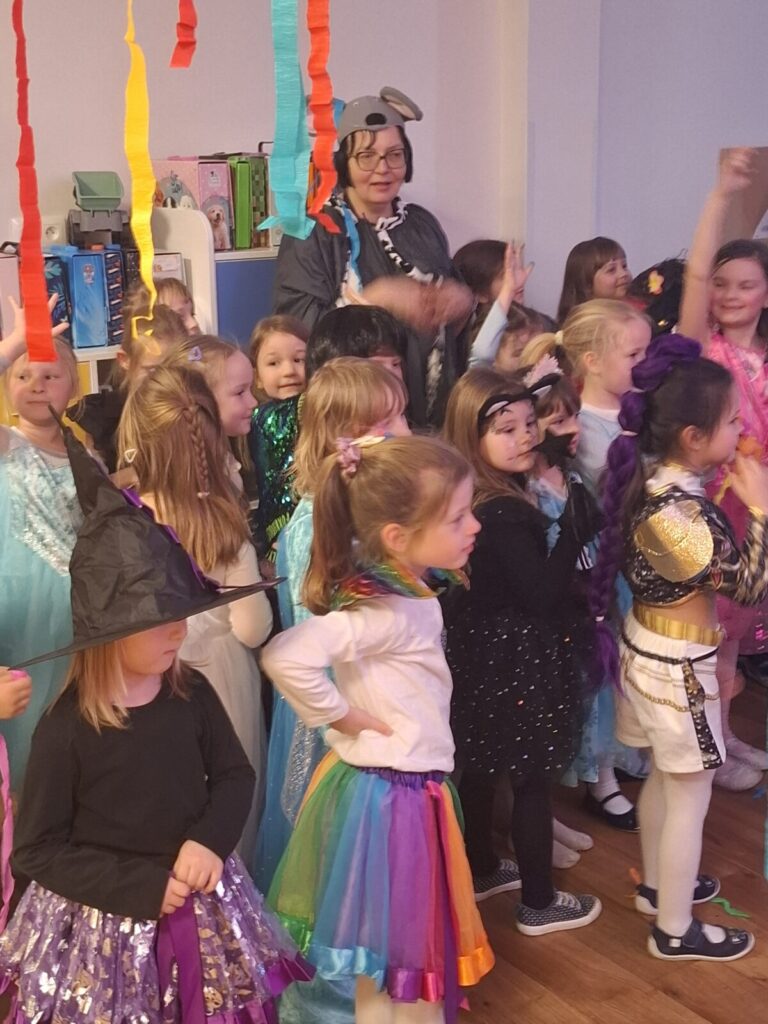 Przedszkolaki z okazji zabawy karnawałowej przebrały się w piękne stroje. Były księżniczki, super bohaterowie, postacie z bajek i wiele innych barwnych postaci. Zabawa były super.