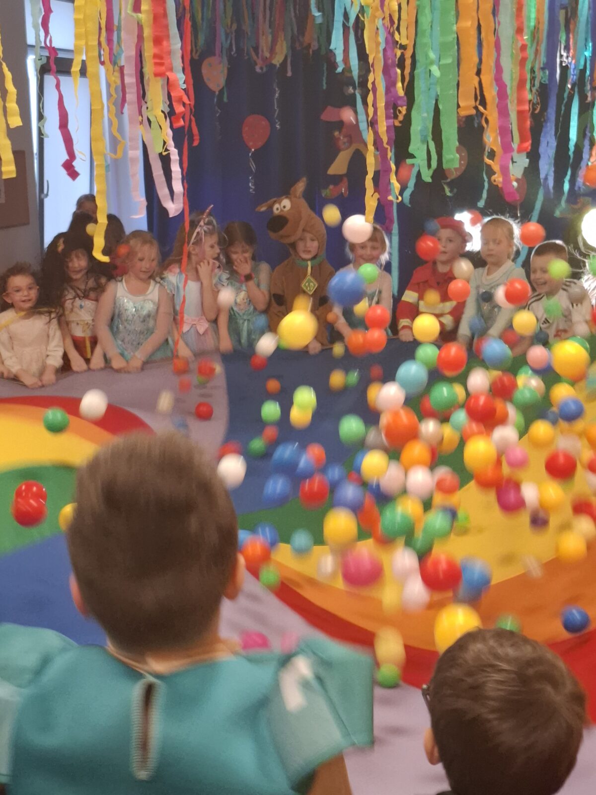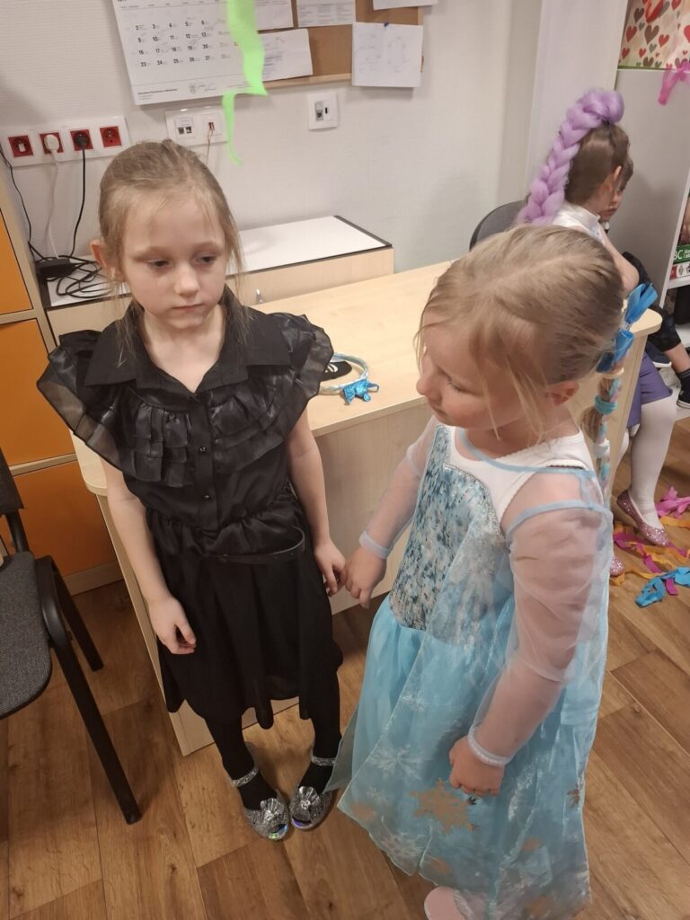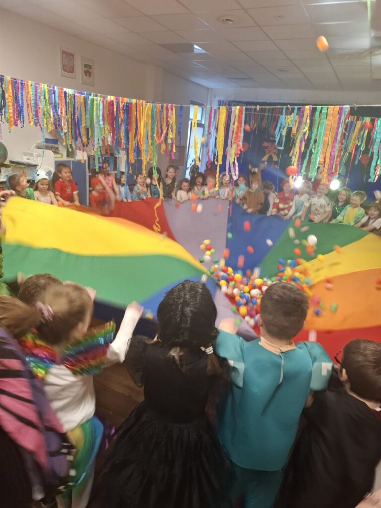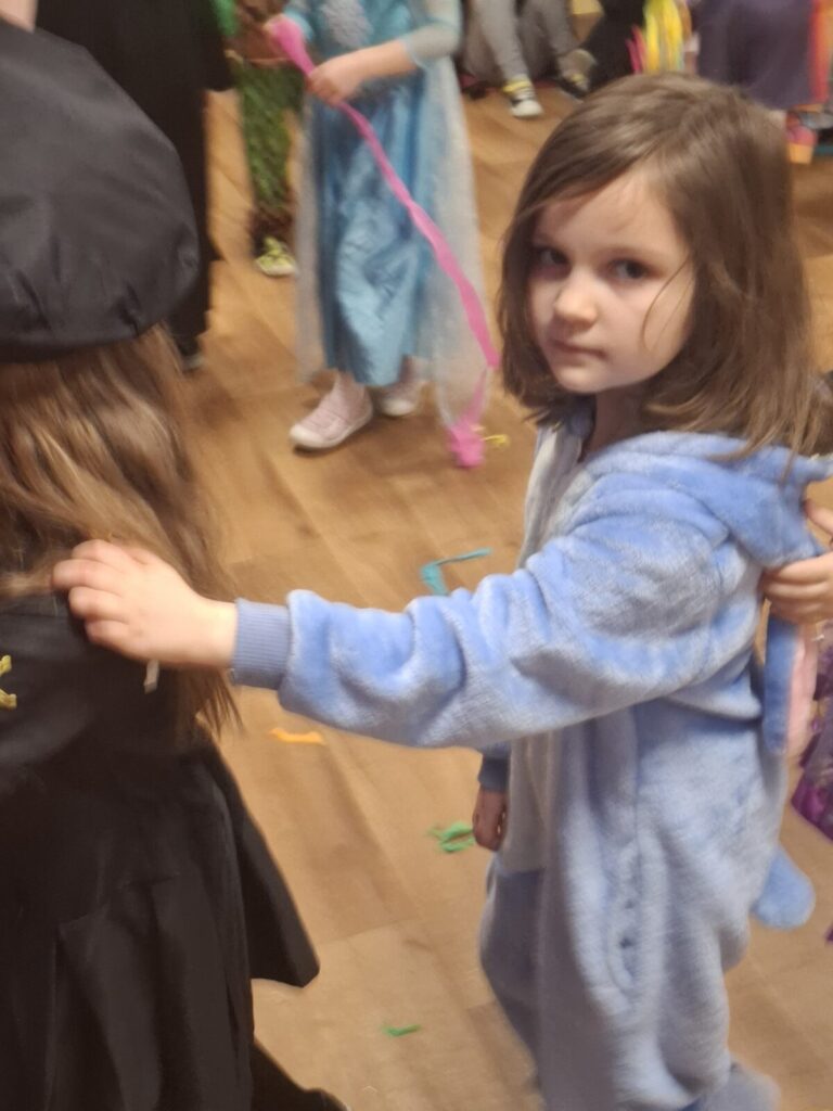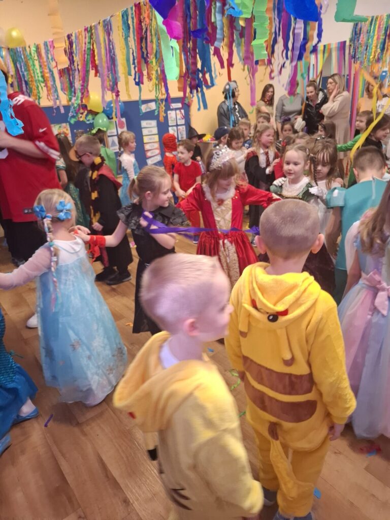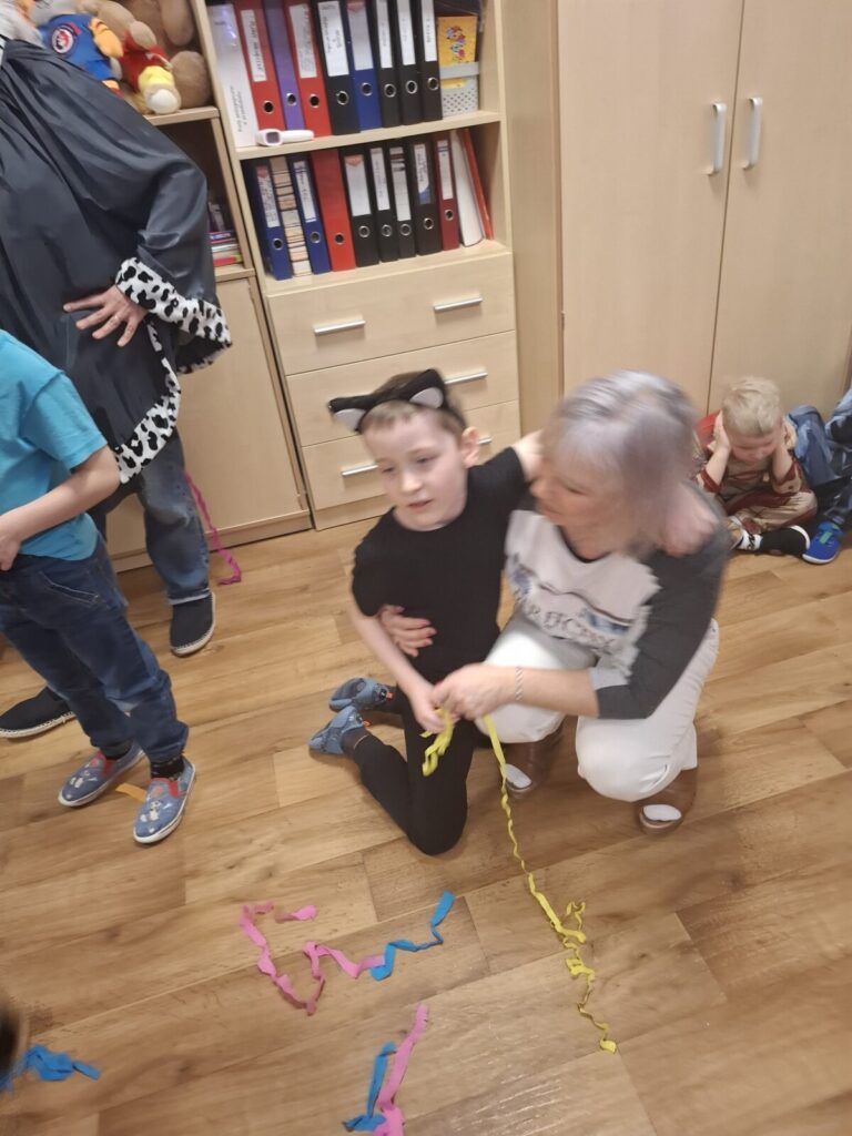 Przedszkolaki z okazji zabawy karnawałowej przebrały się w piękne stroje. Były księżniczki, super bohaterowie, postacie z bajek i wiele innych barwnych postaci. Zabawa były super.