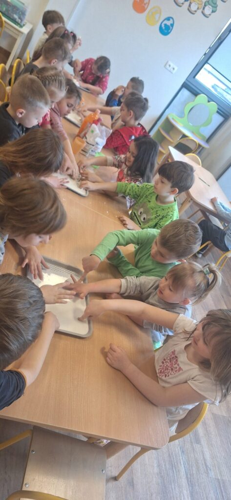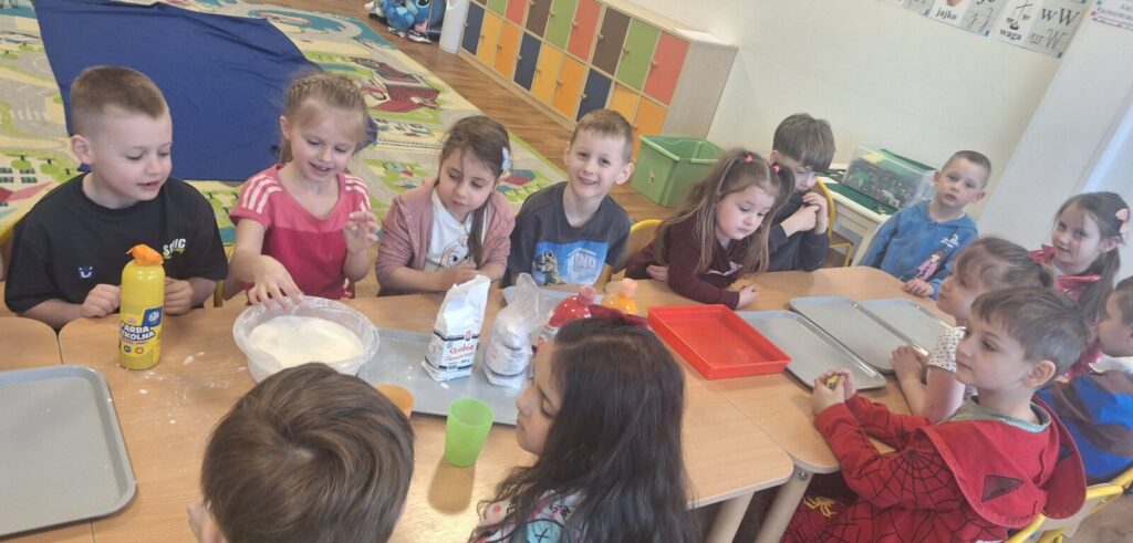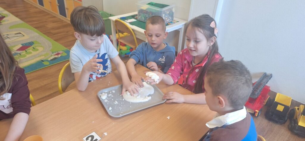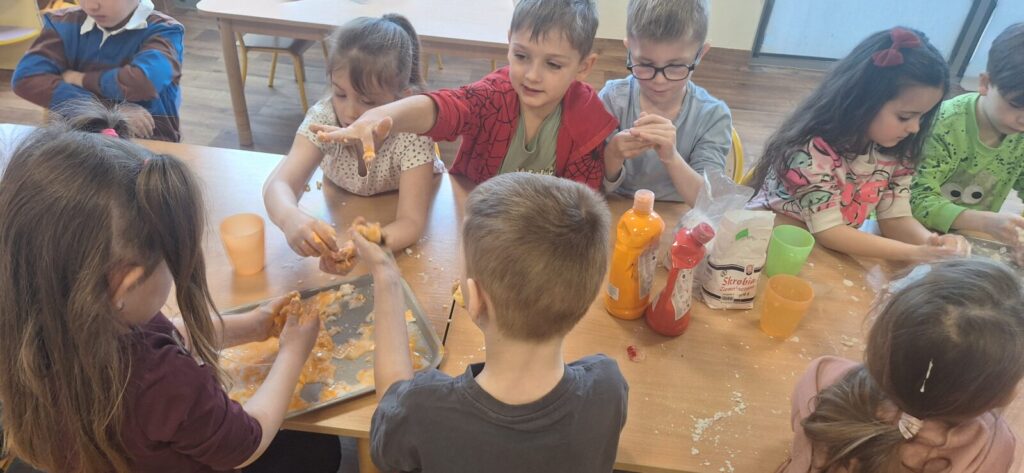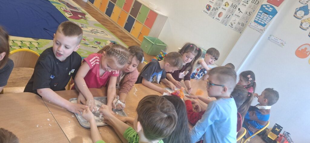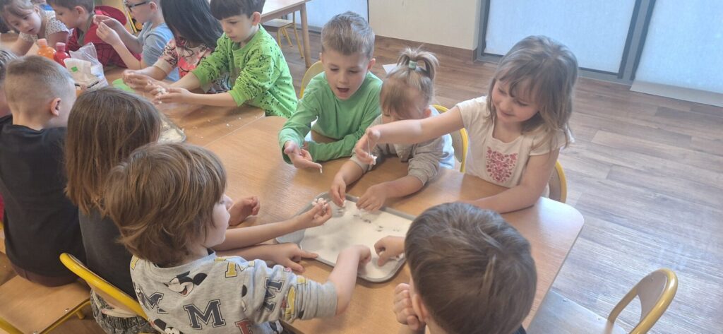 Galeria zdjęć przedstawia dzieci w trakcie doświadczenia z rewelacyjną cieczą nienewtonowską, łączącą naukę z zabawą. Powstała poprzez wymieszanie mąki ziemniaczanej z wodą, tworząc masę, która pod naciskiem staje się twarda, a bez niego- płynna. To była świetna zabawa.