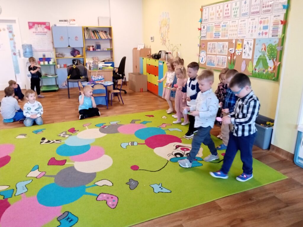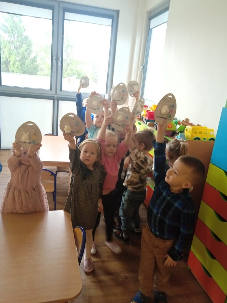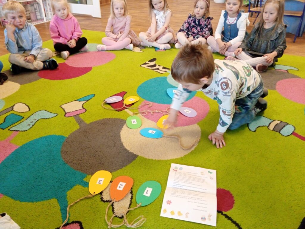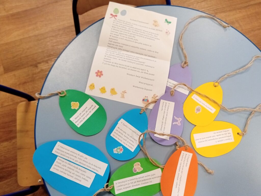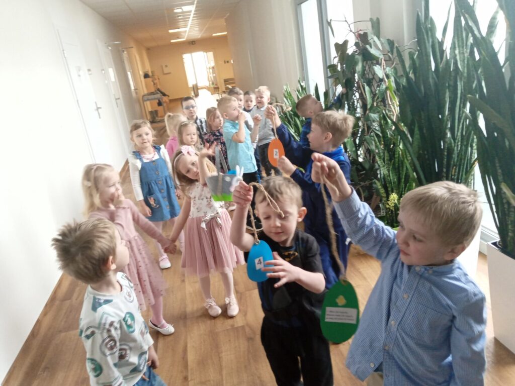 Dziś dzieci odwiedził wielkanocny zając, który zostawił ukryte upominki, aby je otrzymać przedszkolaki musiały najpierw wykonać przygotowane przez zająca zadania.
