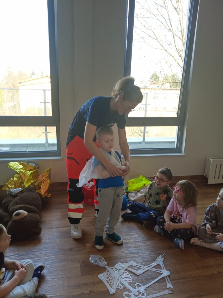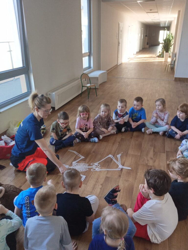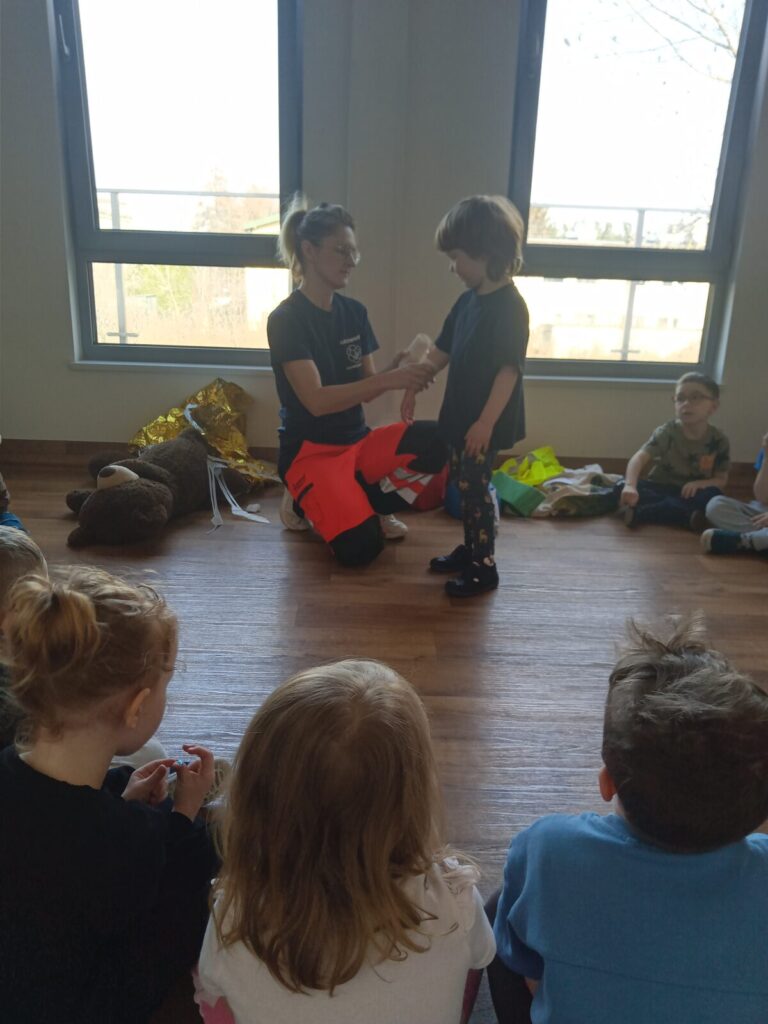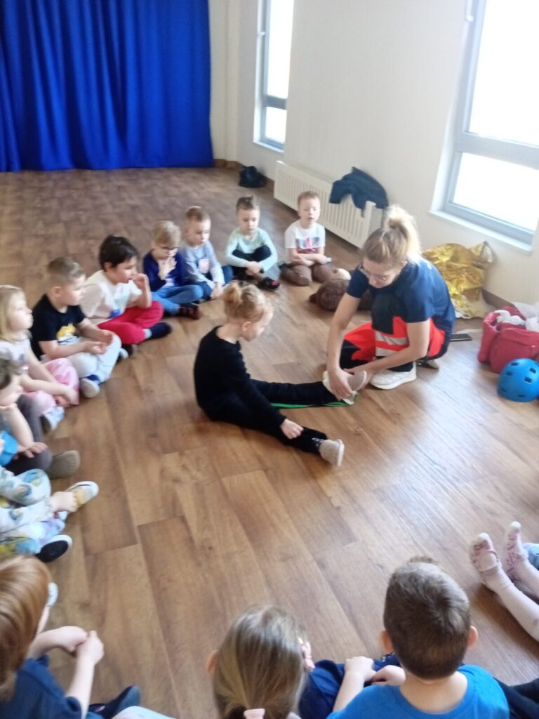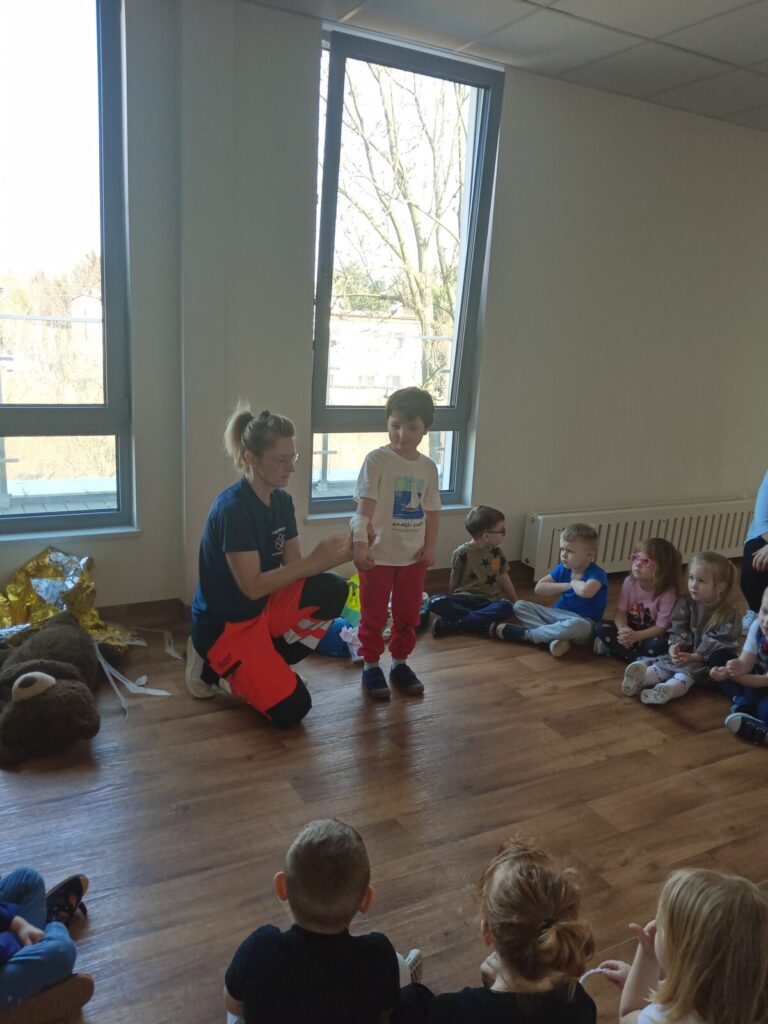 Szpital Ratownika Cegiełki 1 kwietnia 2026 przez przedszkole Galeria zdjęć przedstawia dzieci podczas ćwiczeń z udzielania pierwszej pomocy przedmedycznej.