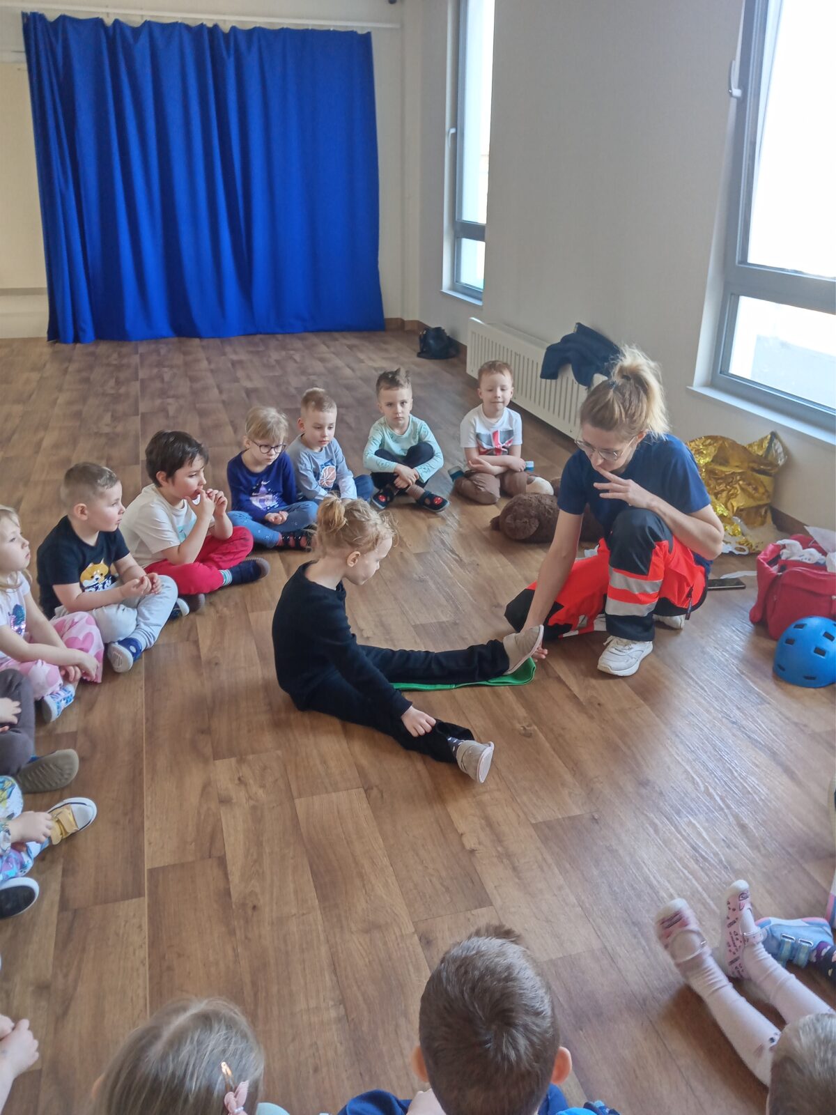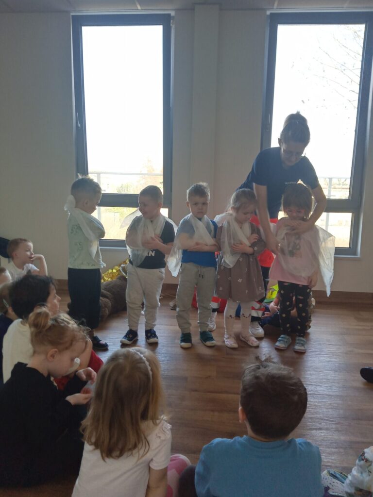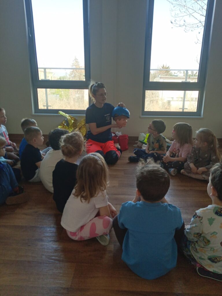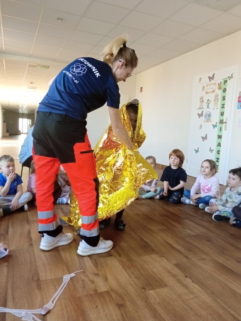 Szpital Ratownika Cegiełki 1 kwietnia 2026 przez przedszkole Galeria zdjęć przedstawia dzieci podczas ćwiczeń z udzielania pierwszej pomocy przedmedycznej.