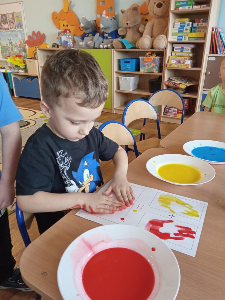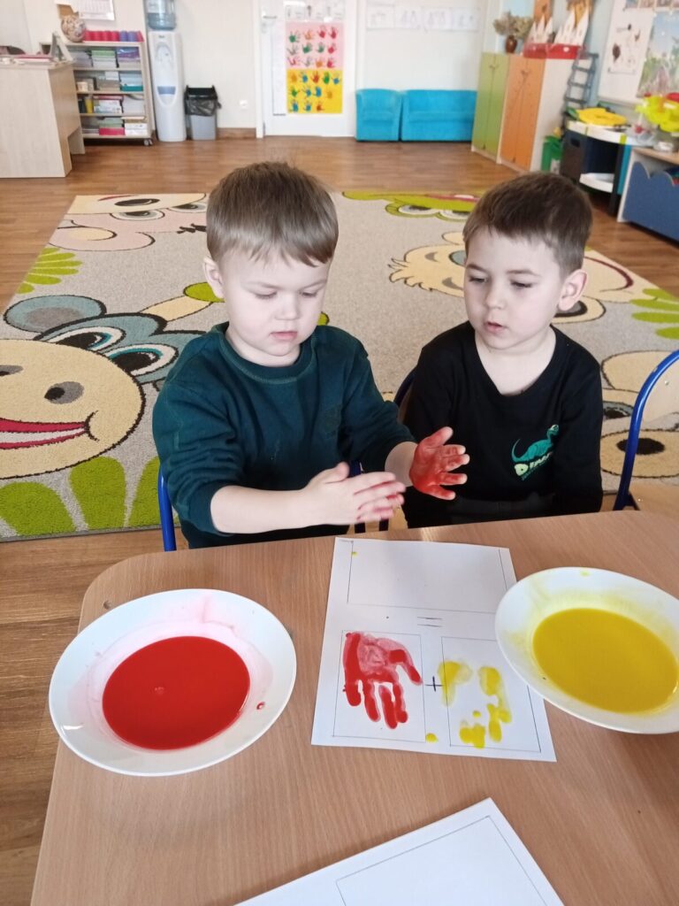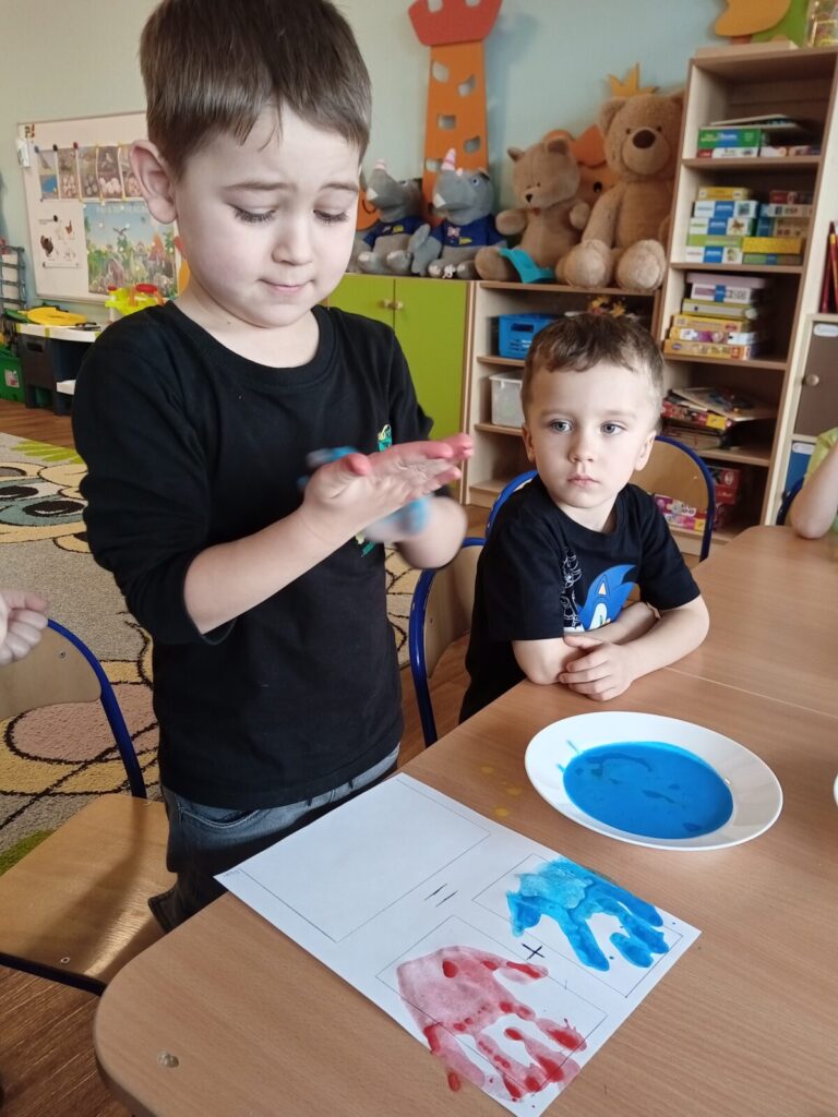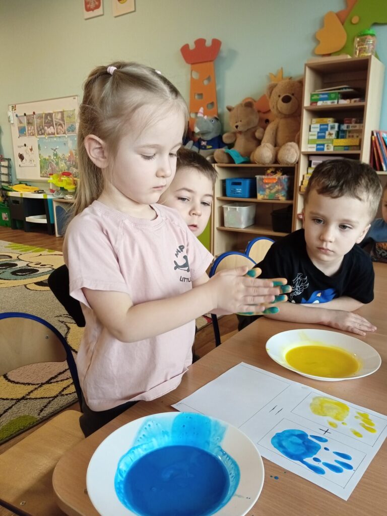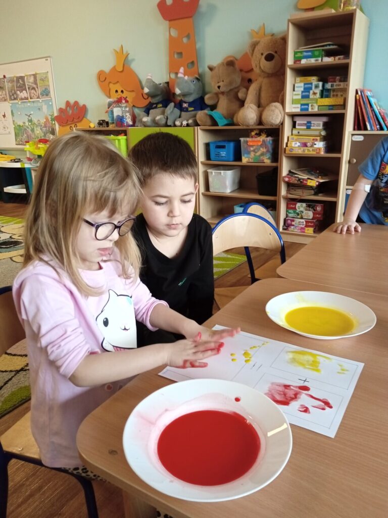 Tajemnicze kolory-zabawa badawcza 2 kwietnia 2026 przez przedszkole Galeria zdjęć przedstawia dzieci podczas zabawy badawczej.
