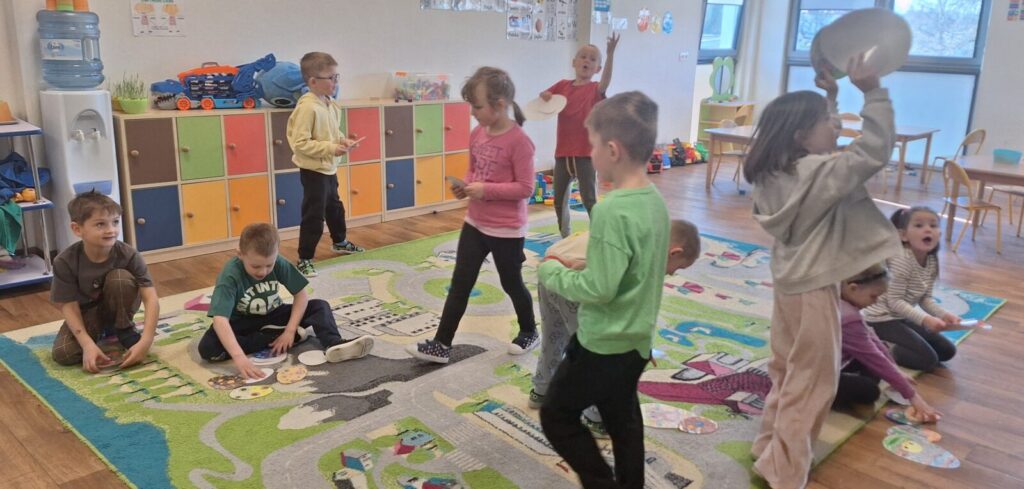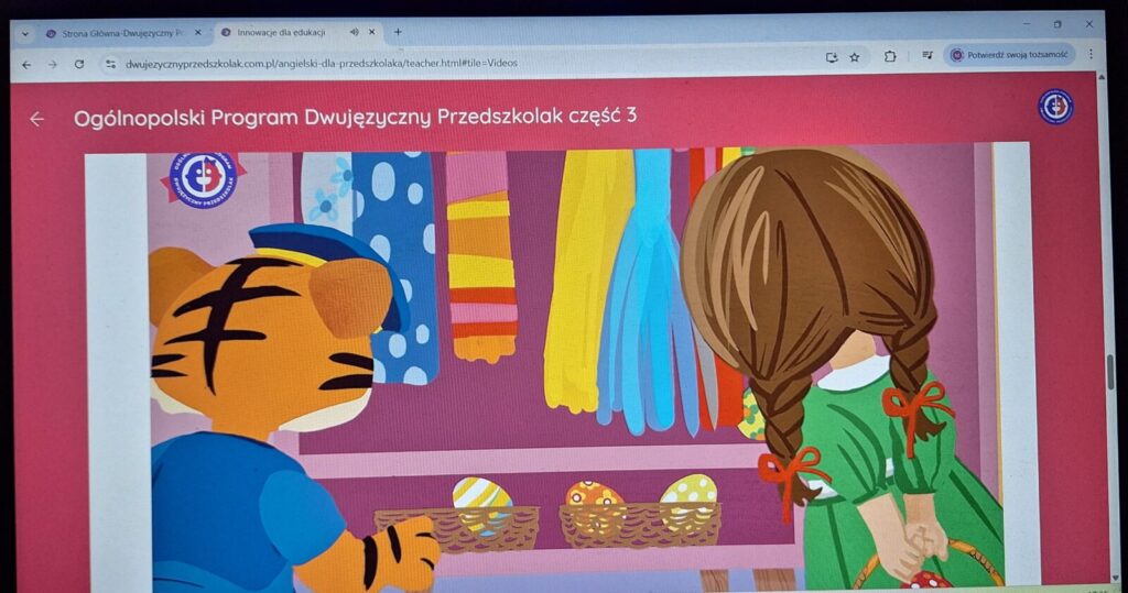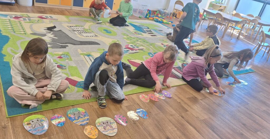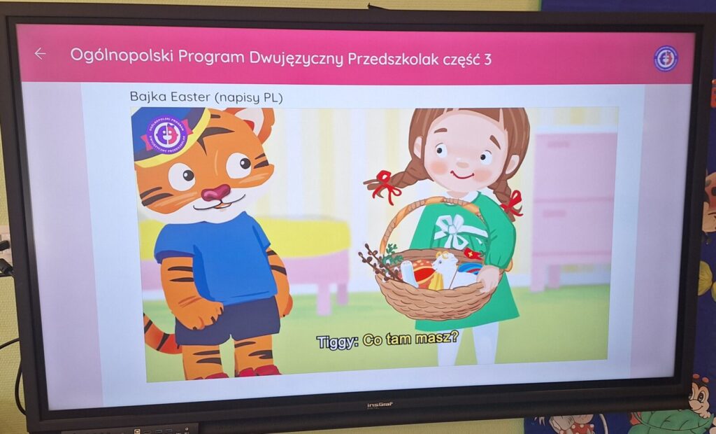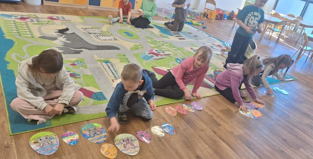 Galeria zdjęć przedstawia przedszkolaki podczas realizacji programu ,,Dwujęzyczny Przedszkolak”. Dzieci uczestniczyły w aktywnościach związanych ze Świętami Wielkanocnymi , liczyły pisanki przy piosence ,,Three Easter eggs”, oglądały bajkę, pt. ,,Easter egg hunt”- szukanie pisanek.