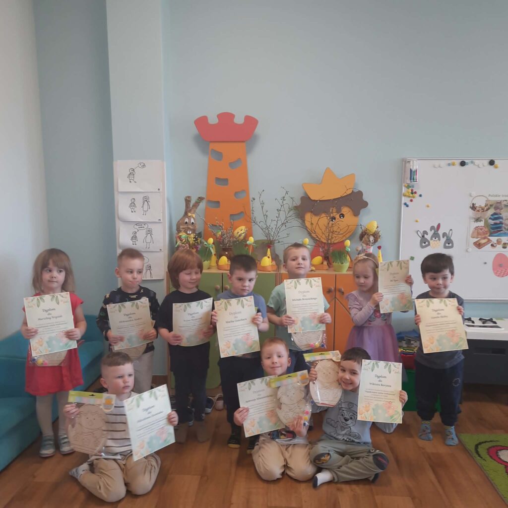 Ogłoszenie wyników konkursu plastycznego „Najpiękniejsza ozdoba wielkanocna” 3 kwietnia 2026 przez przedszkole Galeria zdjęć przedstawia dzieci podczas ogłoszenia wyników konkursu wielkanocnego.