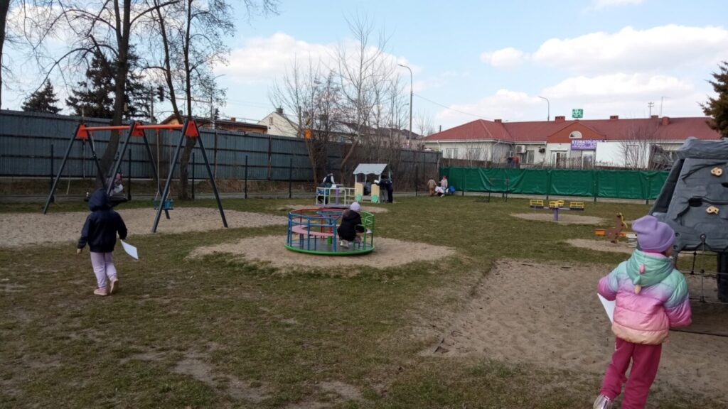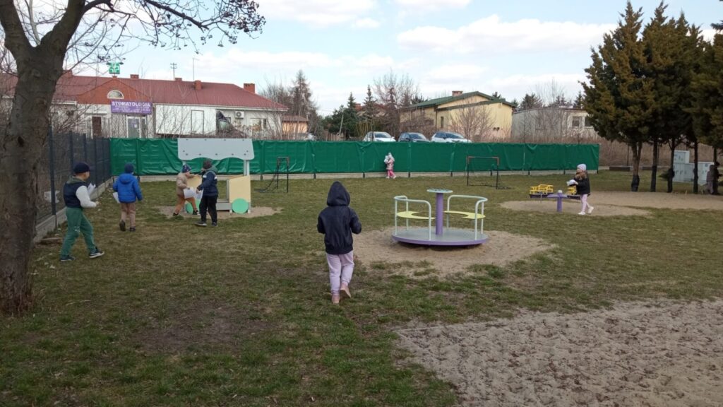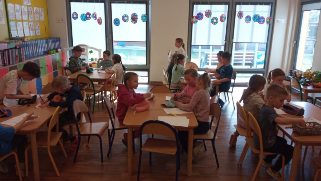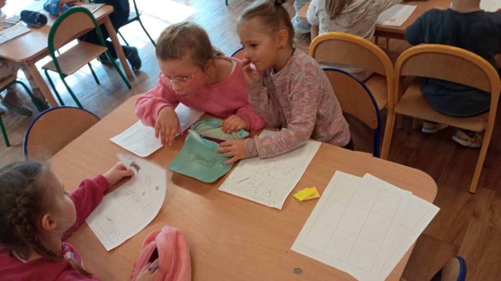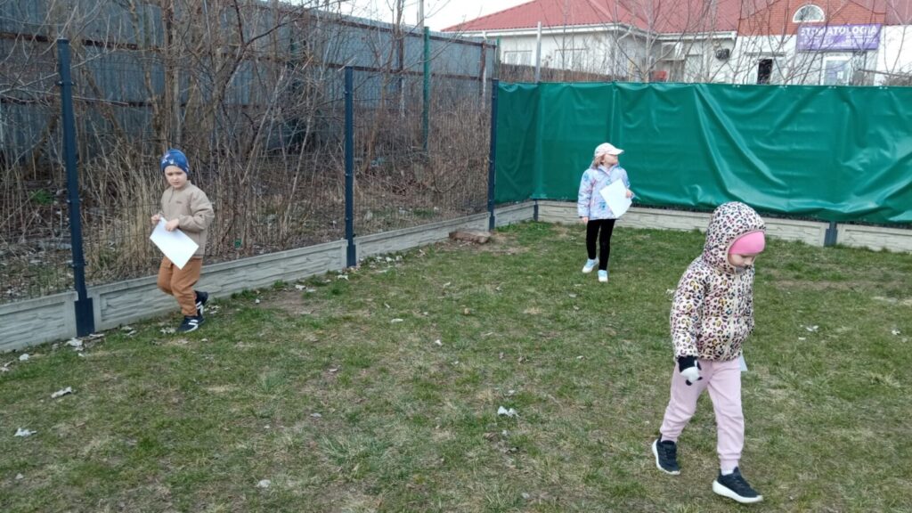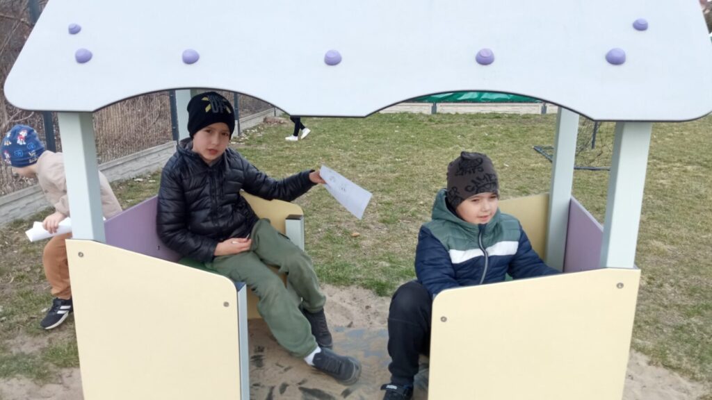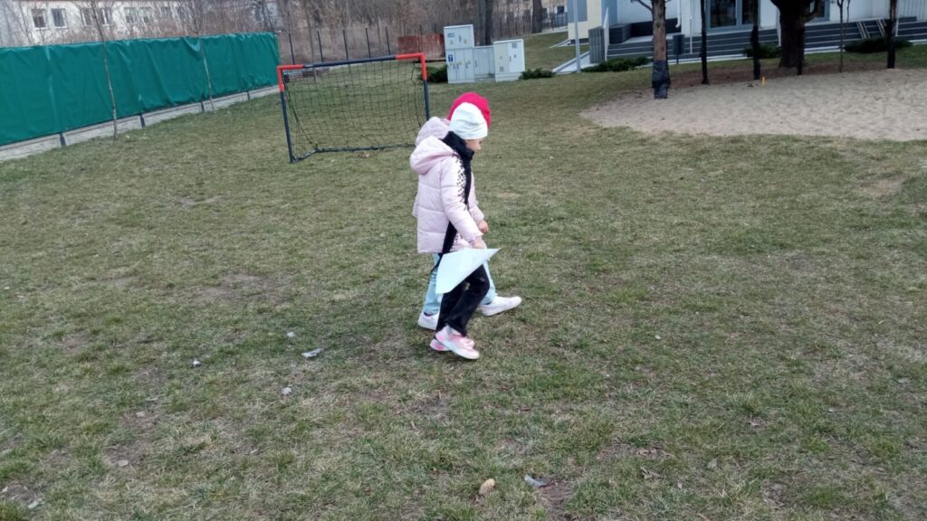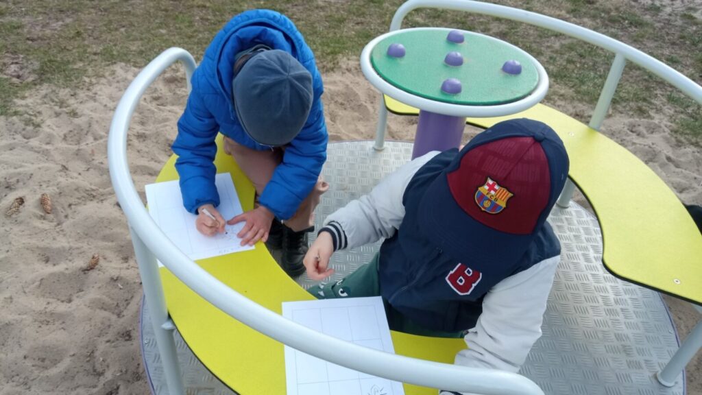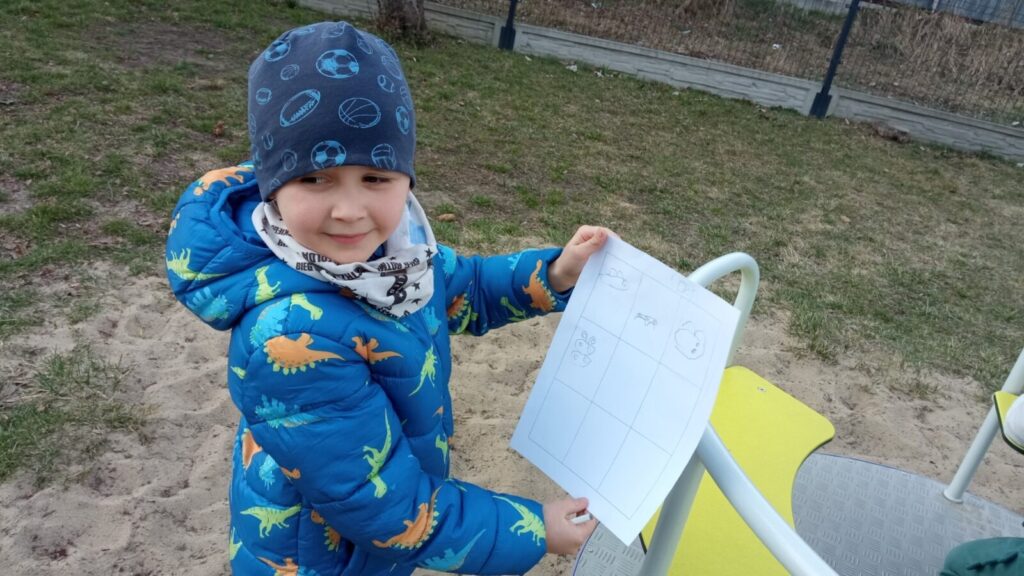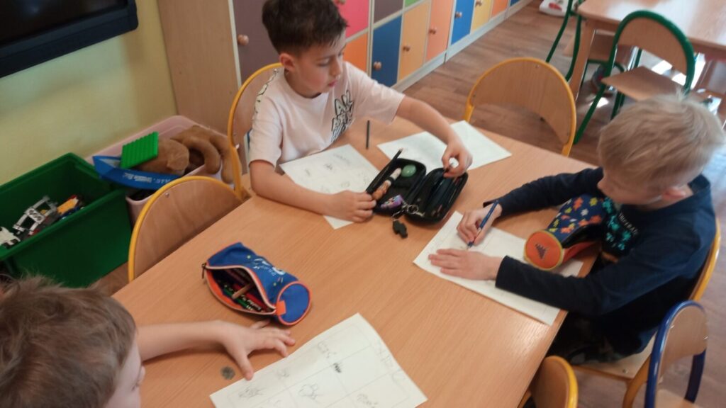 Dzieci podczas wyjścia do ogrodu obserwowały owady oraz notowały swoje spostrzeżenia na kartce.