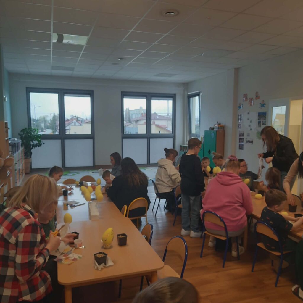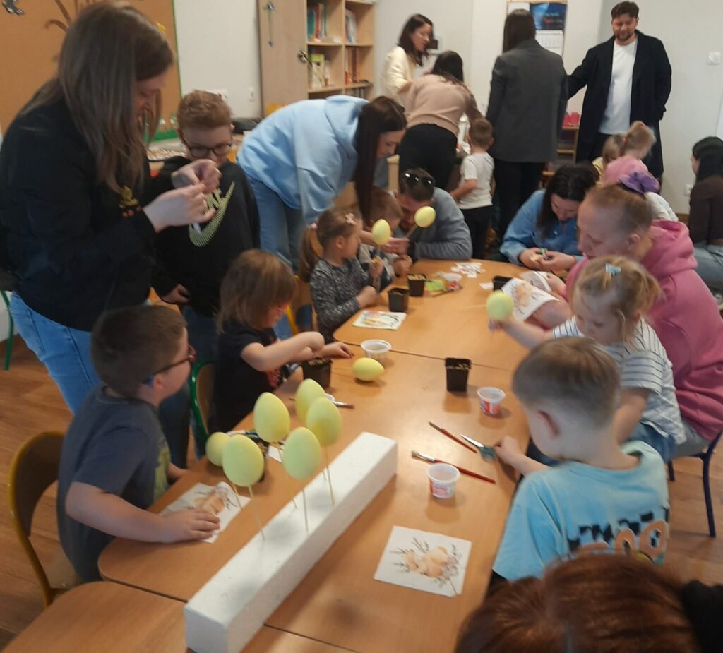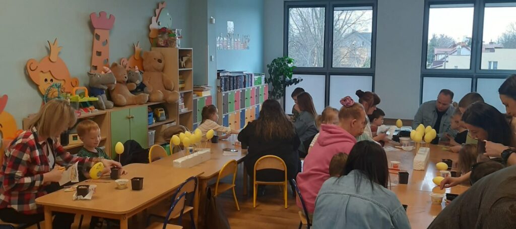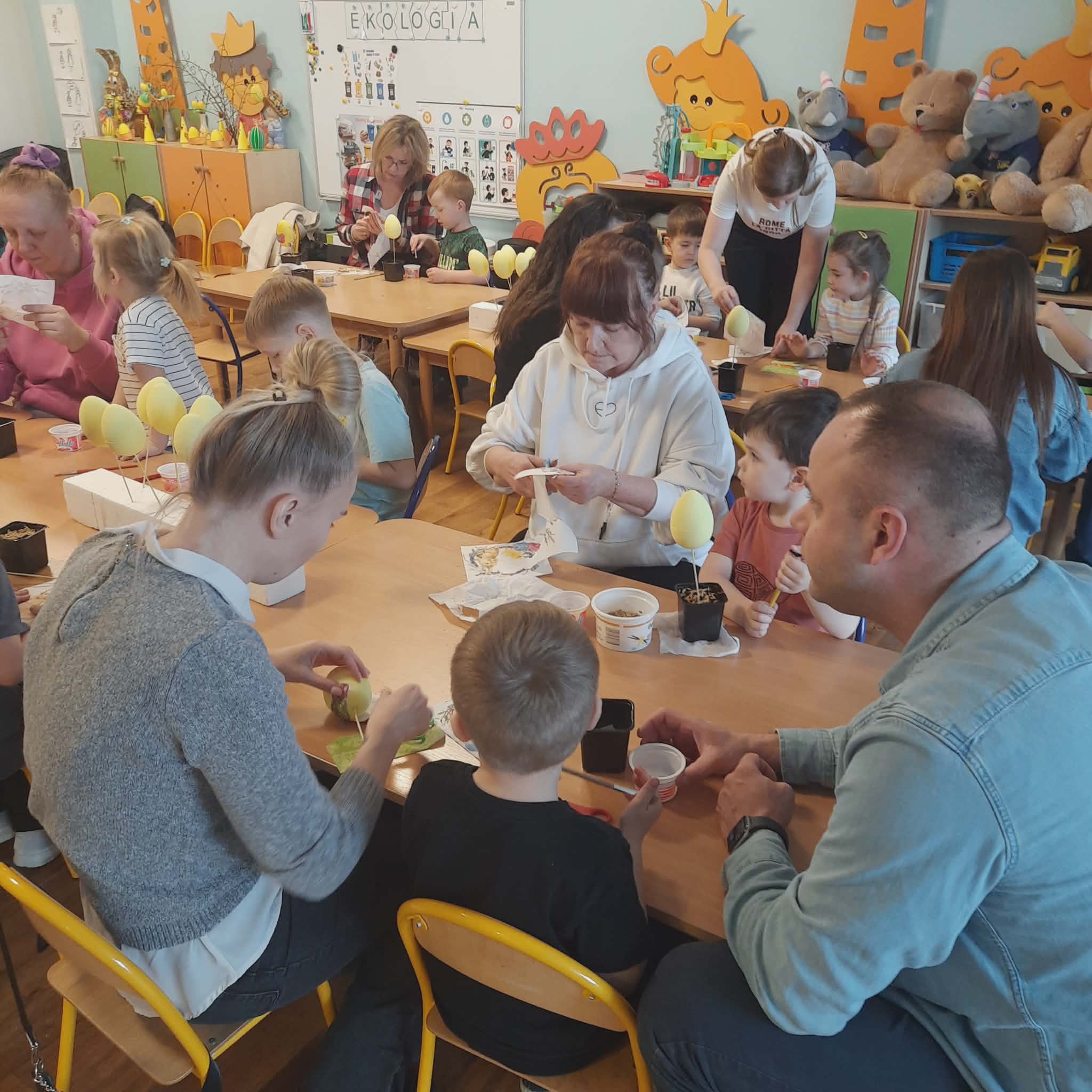 WARSZTATY WIELKANOCNE Z RODZICAMI 3 kwietnia 2026 przez przedszkole Galeria zdjęć przedstawia dzieci i rodziców podczas warsztatów wielkanocnych.