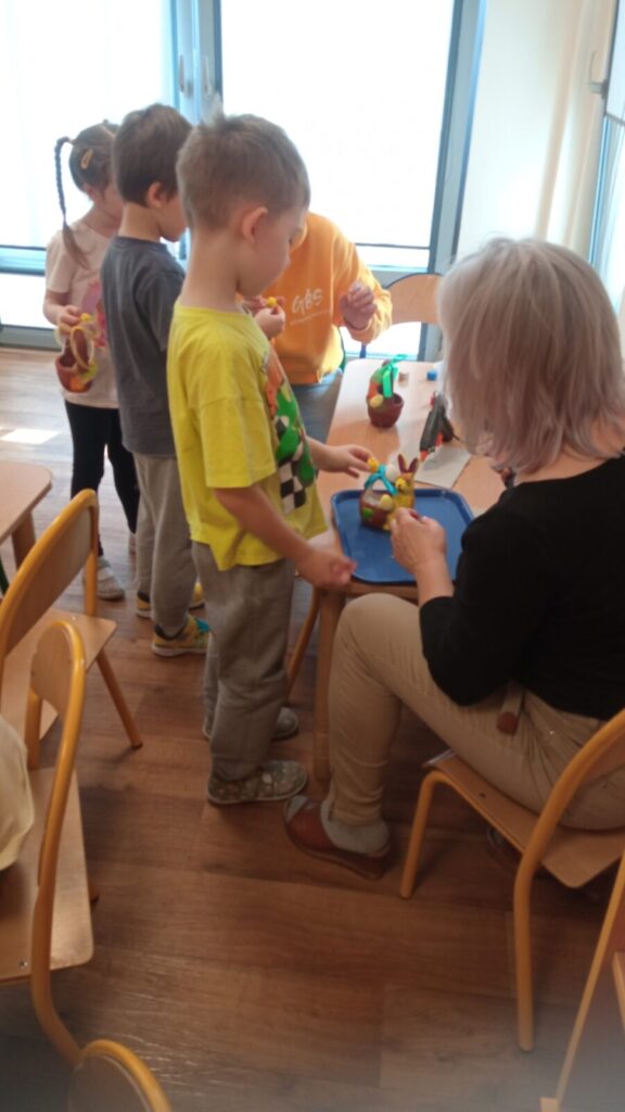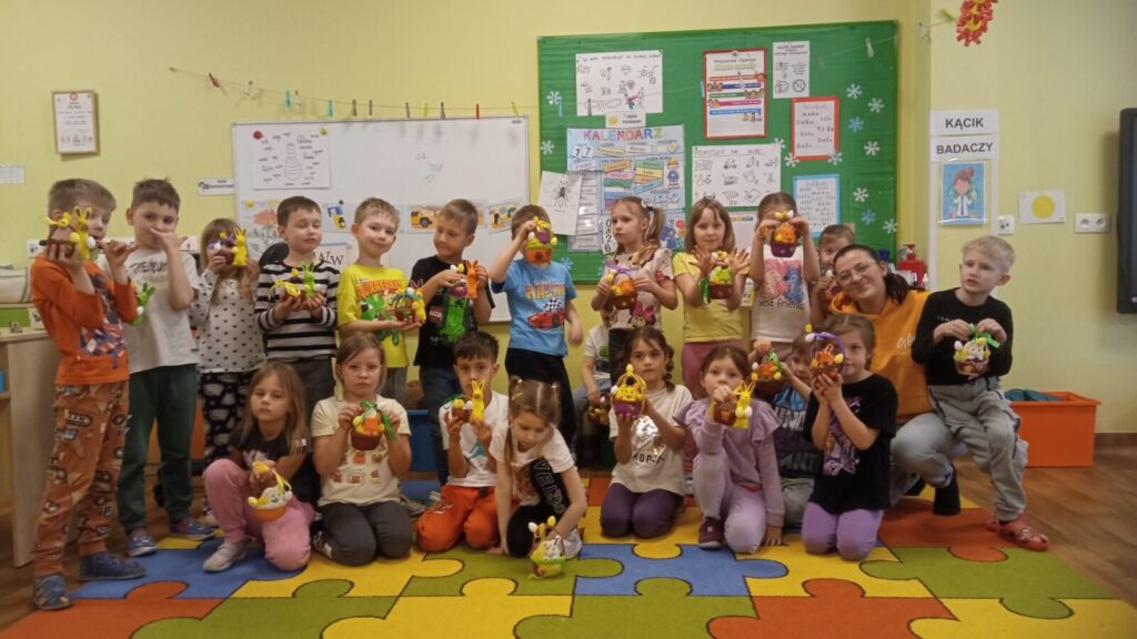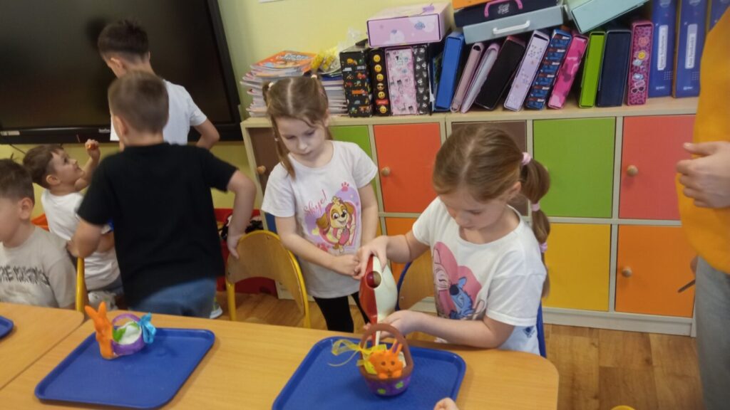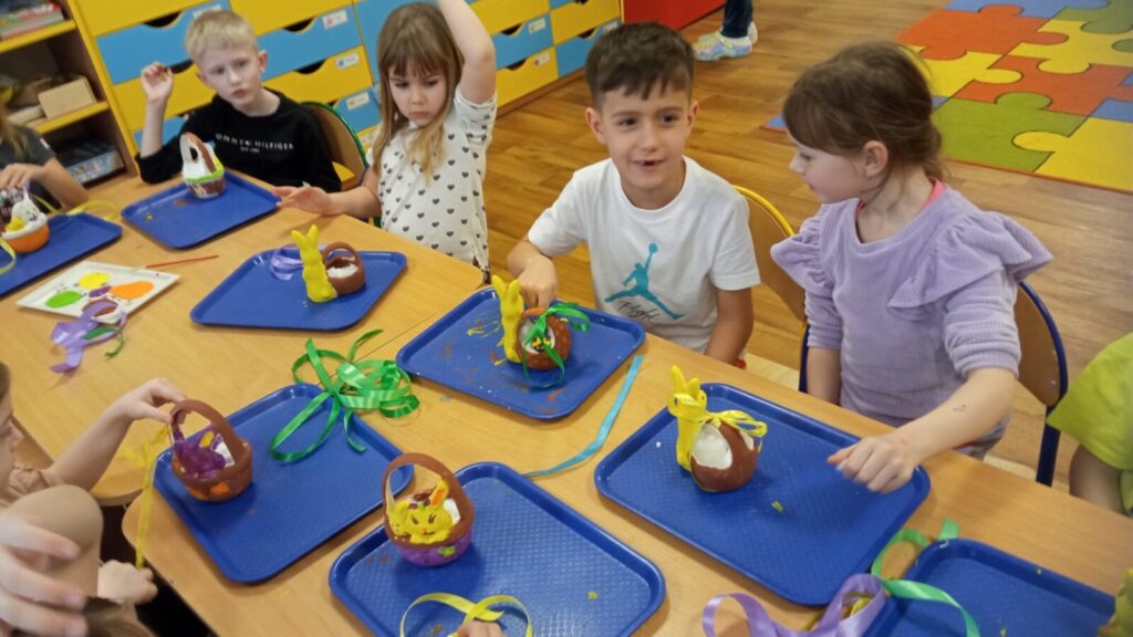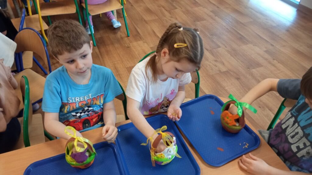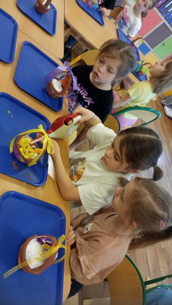 Podczas warsztatów dzieci przygotowały koszyczki- pomalowały gliniane naczynie, pięknie je ozdobiły wstążeczką jajeczkami oraz kurczaczkiem. Na koniec zasiały w nim owies . Pielęgnowały i obserwowały w późniejszym czasie wzrost i potrzeby zboża. Dziękujemy P. Ani, mamie Zosi za zorganizowanie materiałów oraz przeprowadzenie interesującego i ciekawego zajęcia.