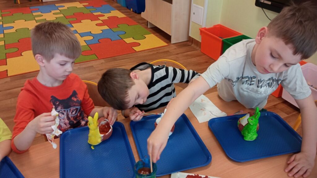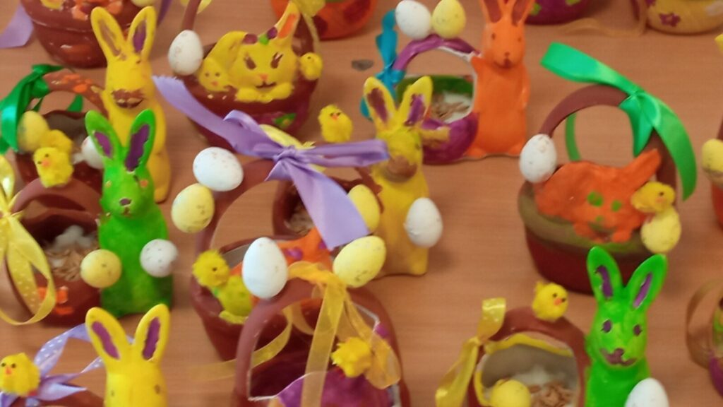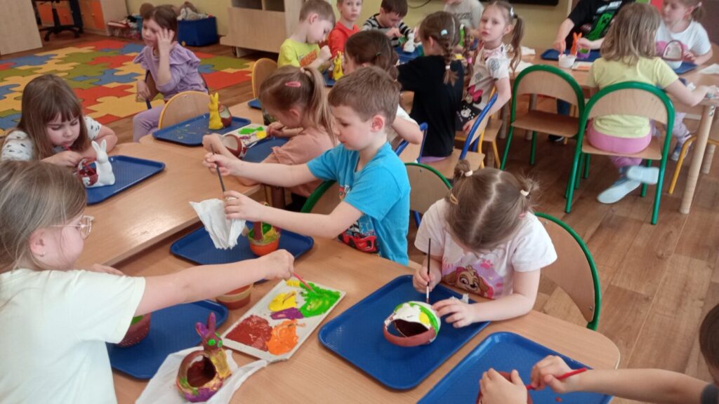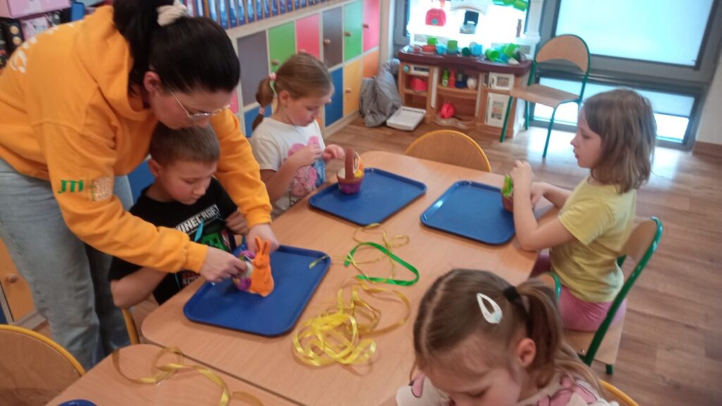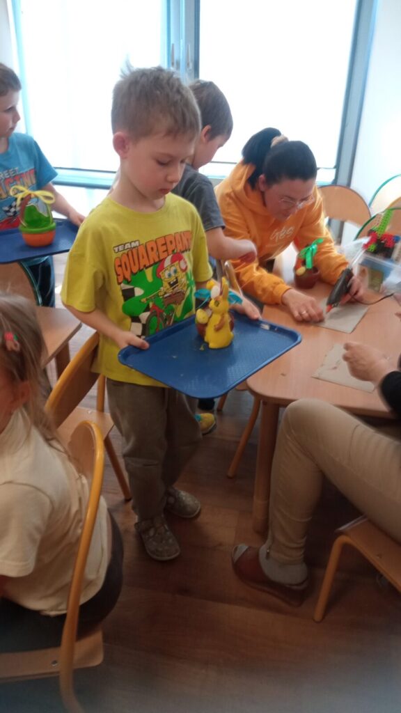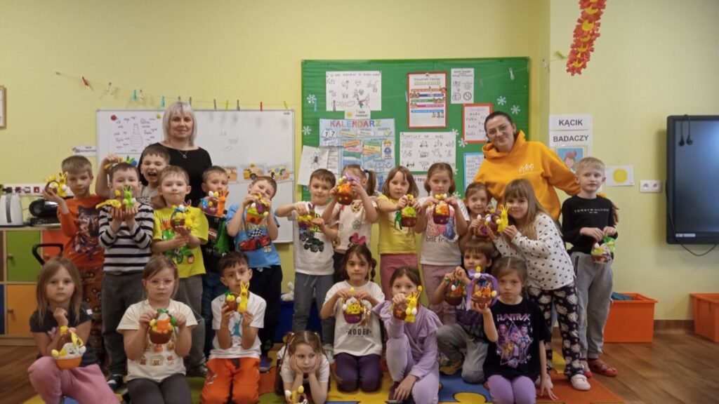 Podczas warsztatów dzieci przygotowały koszyczki- pomalowały gliniane naczynie, pięknie je ozdobiły wstążeczką jajeczkami oraz kurczaczkiem. Na koniec zasiały w nim owies . Pielęgnowały i obserwowały w późniejszym czasie wzrost i potrzeby zboża. Dziękujemy P. Ani, mamie Zosi za zorganizowanie materiałów oraz przeprowadzenie interesującego i ciekawego zajęcia.
