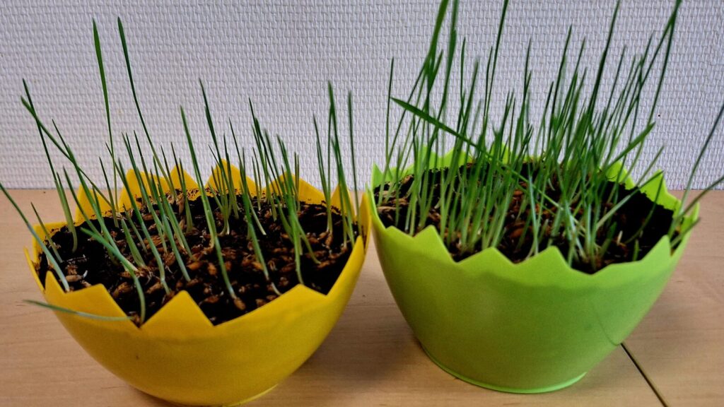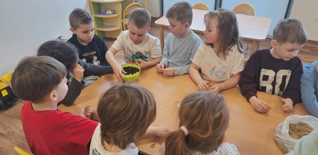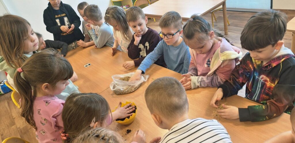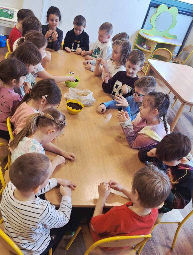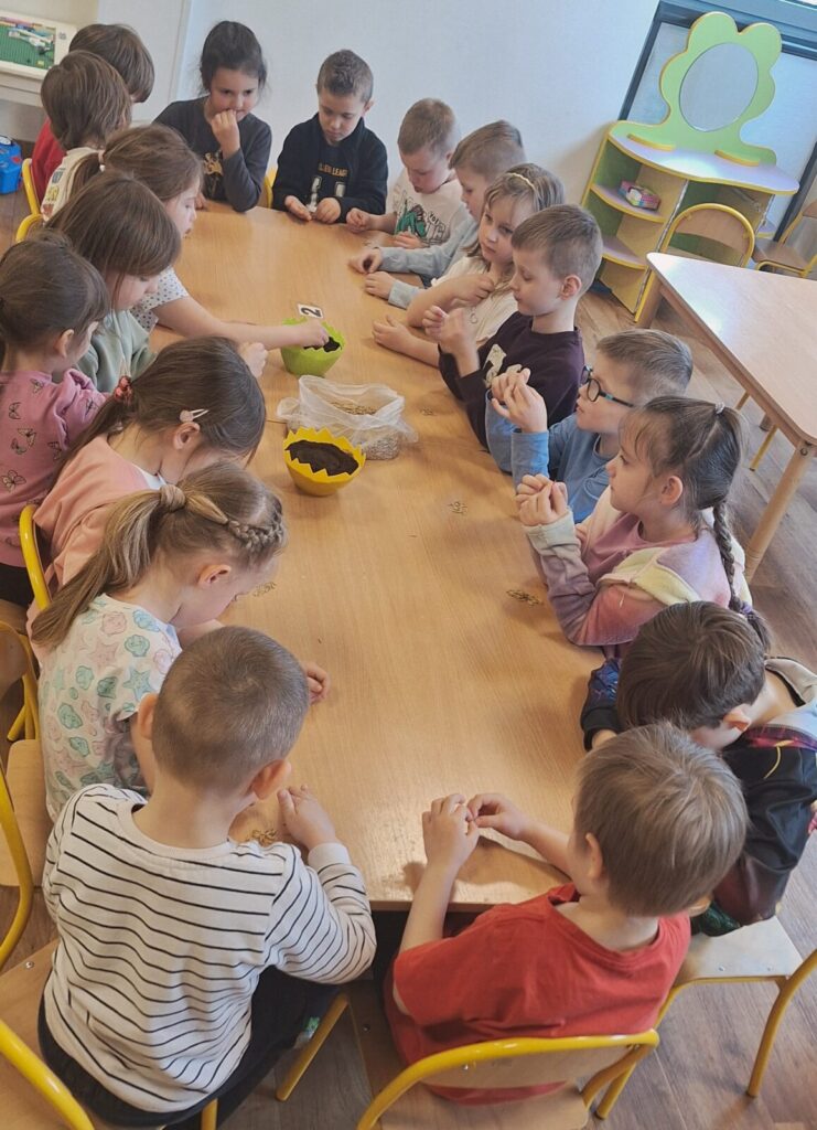 Galeria zdjęć przedstawia dzieci podczas wiosennych zajęć ogrodniczych- sianiu owsa. To świetny sposób na obserwację wzrostu rośliny.