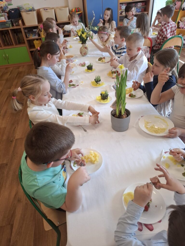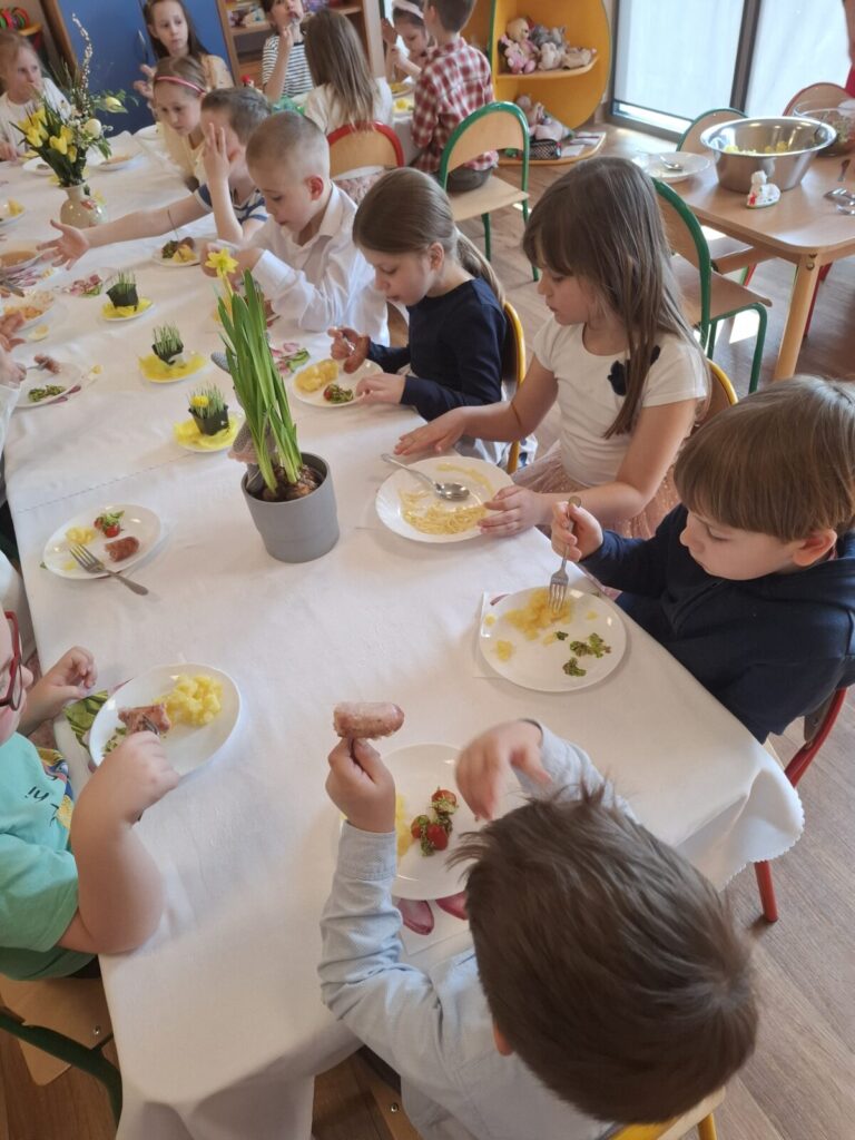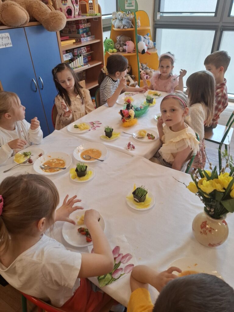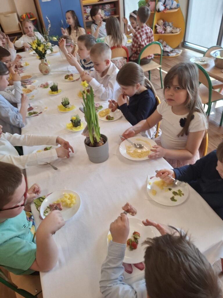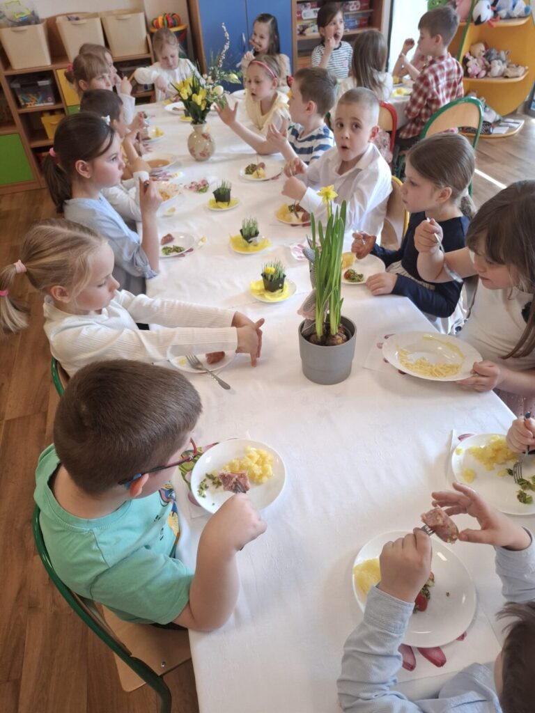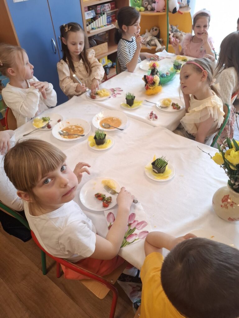 Uroczysty obiad wielkanocny 27 kwietnia 2026 przez przedszkole Galeria zdjęć przedstawia dzieci podczas obiadu wielkanocnego.