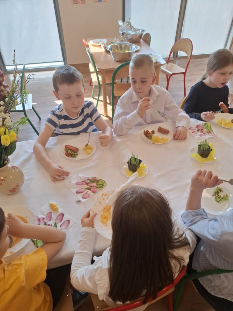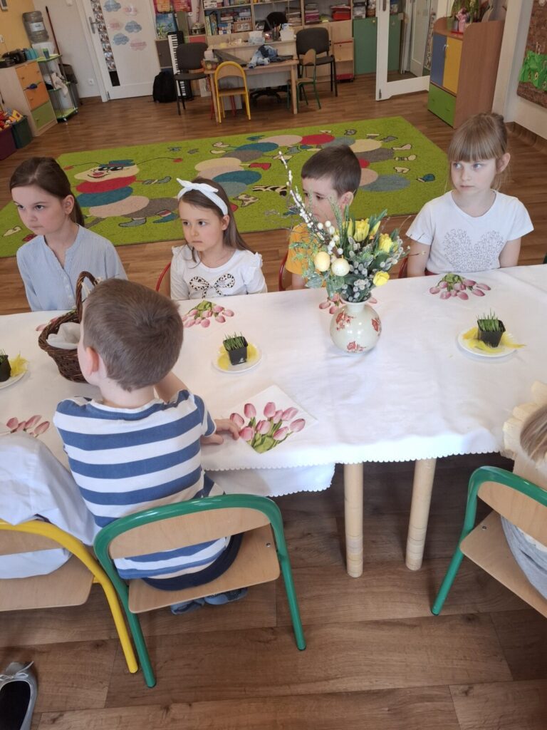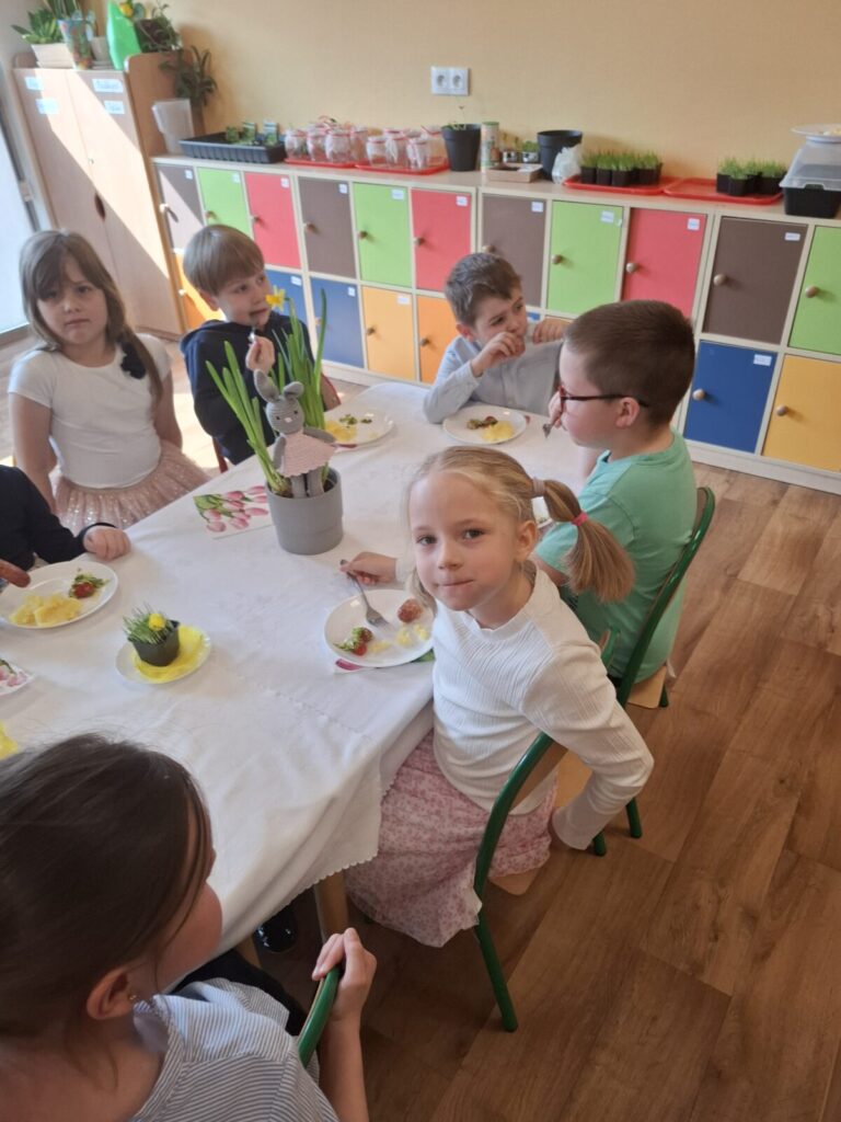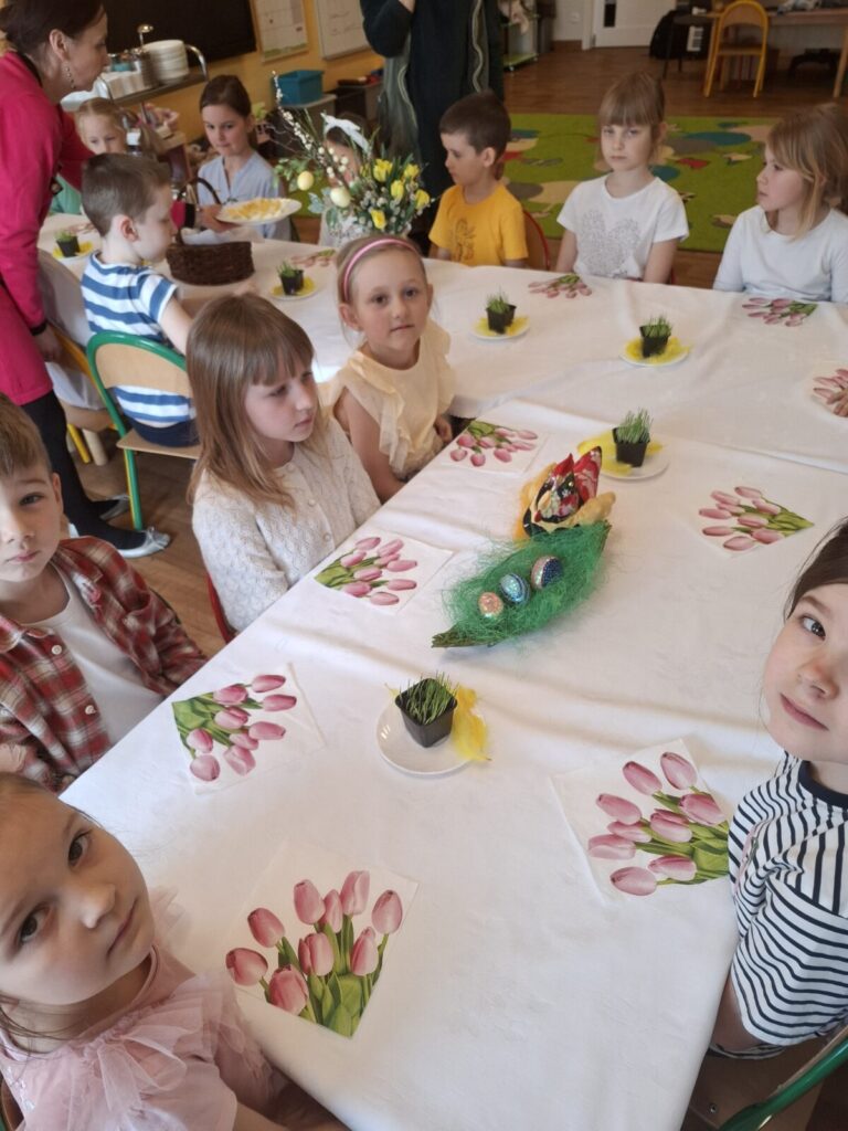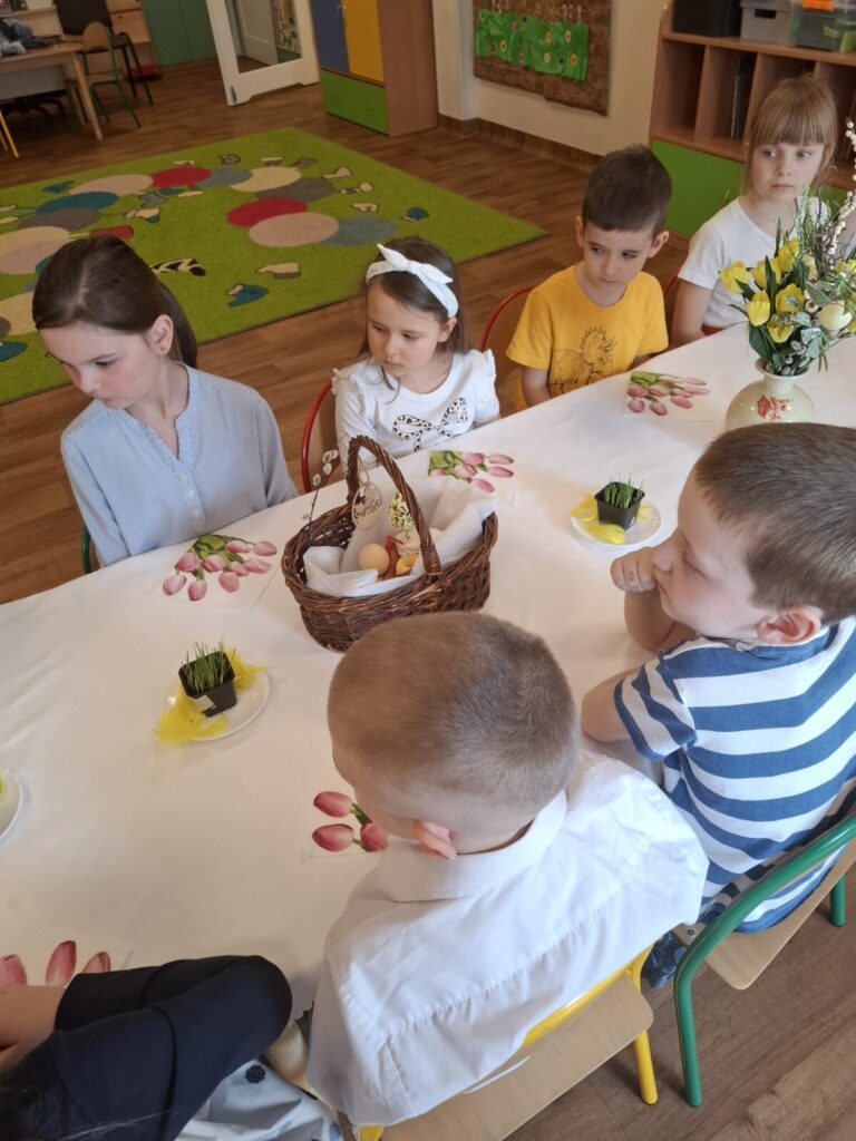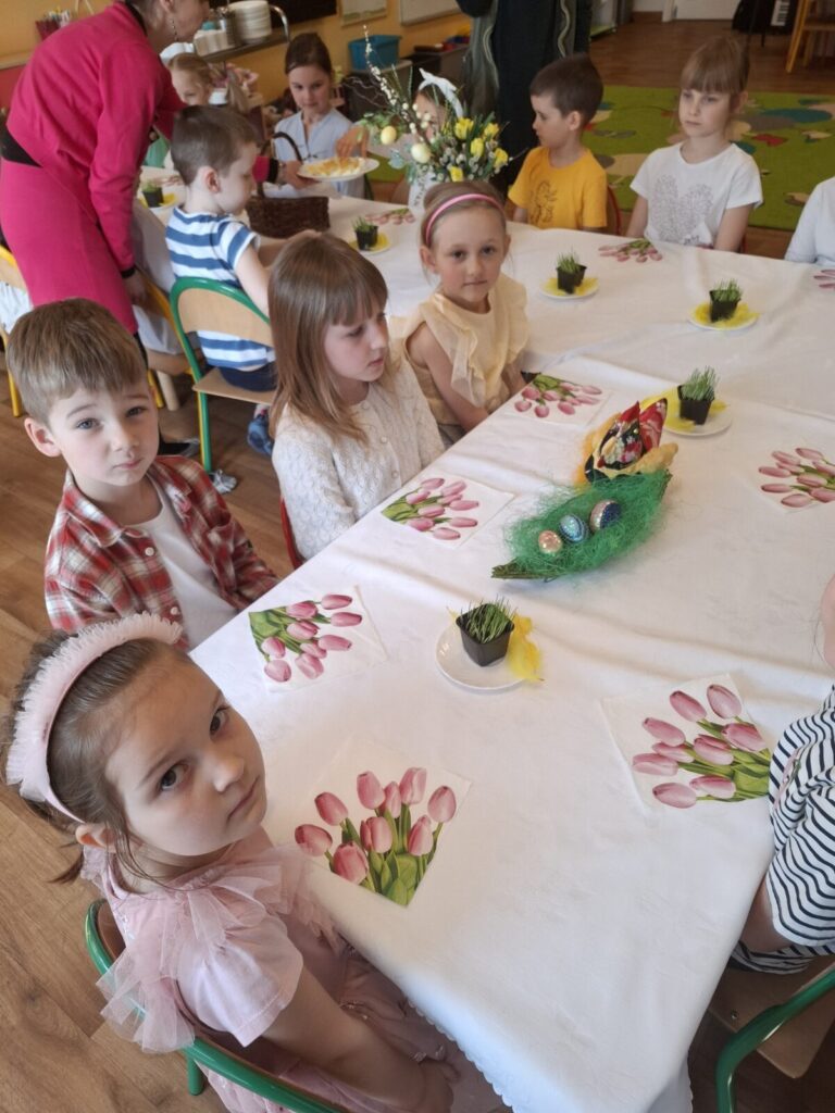 Uroczysty obiad wielkanocny 27 kwietnia 2026 przez przedszkole Galeria zdjęć przedstawia dzieci podczas obiadu wielkanocnego.