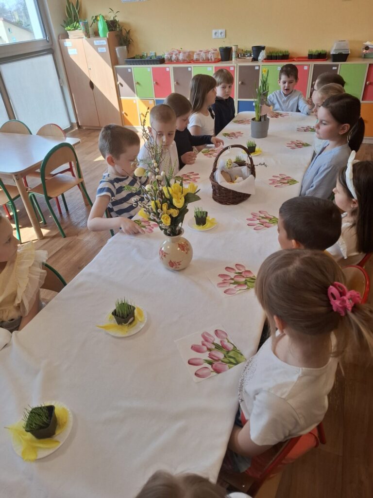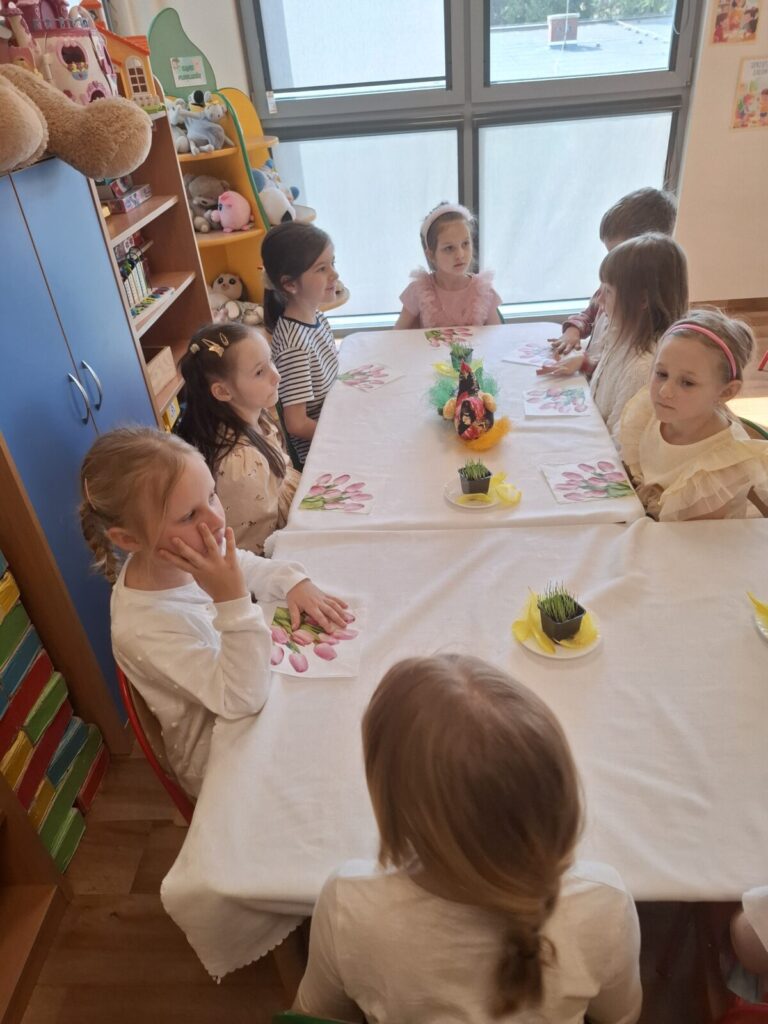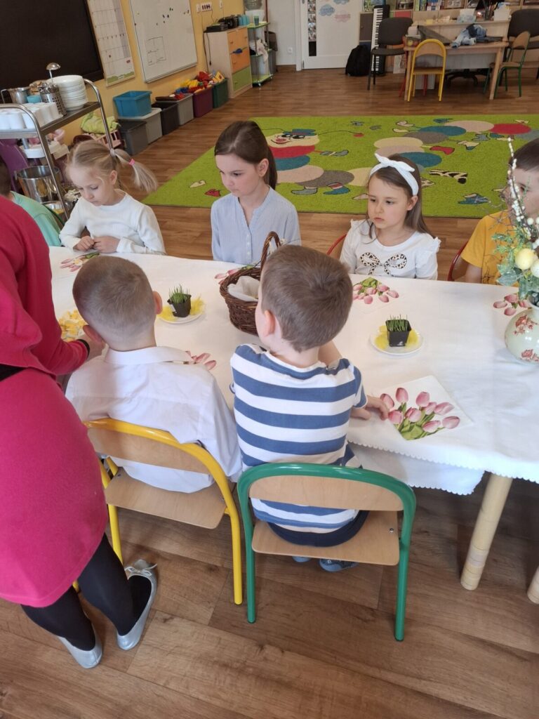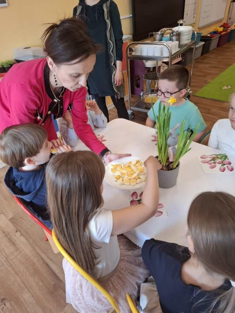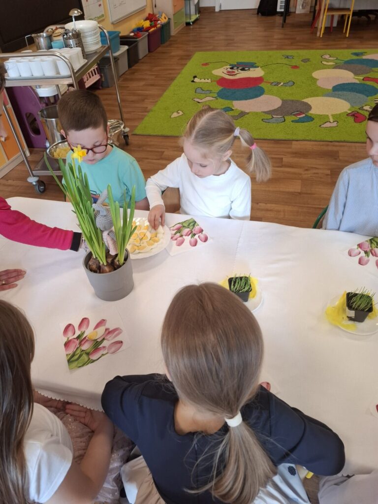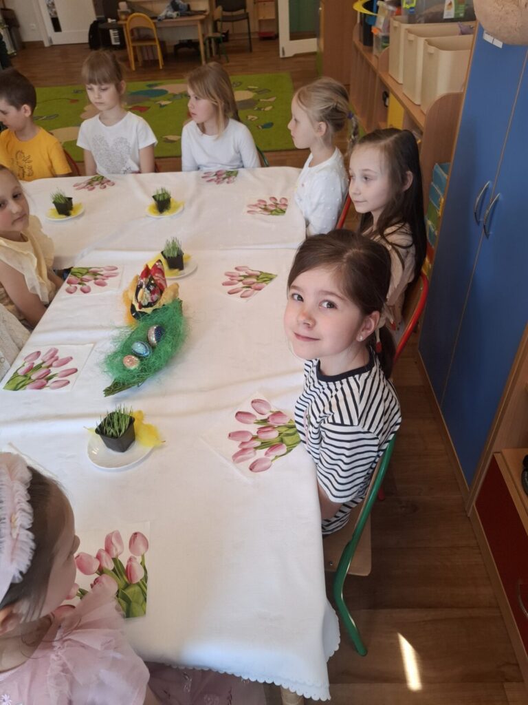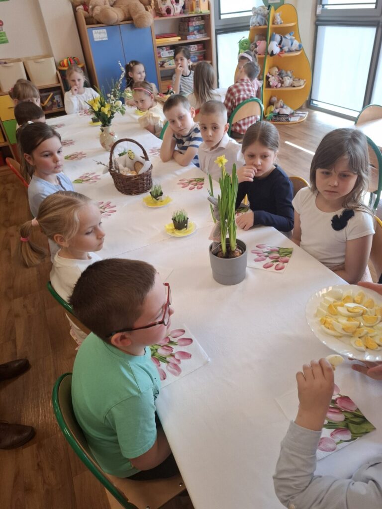 Uroczysty obiad wielkanocny 27 kwietnia 2026 przez przedszkole Galeria zdjęć przedstawia dzieci podczas obiadu wielkanocnego.