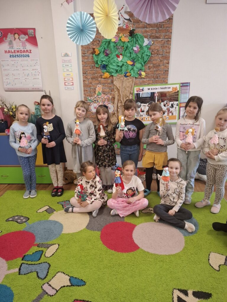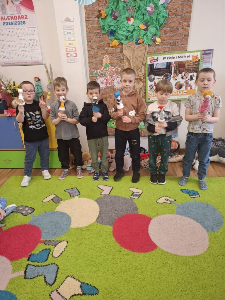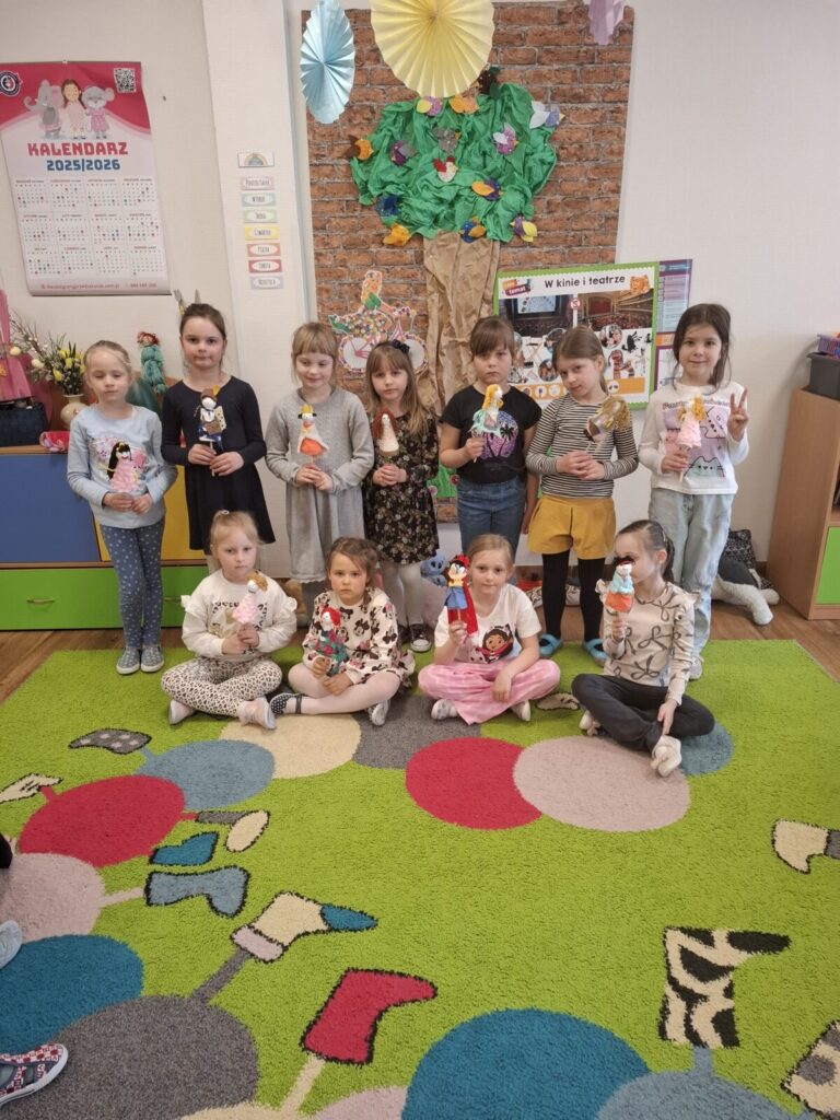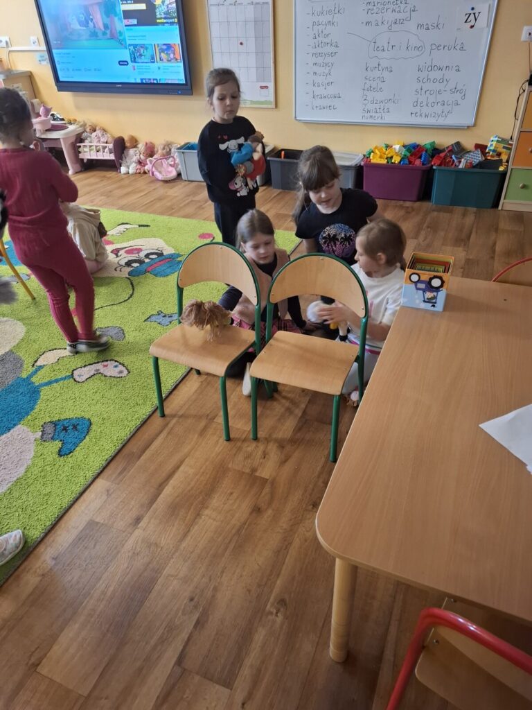 Zabawa w teatr. 27 kwietnia 2026 przez przedszkole Galeria zdjęć przedstawia przedstawia przedszkolaki biorące udział w cyklu zajęć o filmie i teatrze.