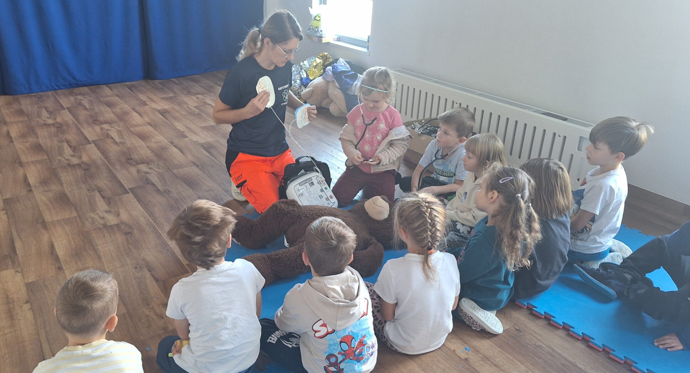Na zajęciach przedszkolaki dowiedziały się do czego służy defibrylator, jak wygląda pozycja boczna ustalona oraz miały okazję posłuchać bicia serca.