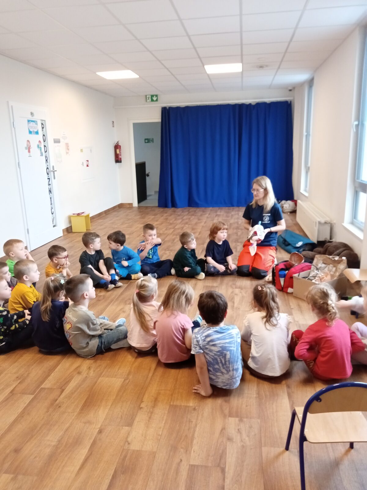 Galeria zdjęć przedstawia przedszkolaki podczas warsztatów z udzielania pierwszej pomocy z ratownikiem medycznym.