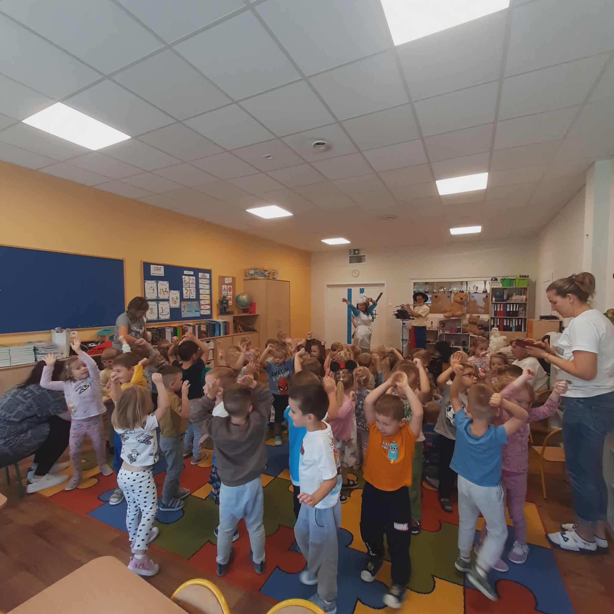 Galeria zdjęć przedstawia dzieci podczas uczestniczenia w bajkowym koncercie muzycznym.