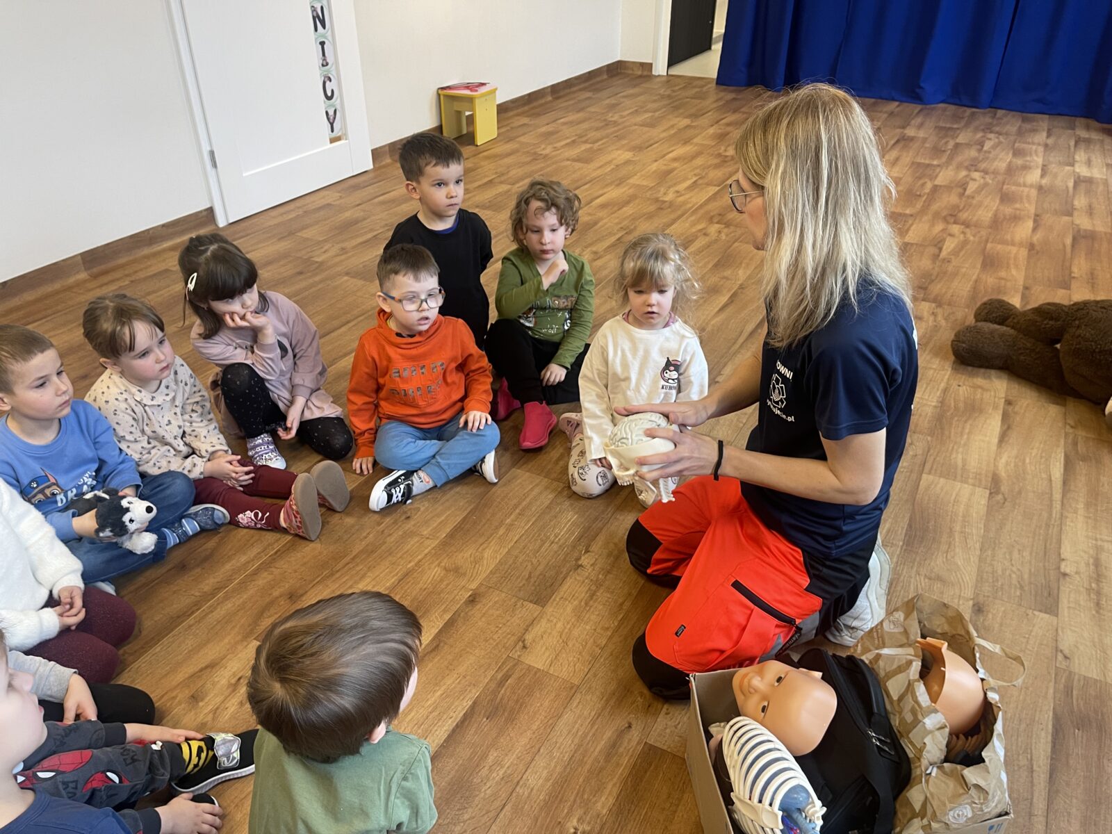 Galeria zdjęć przedstawia dzieci podczas zajęć z ratownikiem medycznym.